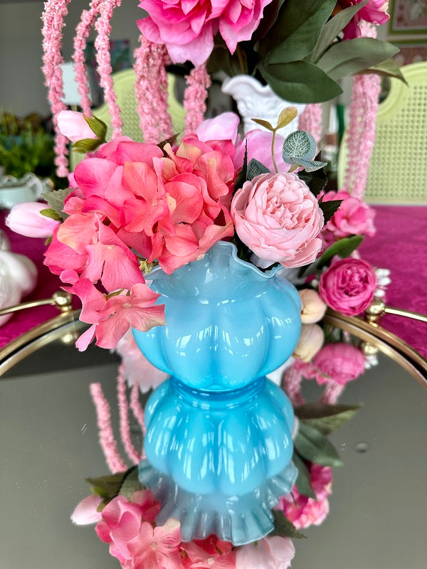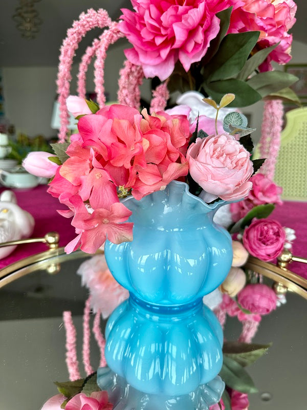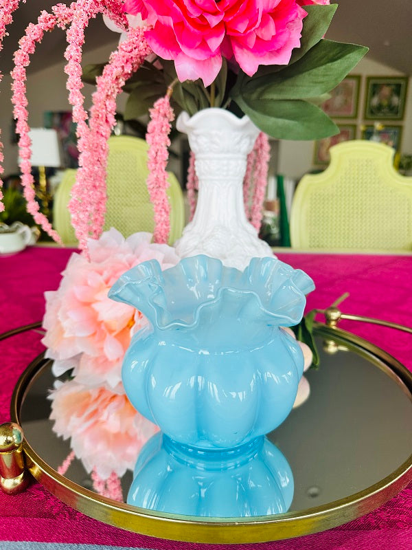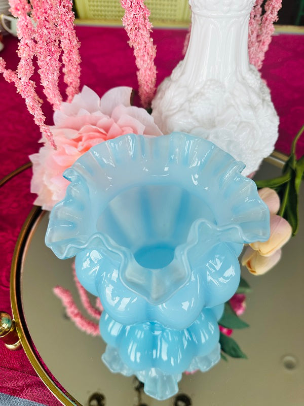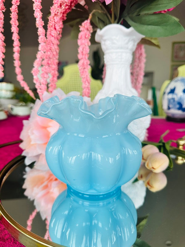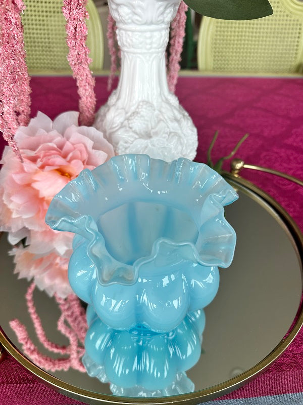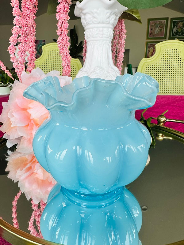 Fenton Glass Vase Blue Overlay Melon Shaped, Double Crimped Ruffle Edge 1940s