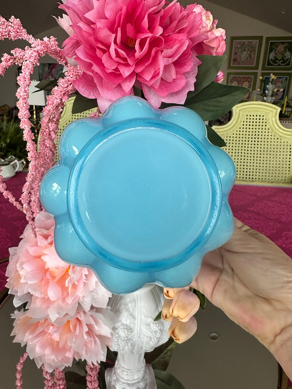 This stunning blue glass Fenton dish has that iconic ruffled edge and melon shape. A great little bowl to add to your bar cart. Serve bar fruit, salty peanuts or a sweet treat to your guests. Pop in a few flowers for a beautiful arrangement. Use to store cotton balls or hair ties on your vanity. Great vintage condition. No chips or cracks.