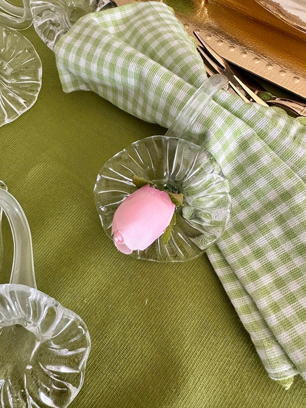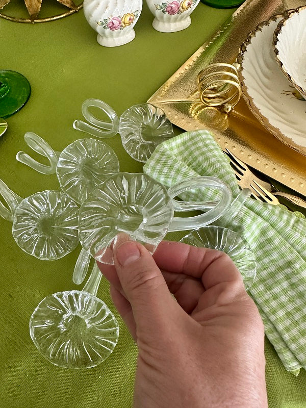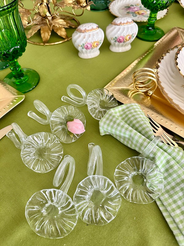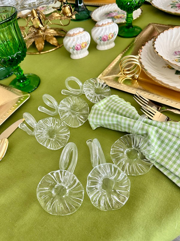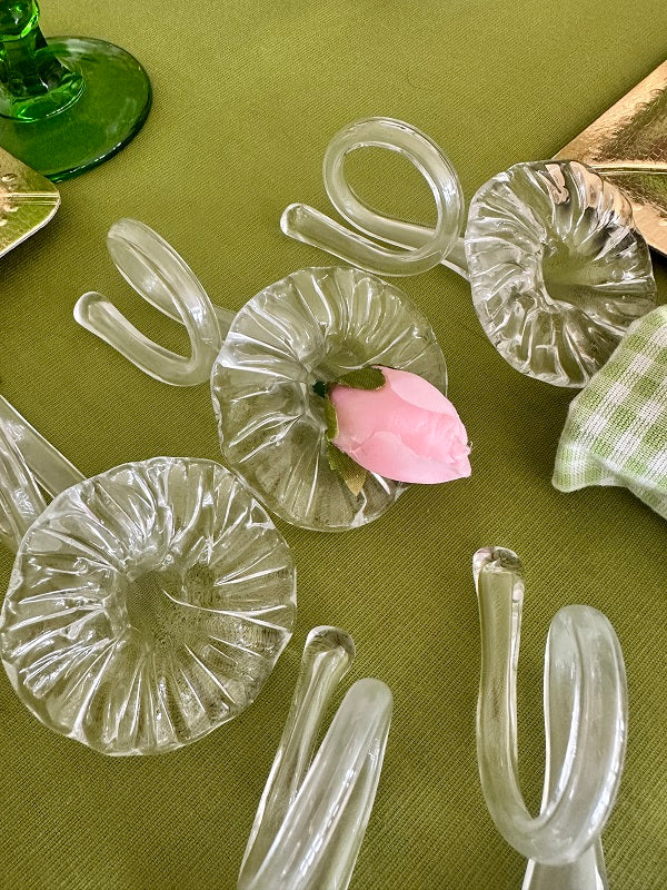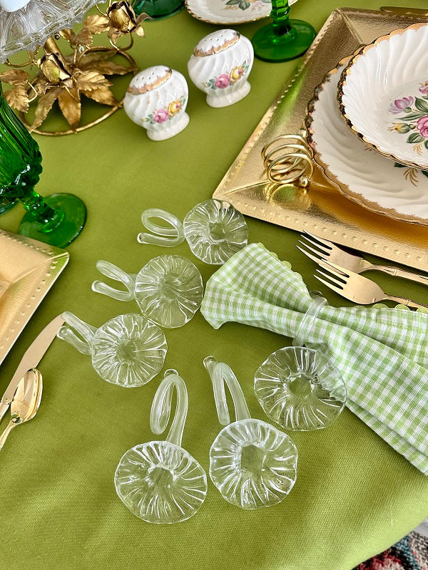 What a unique way to add fresh flowers to your tablescape. These gorgeous glass napkin rings are in the shape of a lily flower. You can add a little water and a fresh bloom to each one for a dressed up look. Perfect for your Easter dinner or Spring celebrations, Great vintage condition.