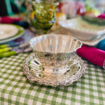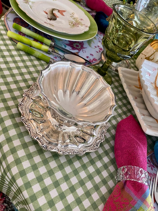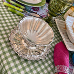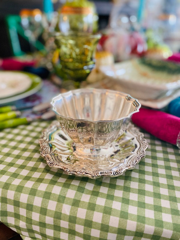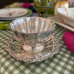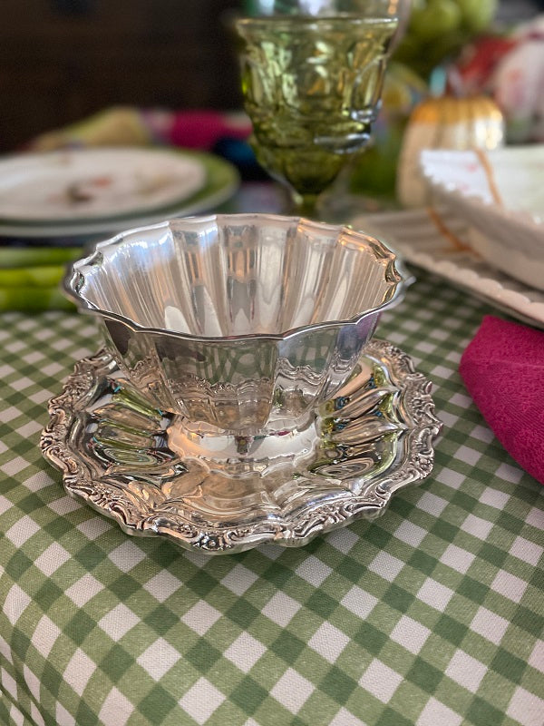 Pass the nuts! or sauce! This sweet silverplate bowl with attached underplate is perfect for salty nuts or fruit on a bar cart. It's a great size for serving relishes or sauce as well. It has a gorgeous scalloped edge and scrollwork on the rim of the plate. Can't you see this filled with jelly or jam for a fancy brunch.