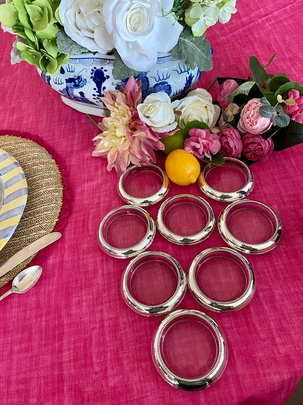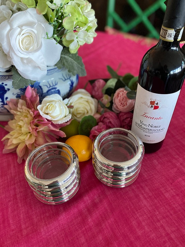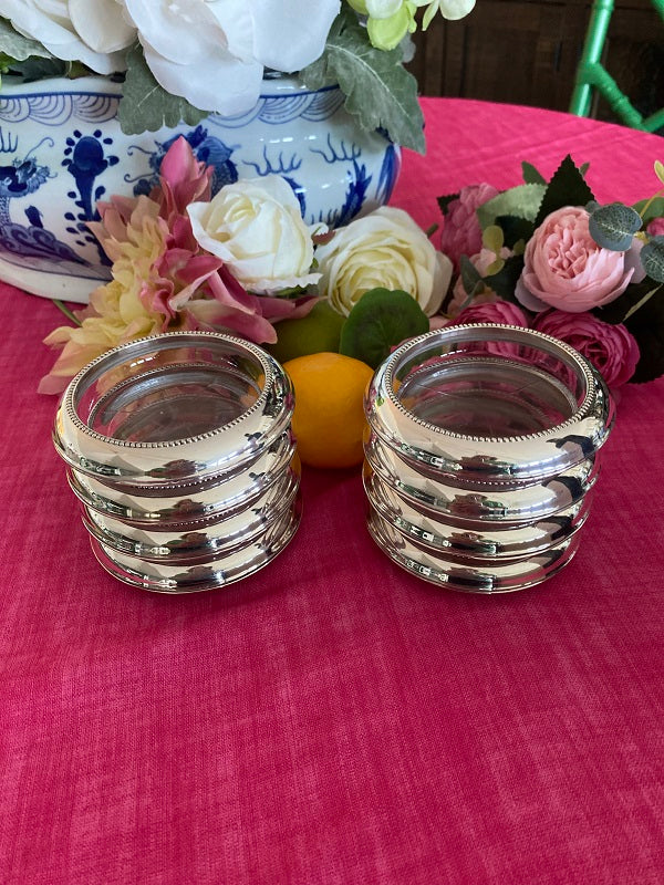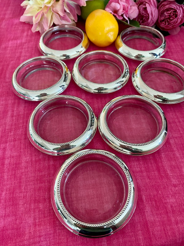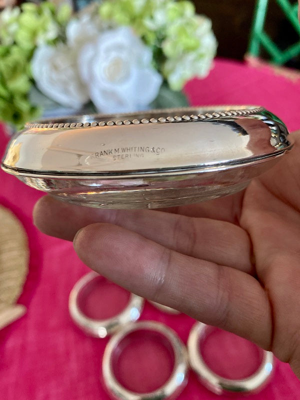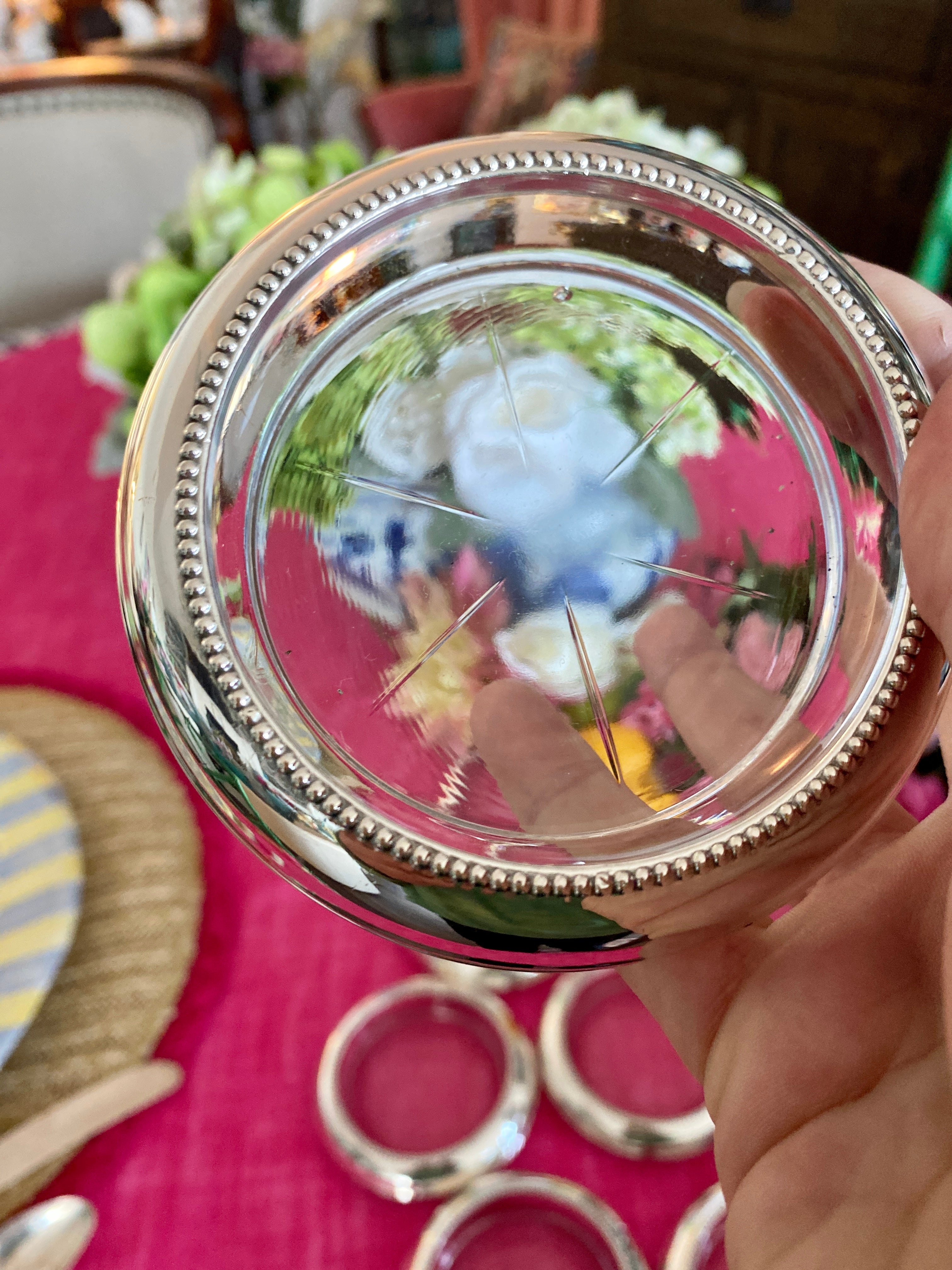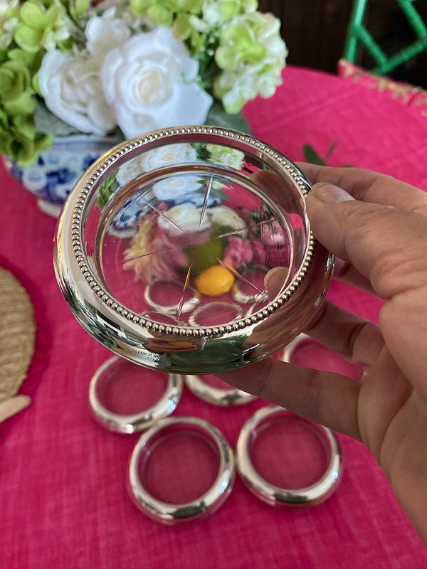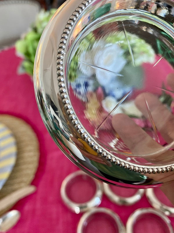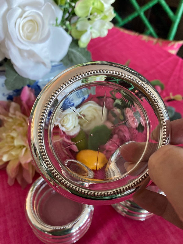 These vintage silver and crystal coasters were a staple in my home growing p. They are great to use under cold drinks to protect furniture. The work well as ashtrays, and as trinket dishes for your rings by the sink when you are cooking or on your nightstand for the jewelry you take off before bed. These beauties have a simple line pattern center and sterling silver edge. They make a great hostess gift, too.