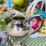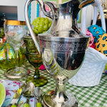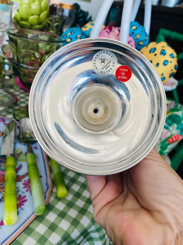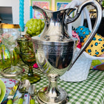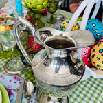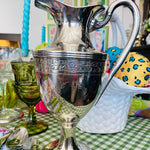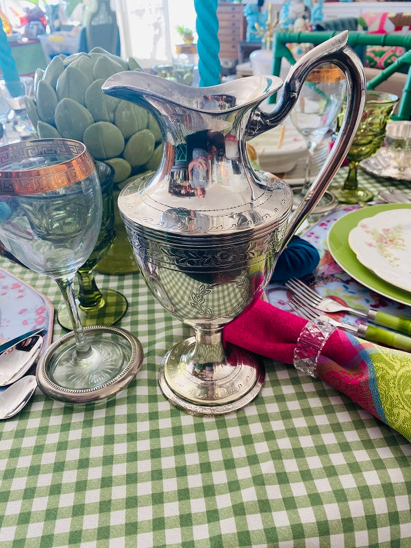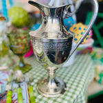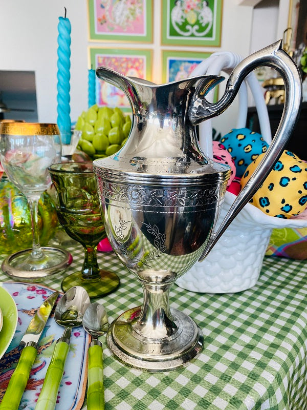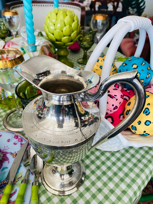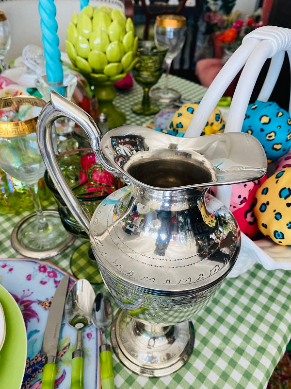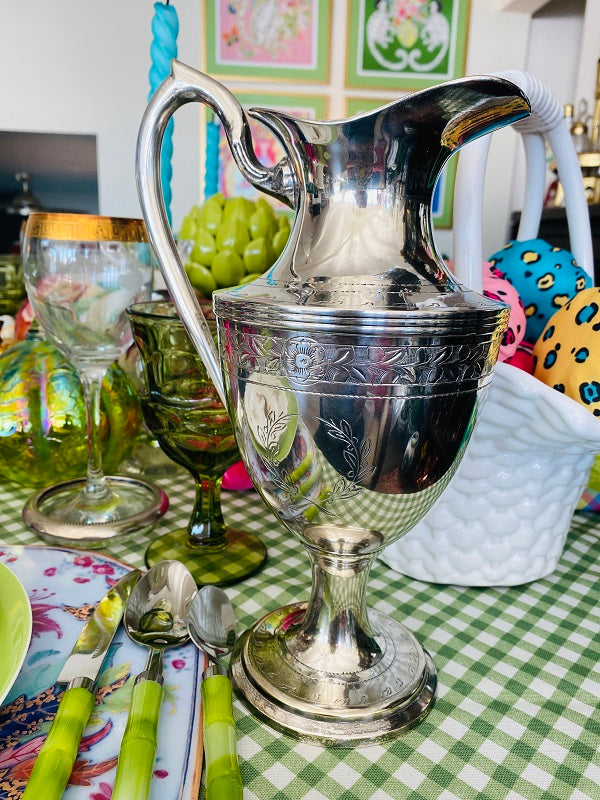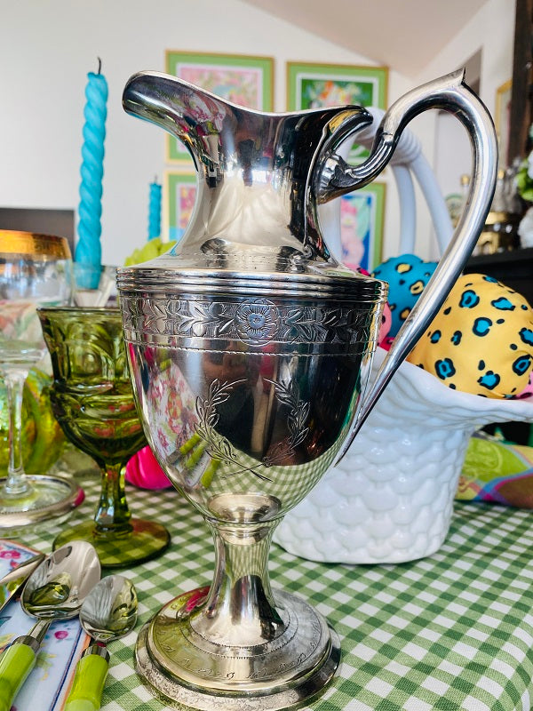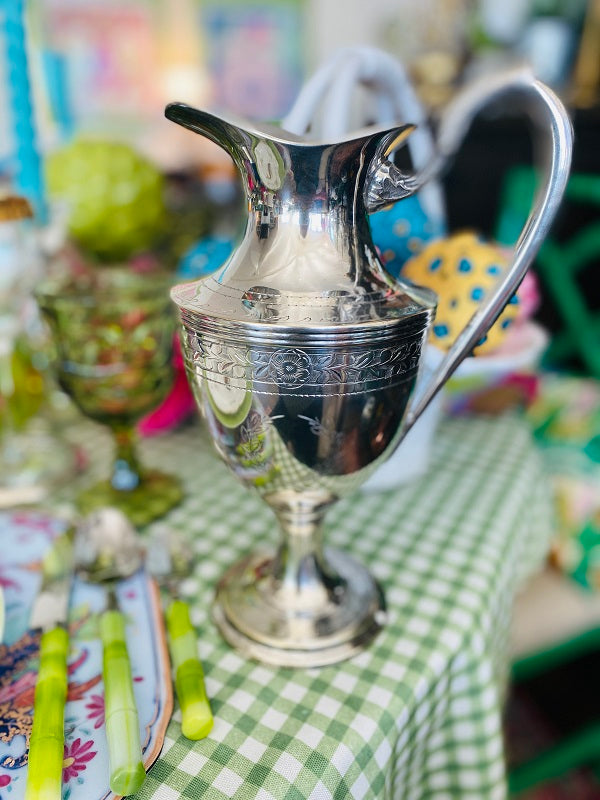 Look at the gorgeous shape of this pitcher! Not only is her figure beautiful, but she has a flower and vine etched detail around the body and base. There's also a vine circle medallion etched in the center that is a perfect spot for a monogram. The ear shaped handle adds extra detail. The International Silver Company was formed by over a dozen other silver companies starting in 1898. Most of the companies were from New England but others from New York and even Canada joined. In the 1930s the company started the Silver Theater, a radio program in Hollywood. Famous actresses from that era, including Judy Garland, Dinah Shore, Joan Crawford and Ginger Rogers endorsed their products. Fantastic vintage condition and ready to adorn your dining table.