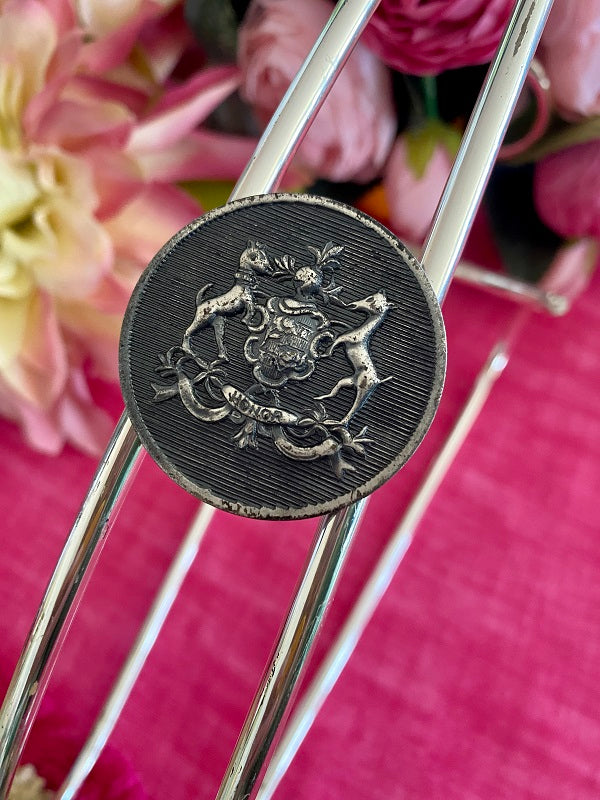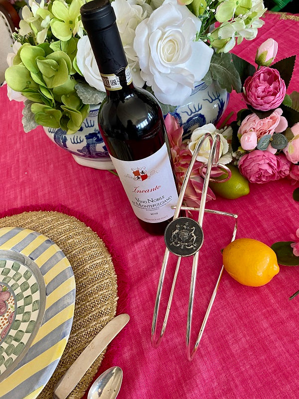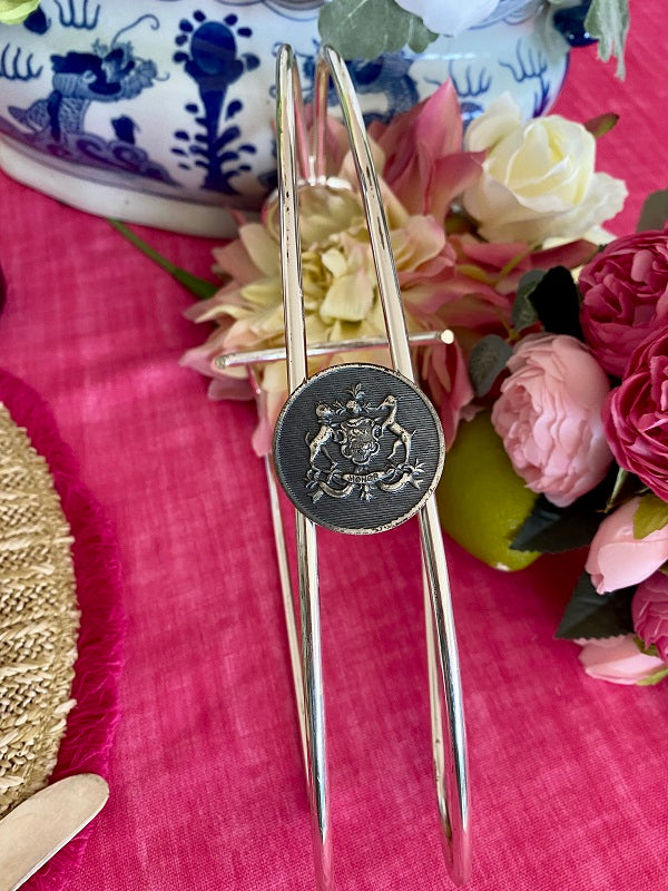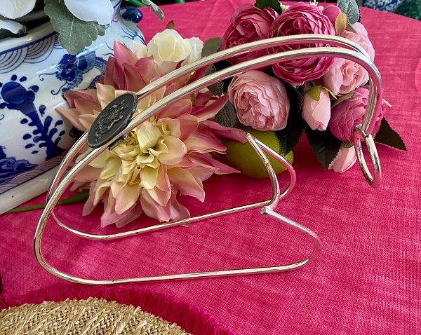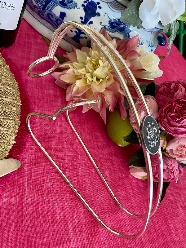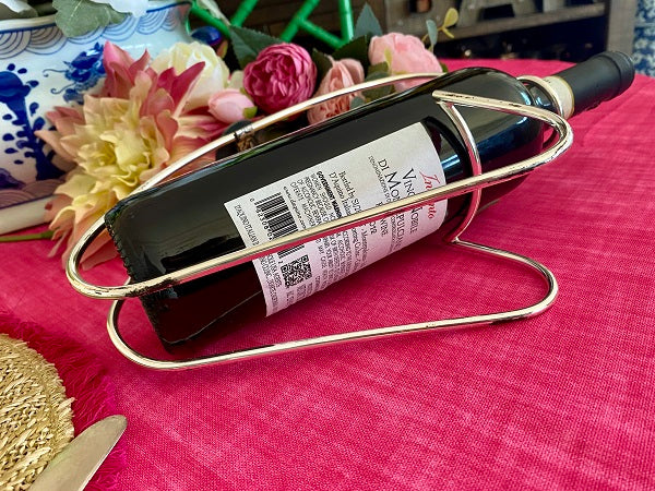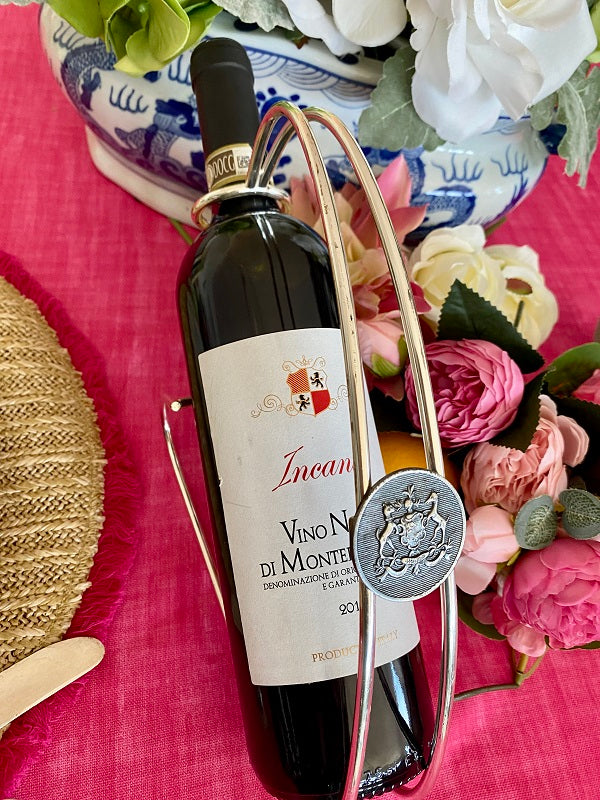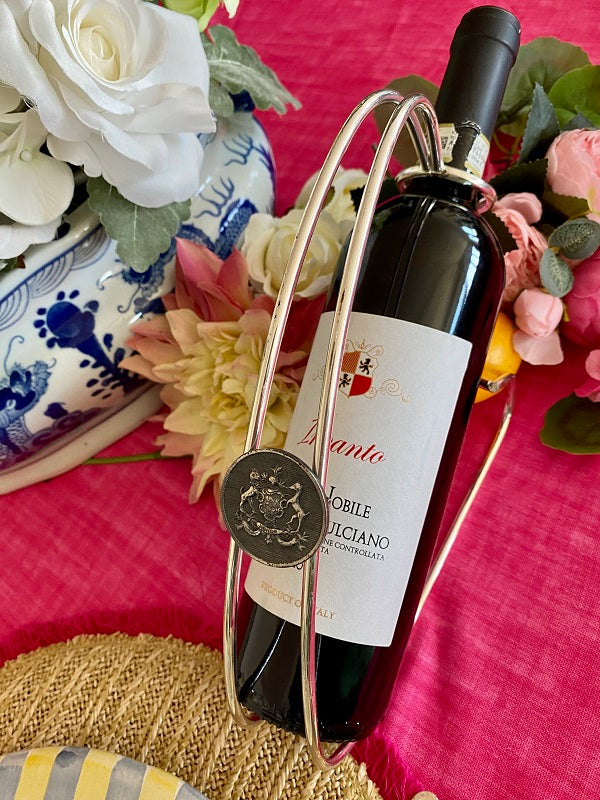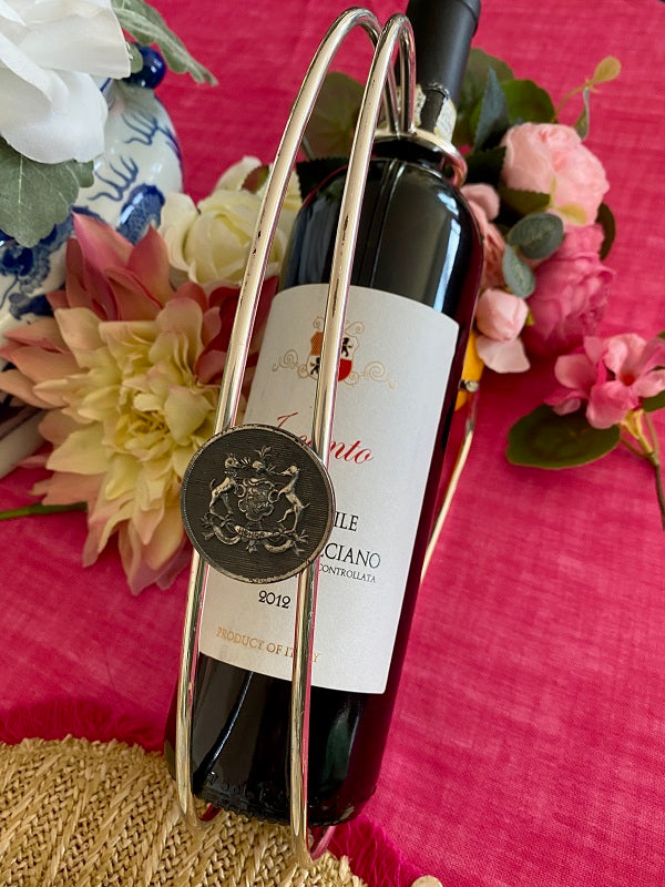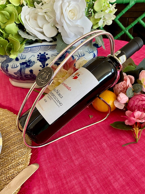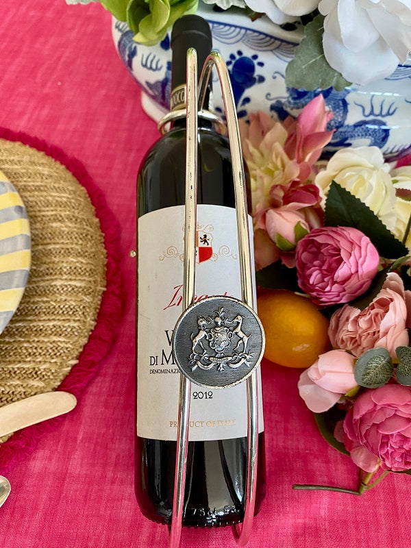 Display your wine bottle in style with this great looking silverplate wine caddy.Detailed with a crest seal that represents "honor". Holds an open bottle beautifully on your dining table. Grab a nice bottle of wine, wine glasses and this caddy for the perfect gift.