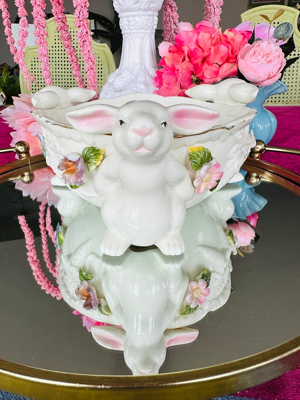 Need the perfect bowl for an Easter centerpiece. This white porcelain bunny bowl is perfect for your favorite florals. 3 bunnies surround the outside of the bowl. Capodimonte flowers add just a touch of color along with the pink bunny ears. Embossed carrots are in between each bunny. The gold rim has some slight paint wear. Otherwise great vintage condition.