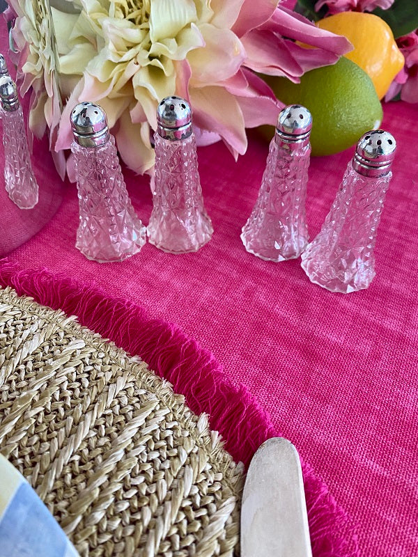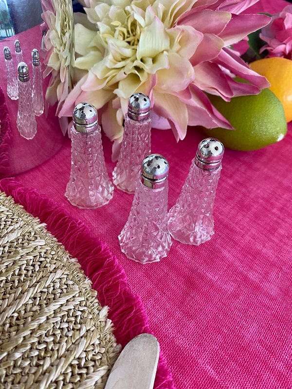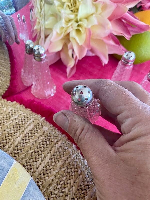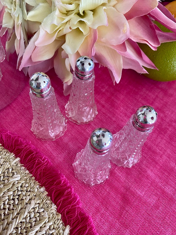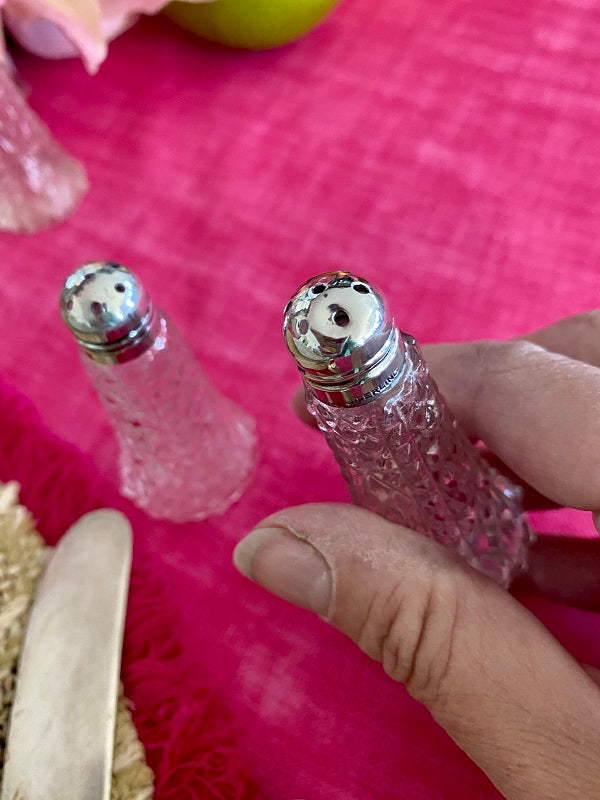 A traditional set of sat and pepper shakers in a cut crystal bottom with a delicate sterling silver screw on top. These are great for your holiday dining table or any time you want to add a little "fancy" to the table. There is some indentation on some of the tops. They are still beautiful and function perfectly.