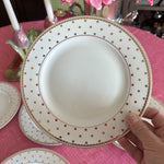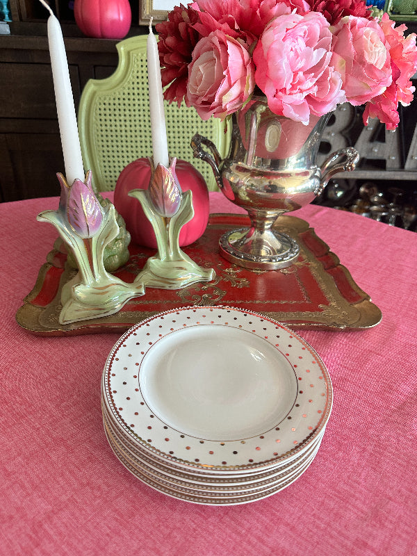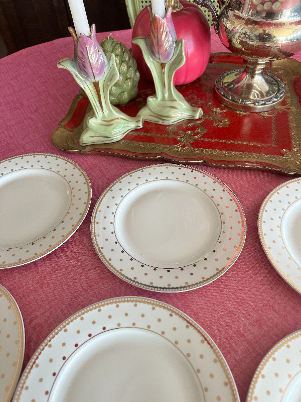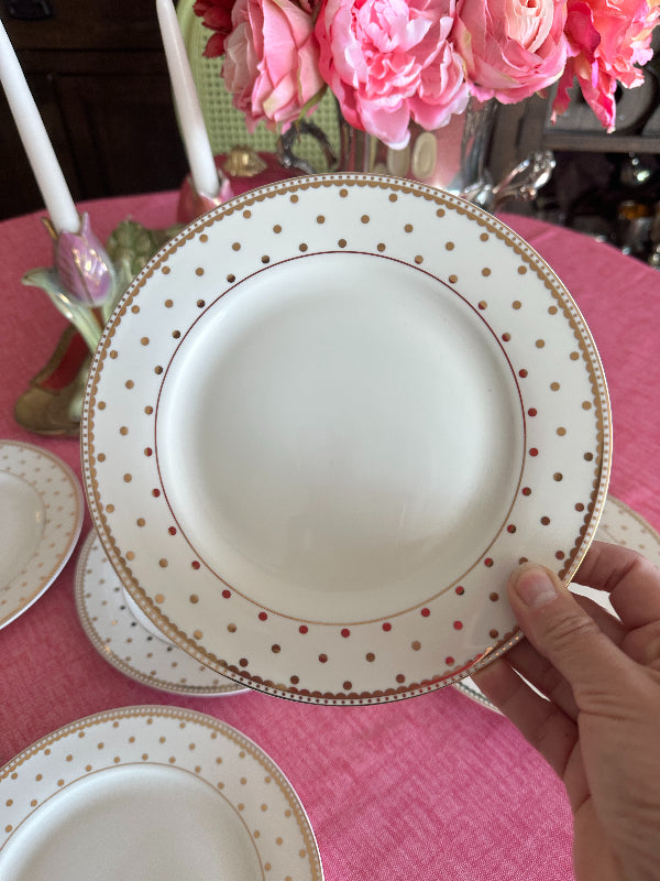 Enhance your table setting with our exquisite Set of 6 Salad Plates, featuring a whimsical design of Gold Dots on a Cream Background. These plates are the perfect addition to elevate your dining experience, whether for everyday meals or special occasions. Their timeless and versatile style adds a touch of sophistication to your table. Crafted with care and attention to detail, these salad plates are not only functional but also a delightful piece of tableware that complements any decor. Reminiscent of the designer Kate Spade. A great addition to your holiday table.
