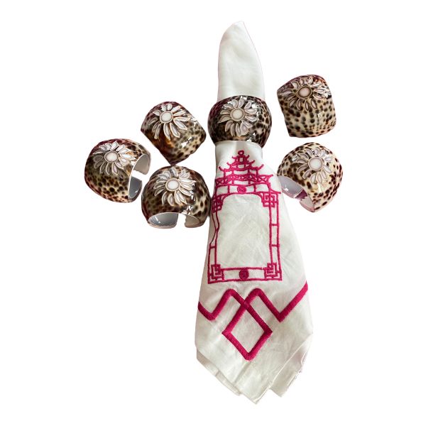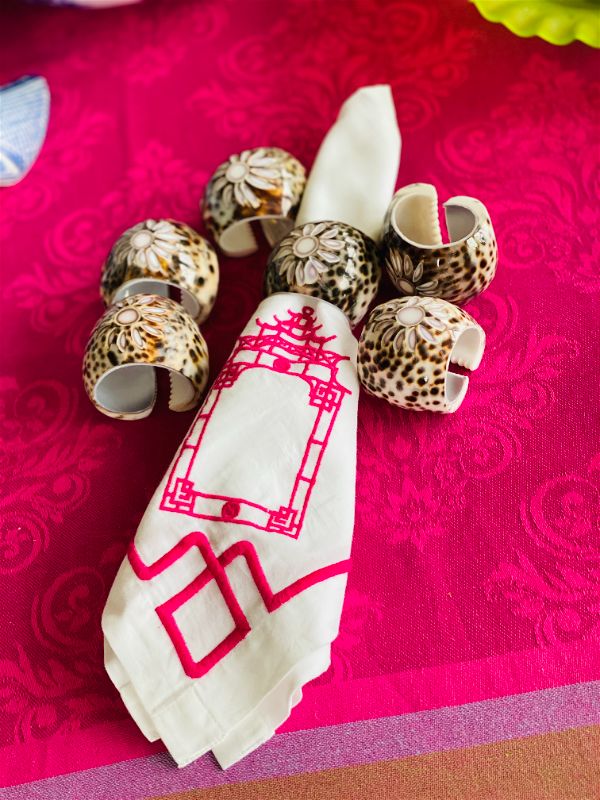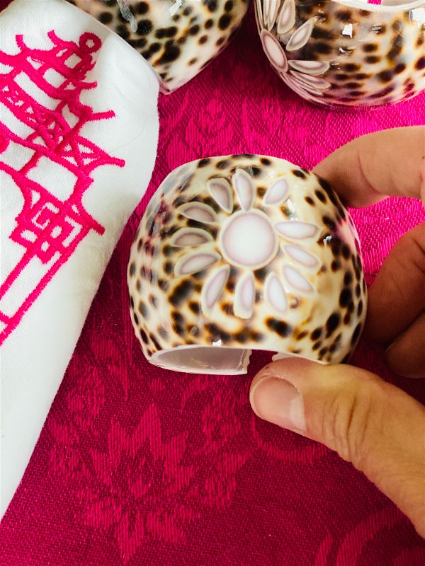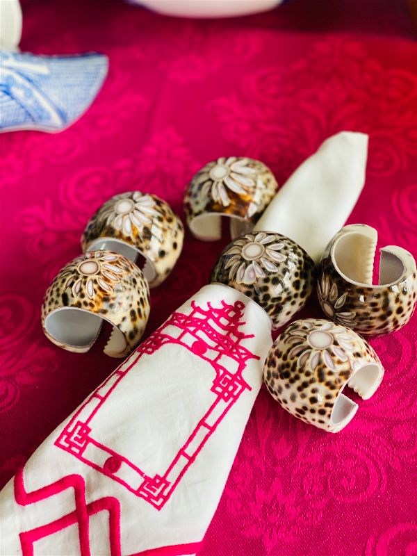 Shells are the perfect accent! This set of 6 cowrie shell napkin rings are beautiful and ready to dress up a coastal tablescape. I love the etched flower design and the colors are neutral so work well with any decor. They remind me of adding "animal print" to your home! These would make a great gift with a beautiful set of monogrammed napkins. If you've been looking for these nows the time to grab them!