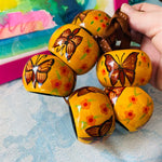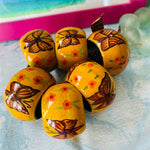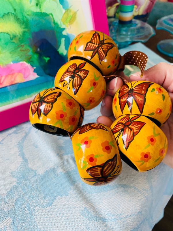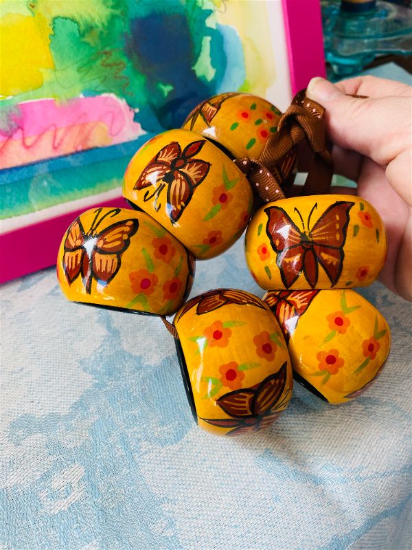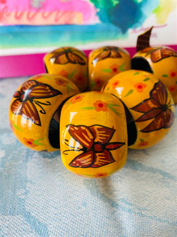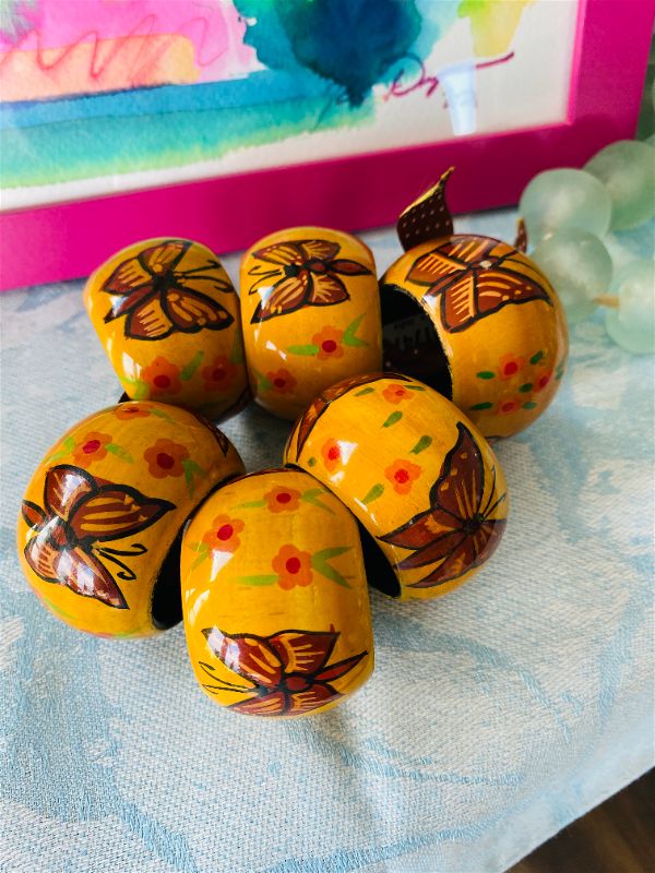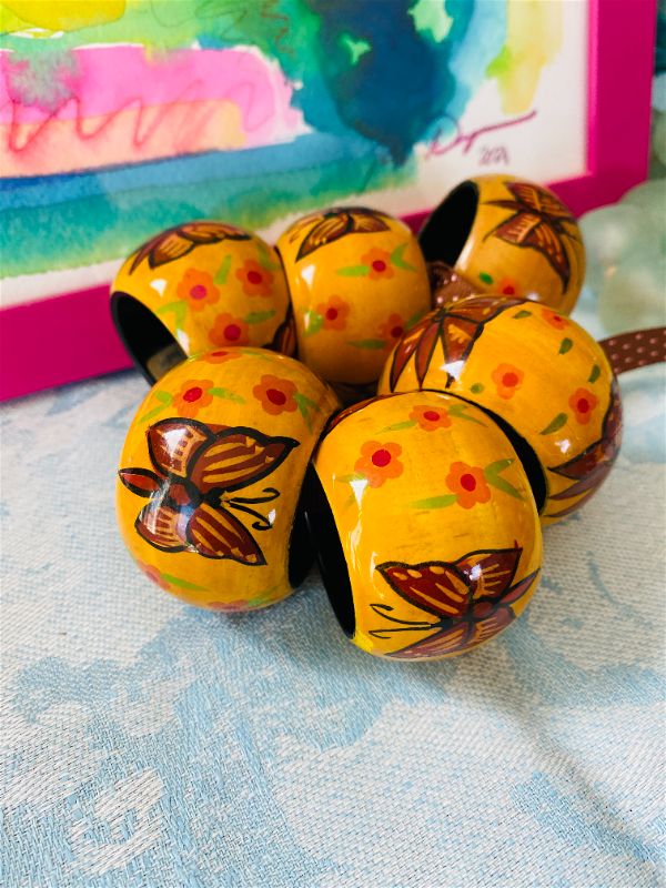 A fun set of wooden style napkin rings with painted butterflies and flowers. These are a great addition to your Spring decor. Add pretty napkins and give as a gift. These give a casual look to your table. Great for dining al fresco.
