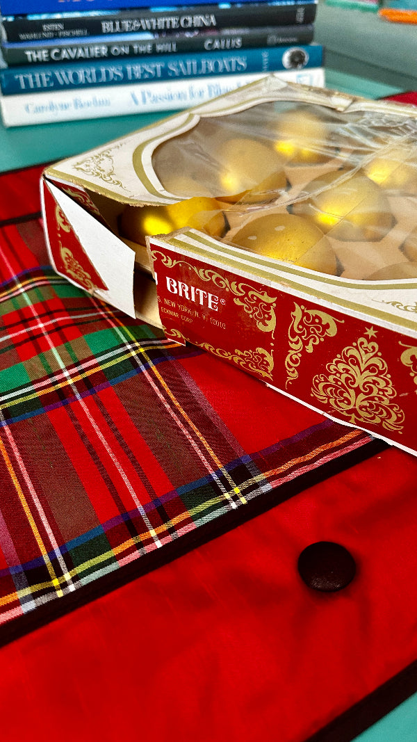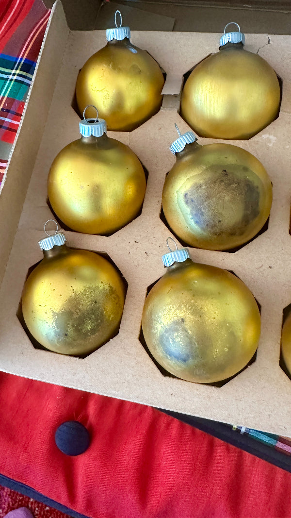 Celebrate the nostalgia of classic holiday décor with this set of Shiny Brite Gold Ornaments, beautifully preserved in their original box. These vintage ornaments add a timeless sparkle and warmth to your Christmas tree, bringing a touch of tradition to your holiday season. Some staining on a few ornaments but limited to one side of each one.