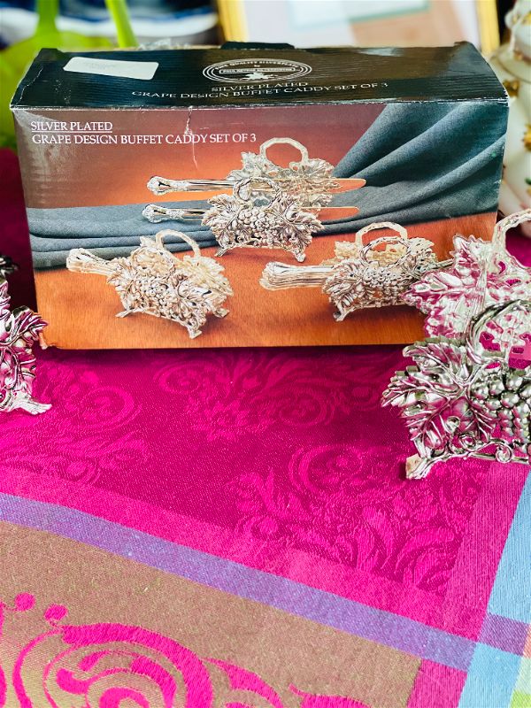 Buffet caddies look great holding your fine silver. These Silverplate grape caddies - set of 3, are by Paul Revere Silversmiths. They are new in the box and have never been used. I took them out of the wrapping to show you the pictures. Perfect for your holiday dinners.