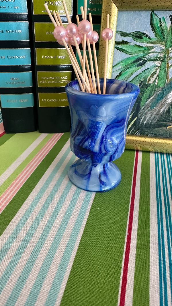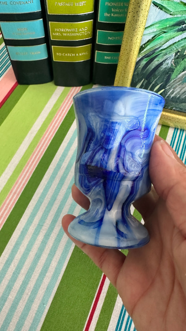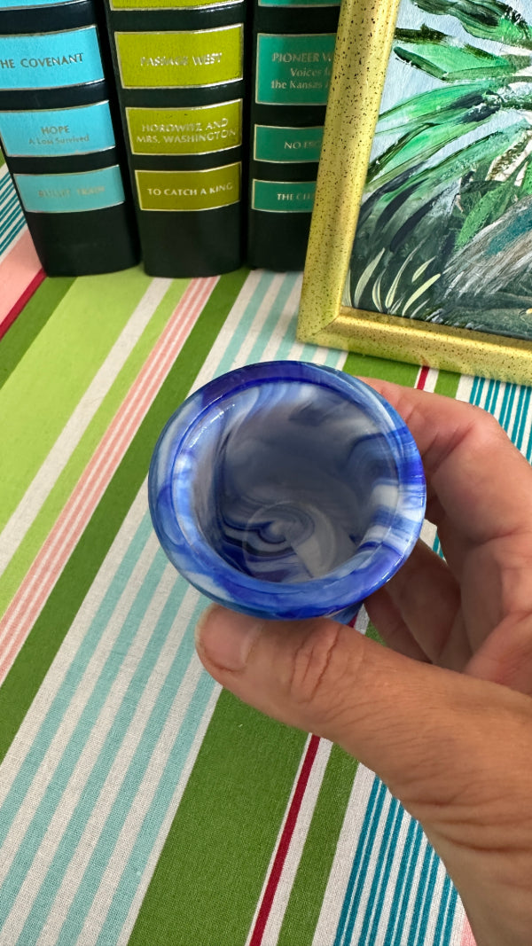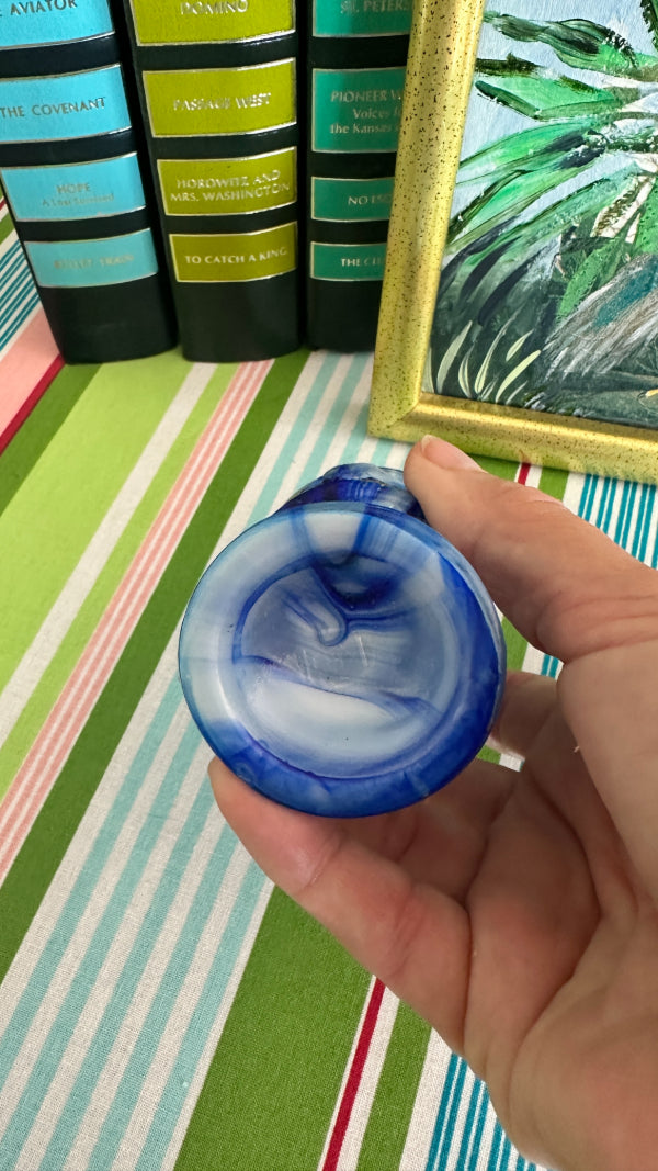 This Vintage Boyd Slag Glass Toothpick Holder features the iconic Hopalong Cassidy character, known as “Hoppy,” in a striking blue and white marbled design with a detailed black figure. A collectible piece from Boyd Glass, it showcases fine craftsmanship and makes a charming addition to any vintage glass or Western memorabilia collection.