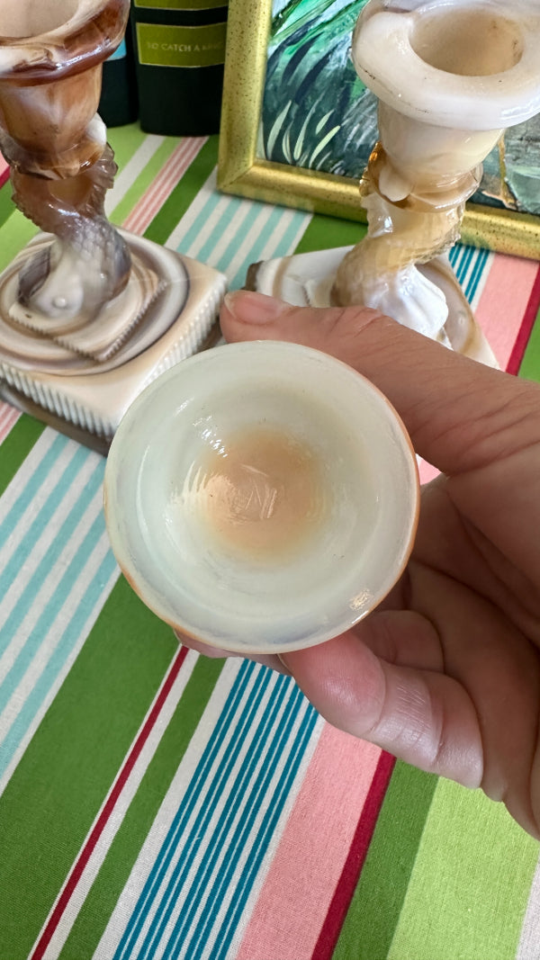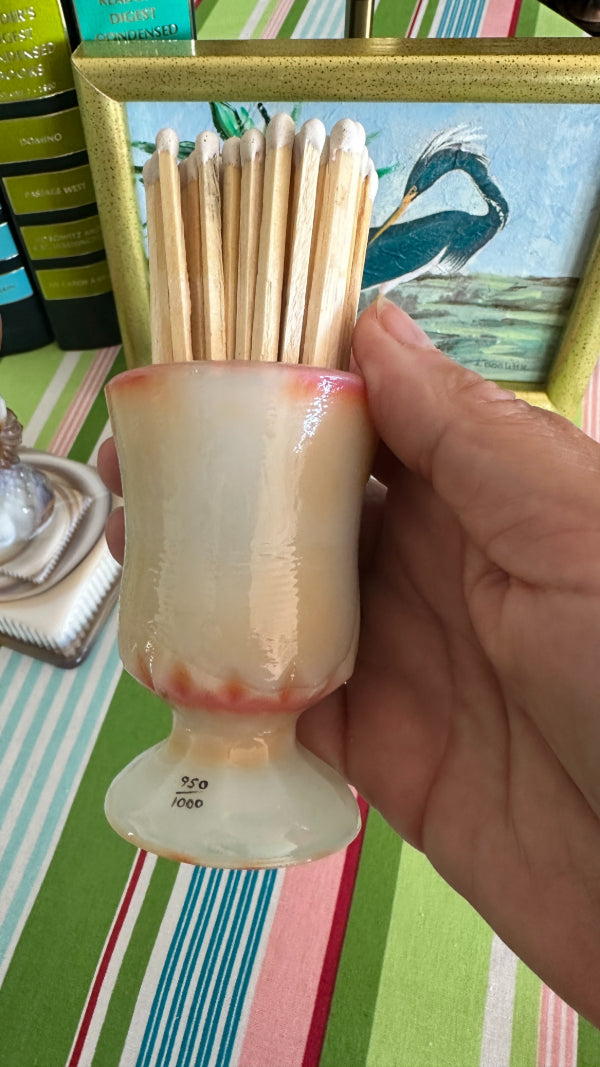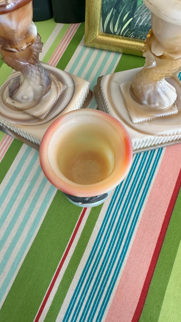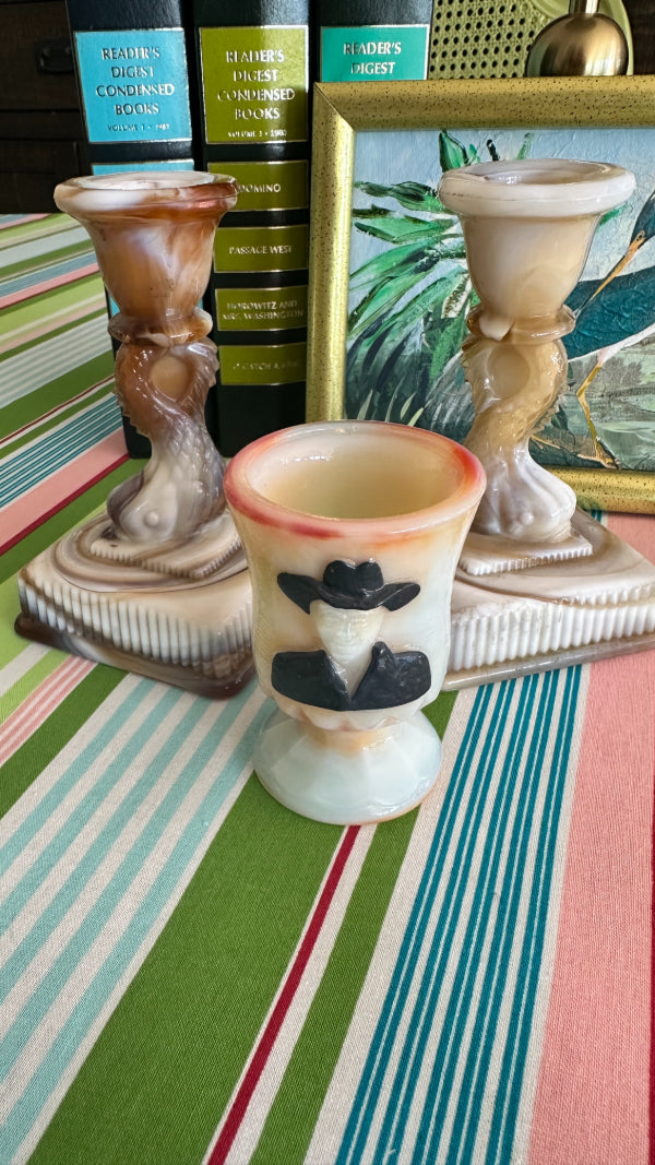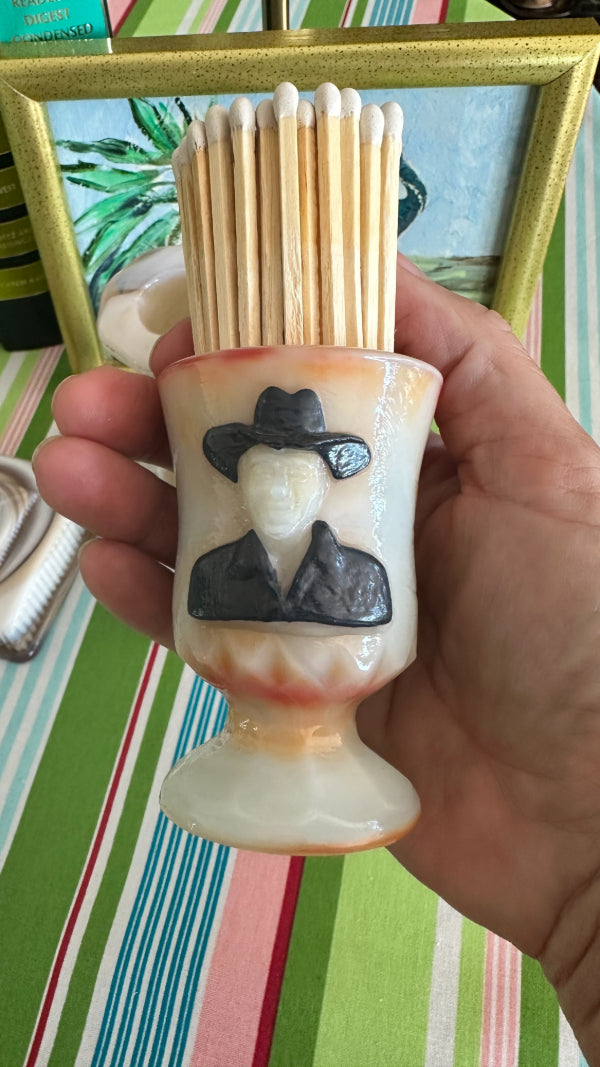 This Vintage Boyd Slag Glass Toothpick Holder features the beloved Hopalong Cassidy character, titled “Hoppy,” in a striking orange and cream marbled design with a detailed black figure. Numbered 950 of 1000, this limited-edition collectible showcases Boyd’s craftsmanship and attention to detail. A must-have for Boyd collectors or vintage glass enthusiasts.