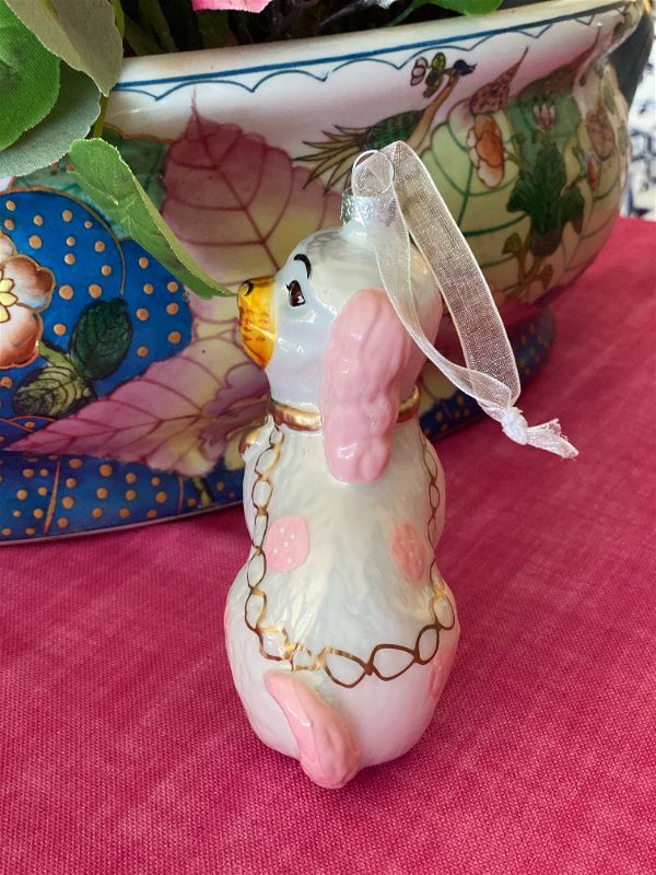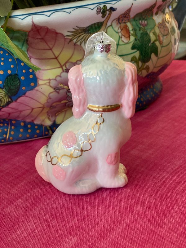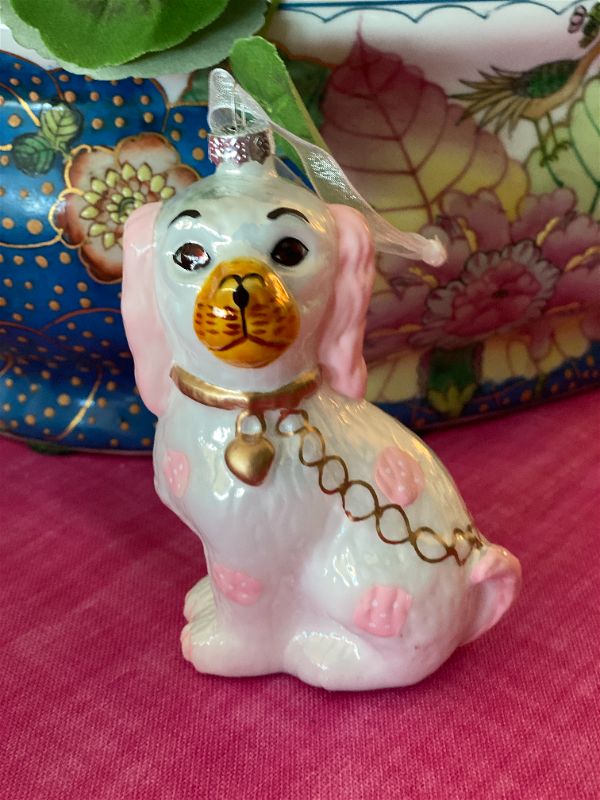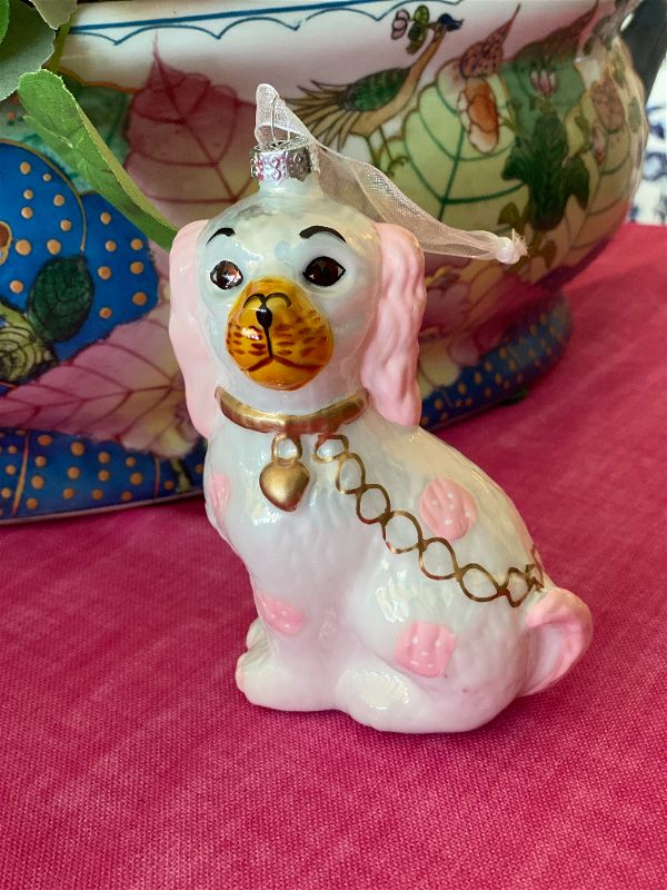 Grandmillennial Chinoiserie Staffordshire dog Christmas ornament pink and white