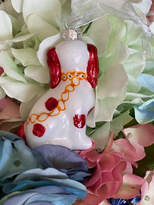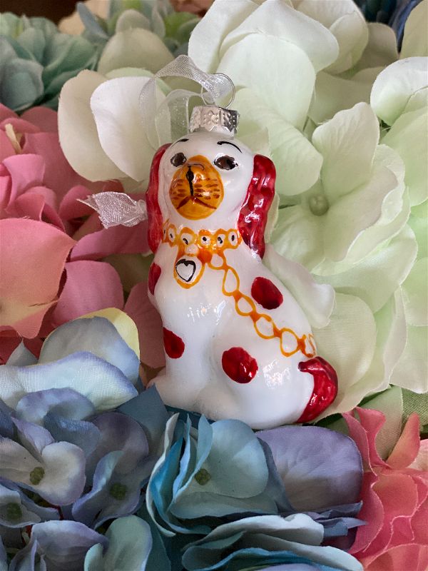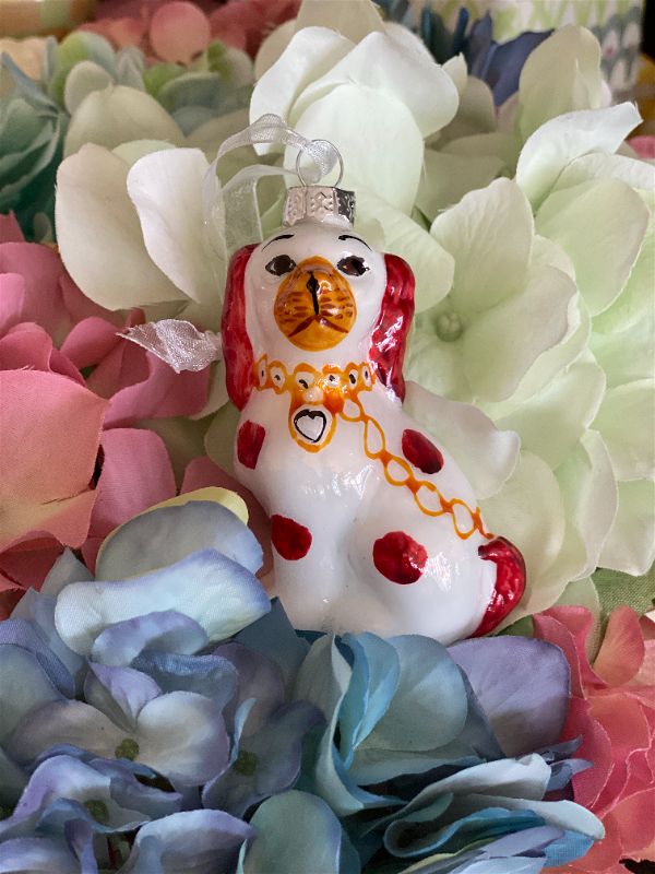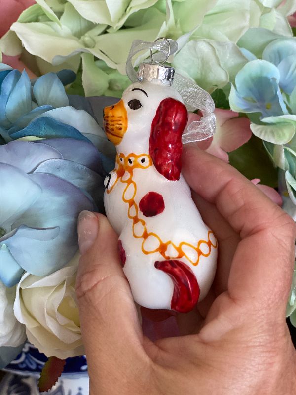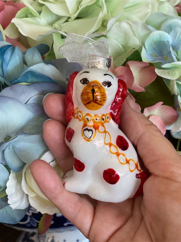 Looking for that Staffordshire dog ornament for your Christmas tree? Maybe you want to add a touch of whimsy to a plant, shelf or table display. This sweet blown glass pup is ready to be displayed. Perfect to give as a gift or use as a gift topper for your grand millennial friend. These are long gone the closer you get to Christmas so grab them now.