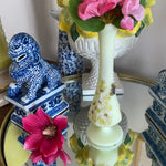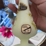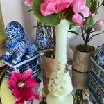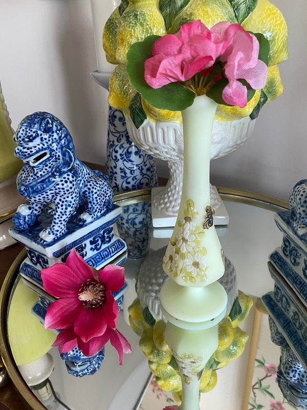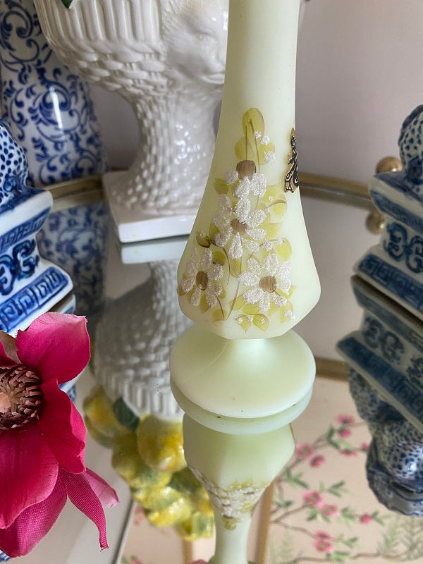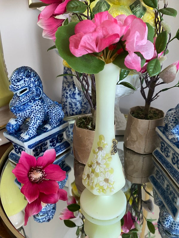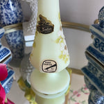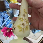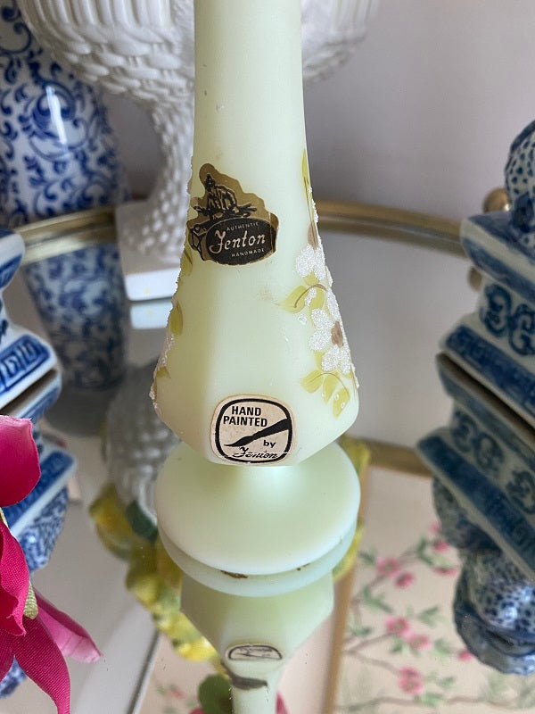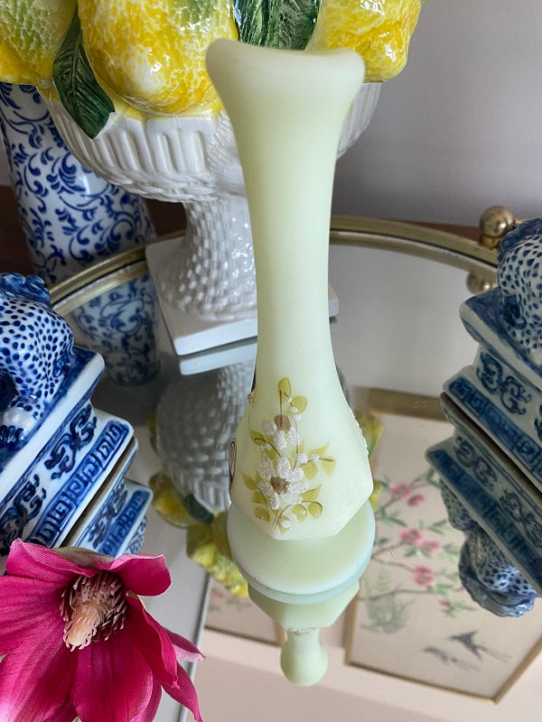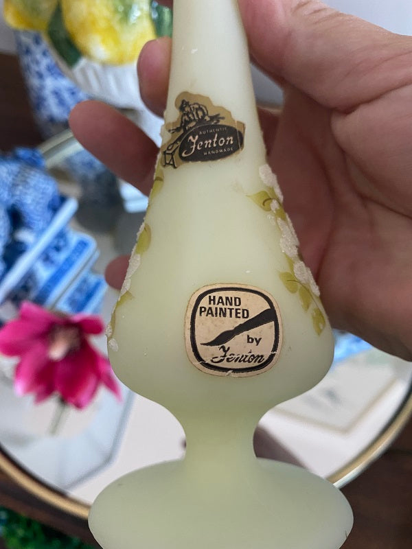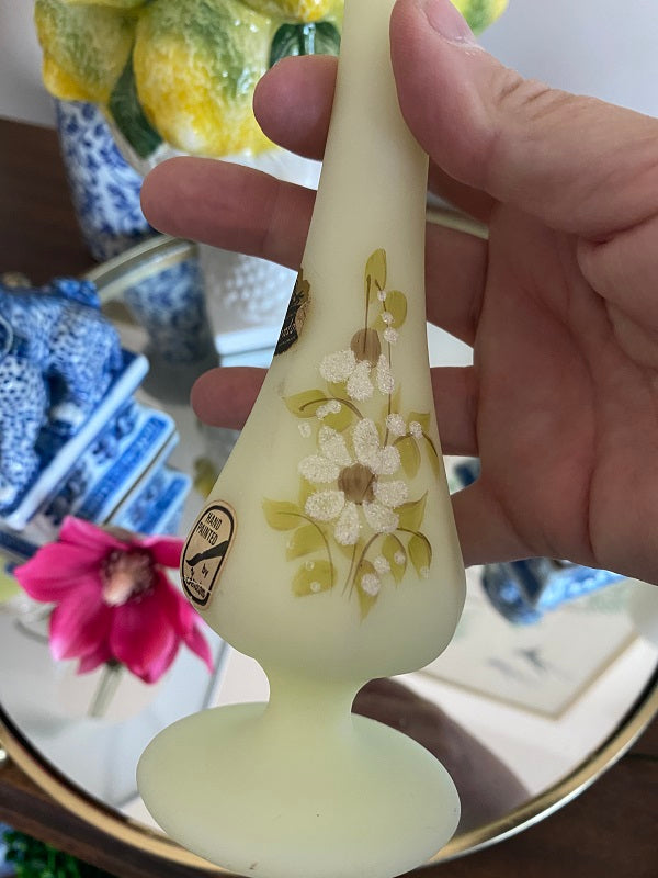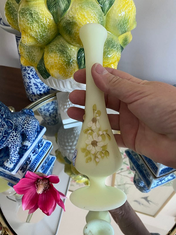 This gorgeous Fenton custard colored vase has hand painted flowers with raised glitter detail. The bud vase is signed by the artist and is a highly collectible item. This decorative piece is perfect for a side table, nightstand or shelf. Makes a wonderful gift for the Fenton glass collector.