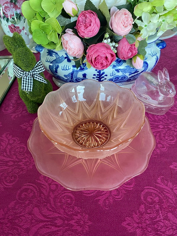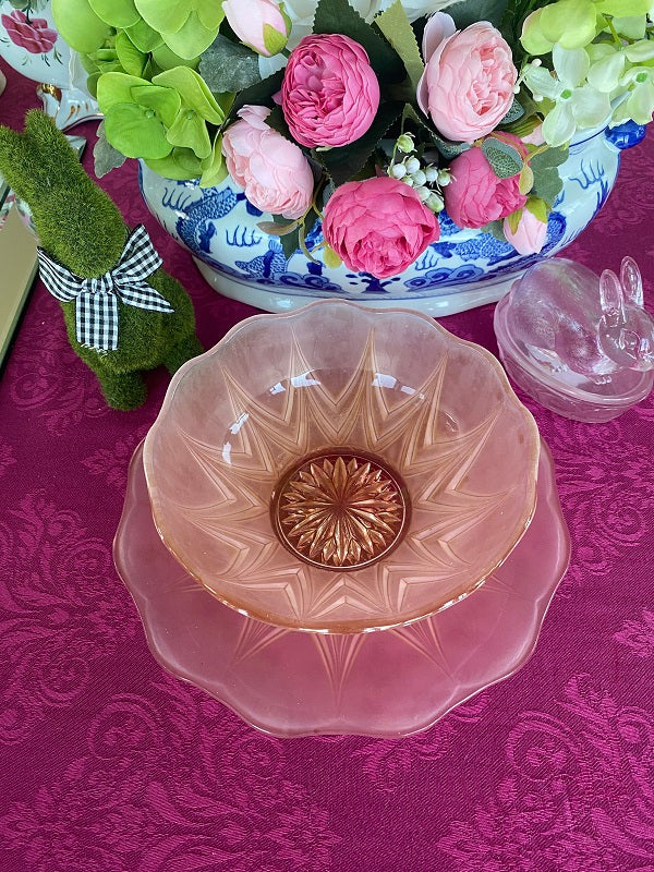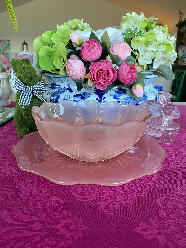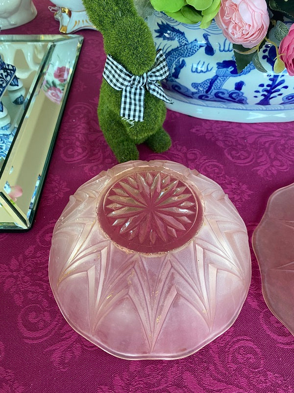 Vintage Art Deco Frosted Pink Glass Serving Bowl with Underplate