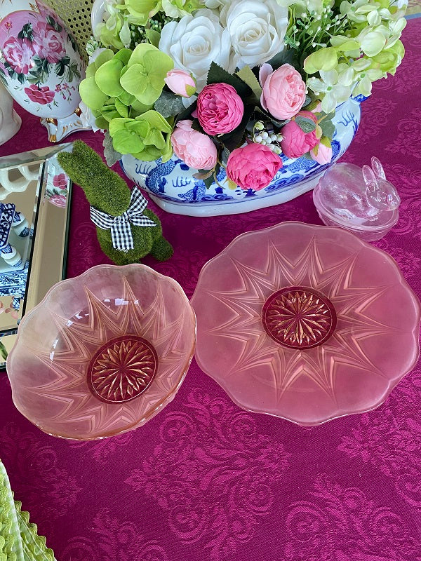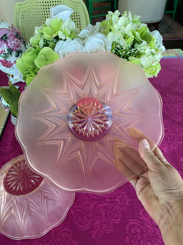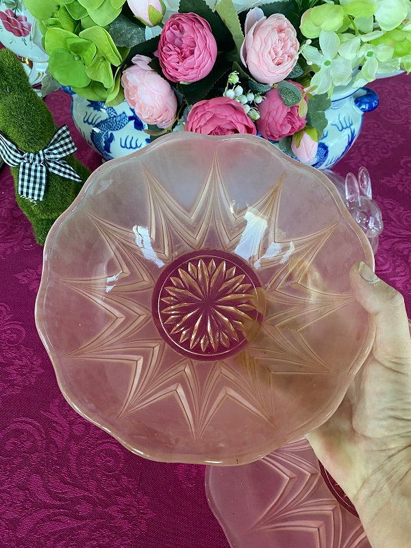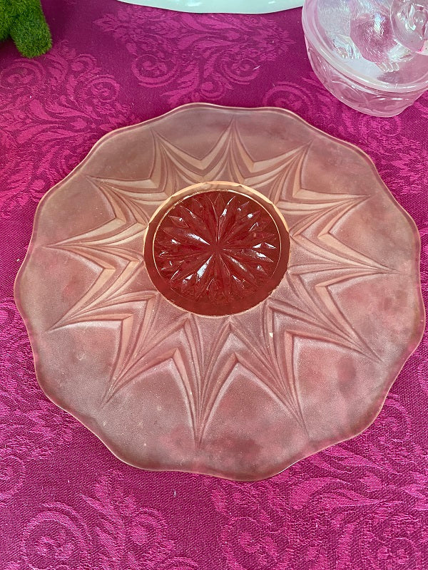 A beautiful pinky peach frosted glass serving set makes a great addition to your Spring, Easter or holiday table. Each piece has a unique starburst pattern and scalloped edge. Perfect vintage condition no chips or cracks.