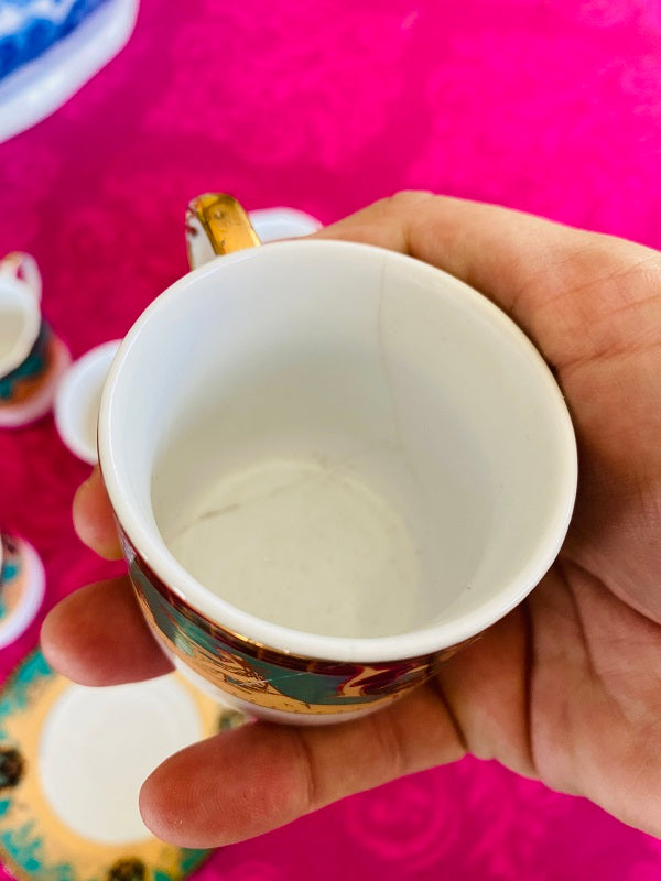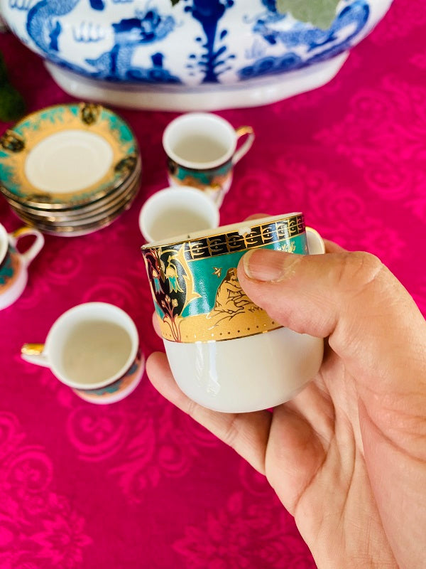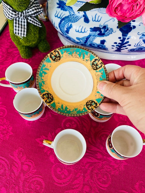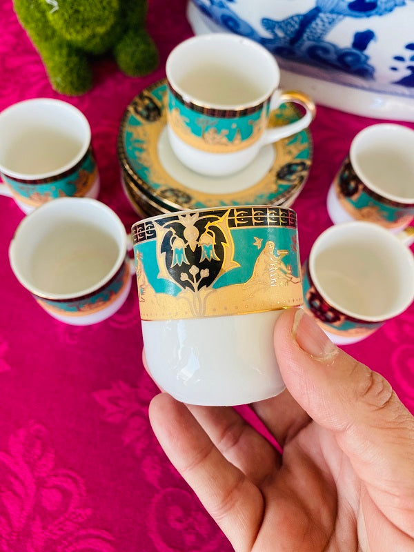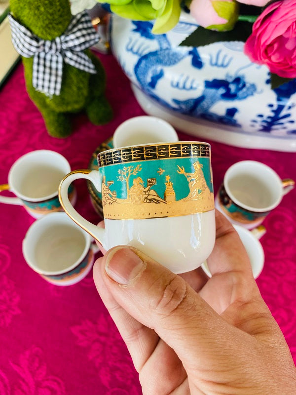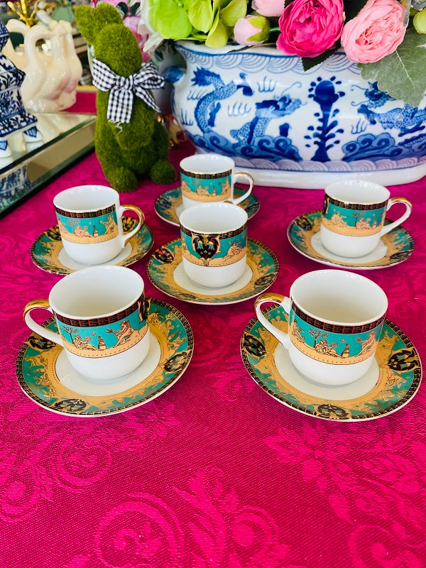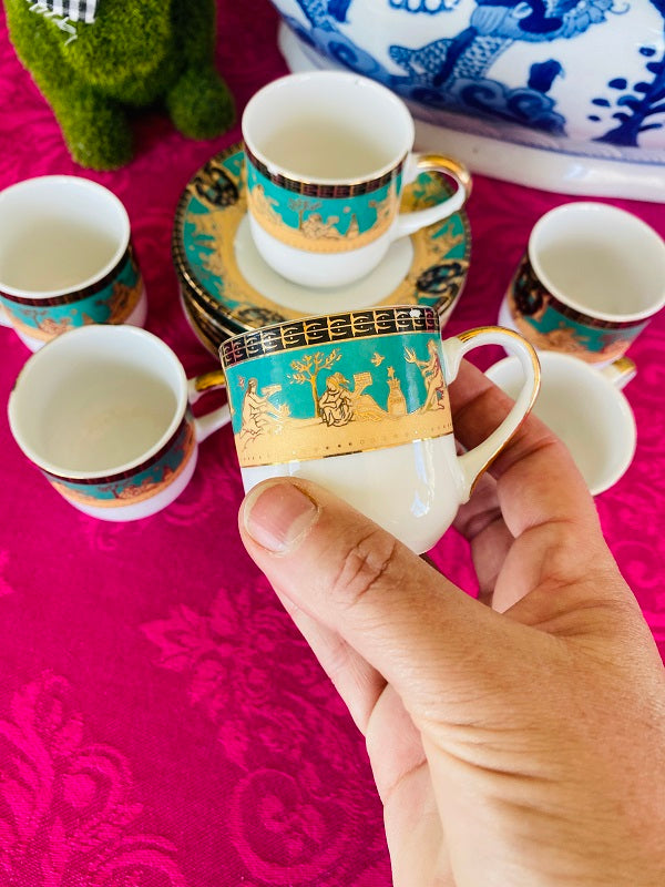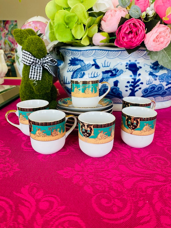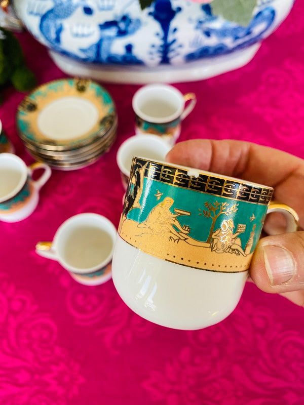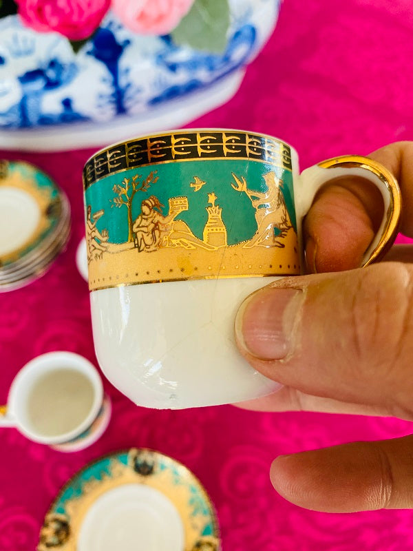 A beautiful set of Grecian themed espresso cups and saucers. Fine porcelain decorated in a bold green with black and gold accents. A scene of gods and goddesses around the rim of the cups. One cup has been repaired.