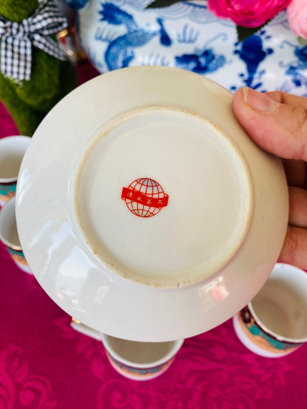 Vintage Set of 6 Greek Motif China Espresso Cups and Saucers - Green, White, Black