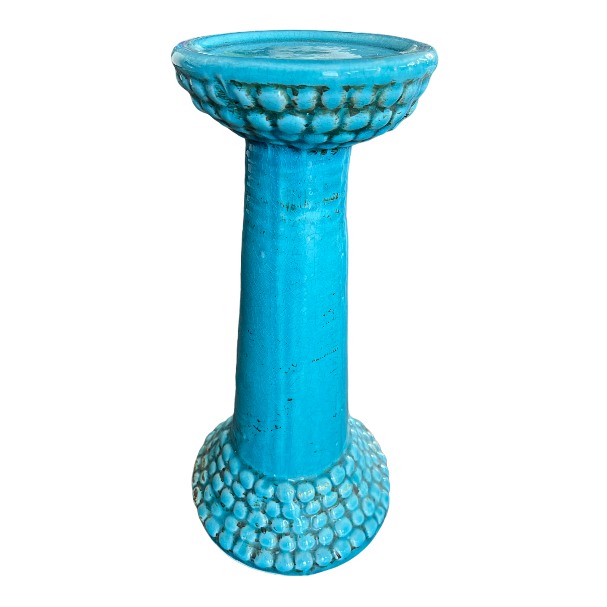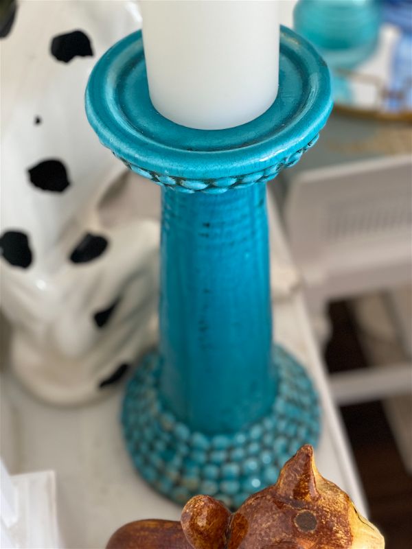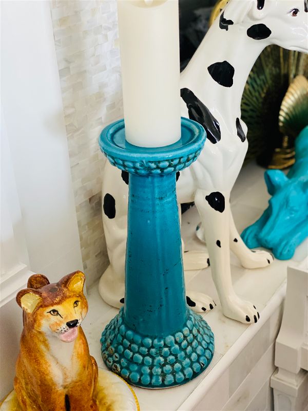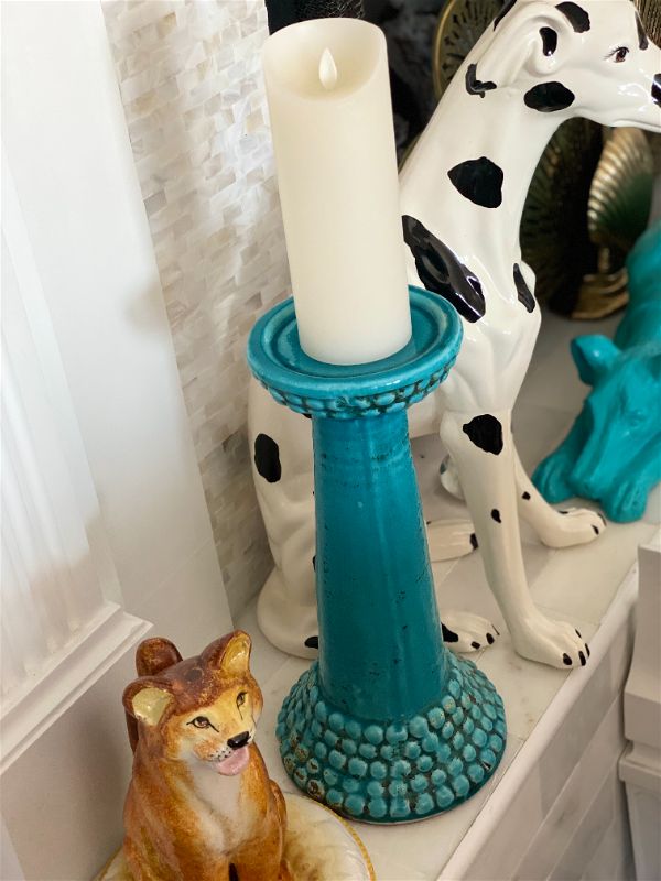 This Turquoise ceramic pillar candle holder has a raised beaded detail. Displays well as part of a centerpiece, on a hearth or mantle. Deliberately crazed. Nice for an outdoor space with a citronella candle.