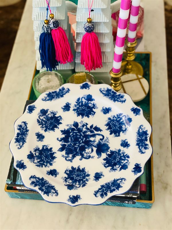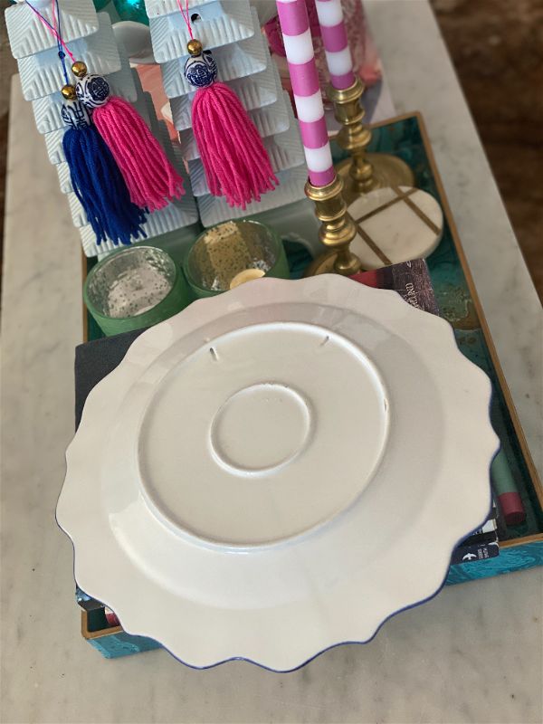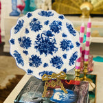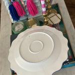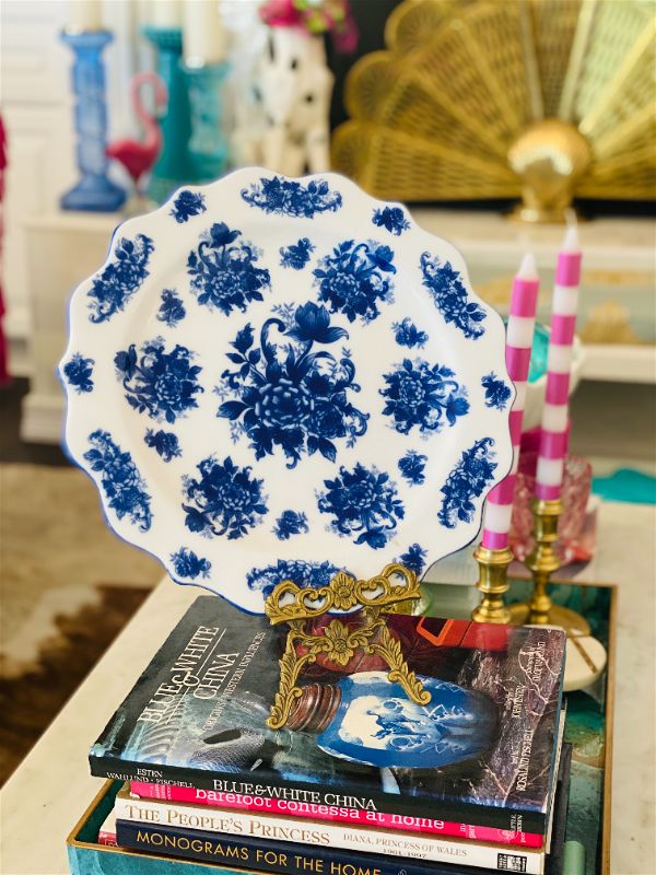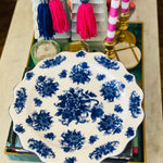 Such a pretty patterned platter with scalloped edges and dark blue floral accent. Perfect for a plate wall, a serving dish, or an accent in a china cabinet or on a shelf. This is a large size perfect to serve appetizers or desserts..would be great for a charcuterie.