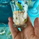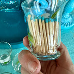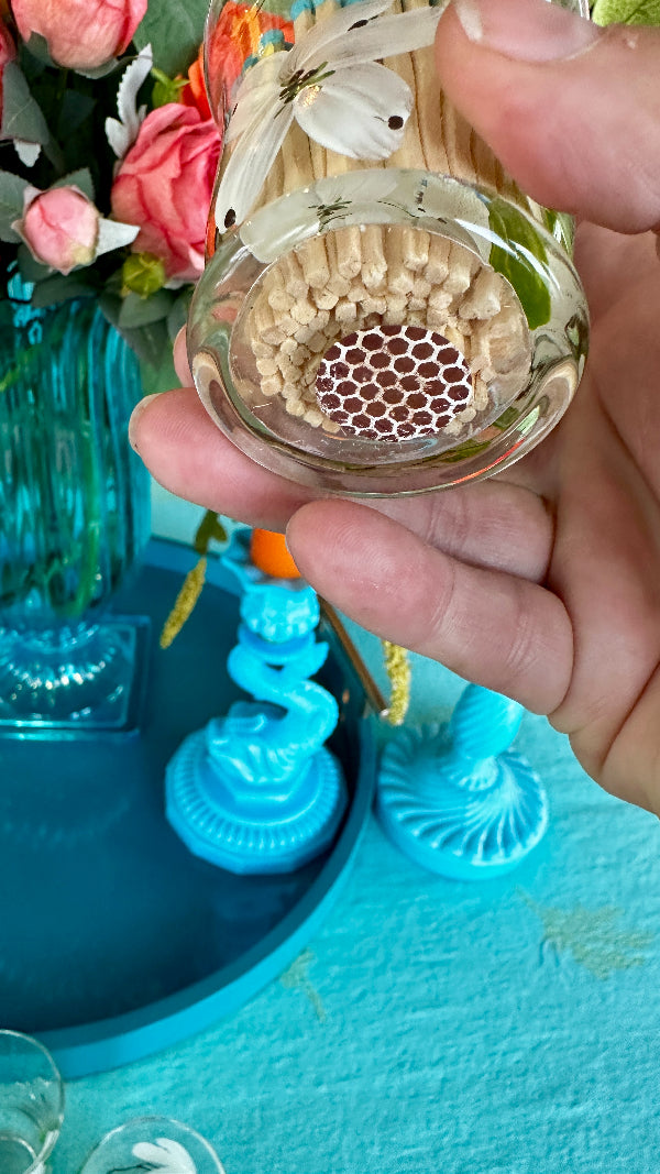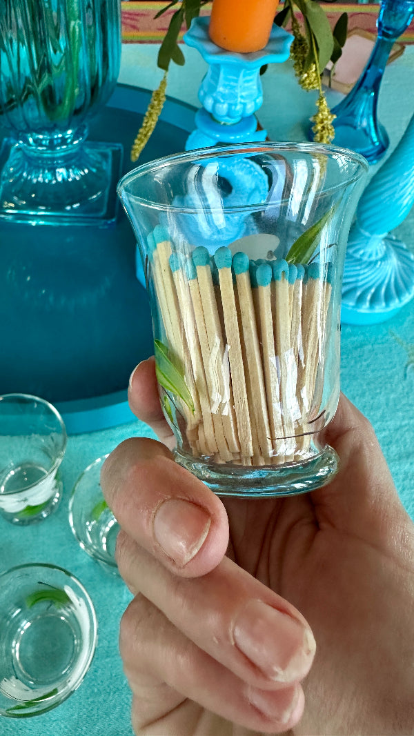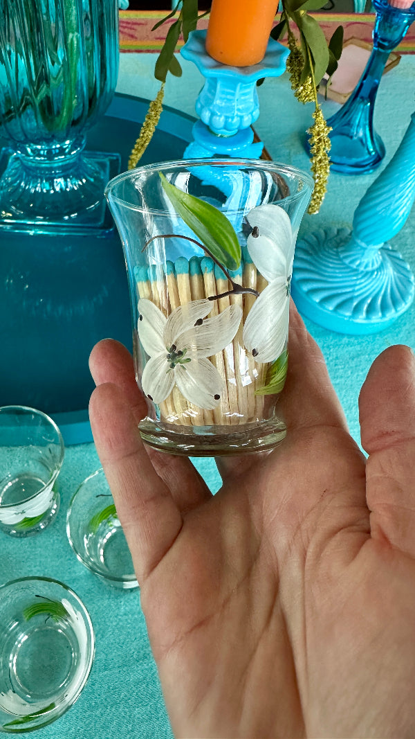 Add a touch of vintage charm to your table with this set of 10 Anchor Hocking juice glasses, each adorned with a hand-painted dogwood motif. The delicate floral design and classic glass construction make these glasses perfect for enjoying your favorite beverages with a touch of elegance. This set brings beauty and function to any dining experience. I've showcased one filled with matches and a striker sticker on the bottom to show the versatility of these beautiful vintage glasses.