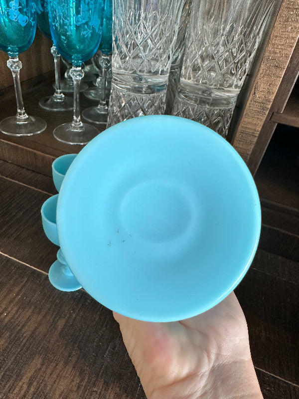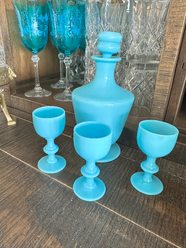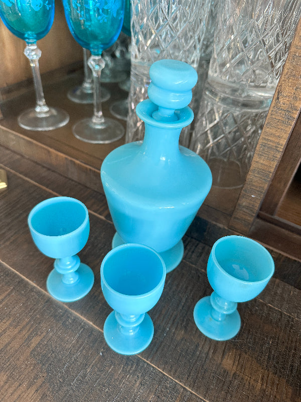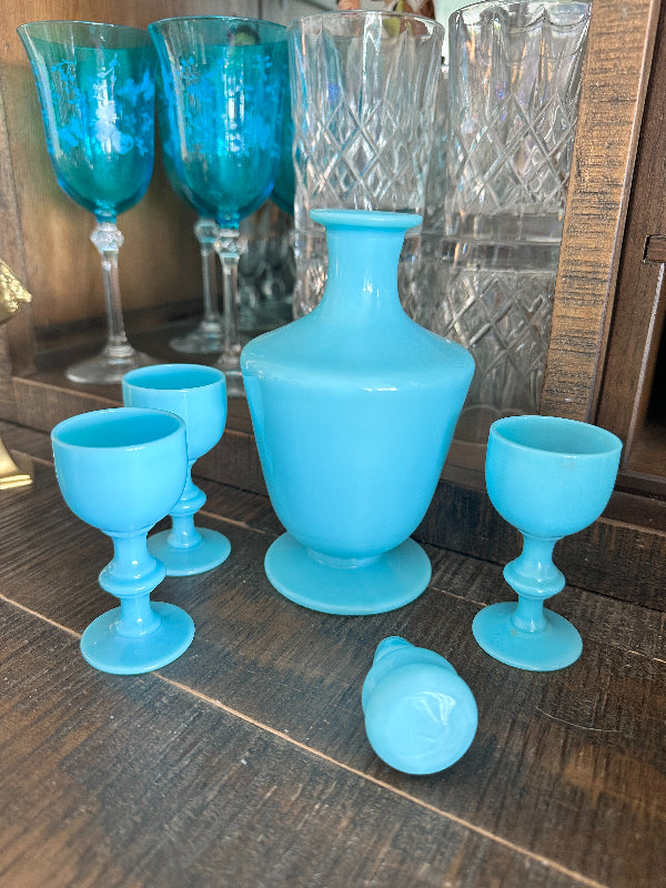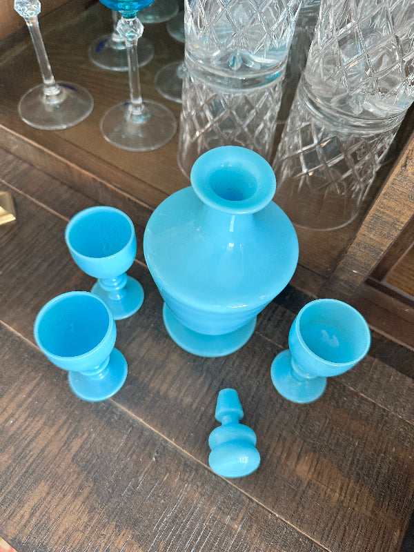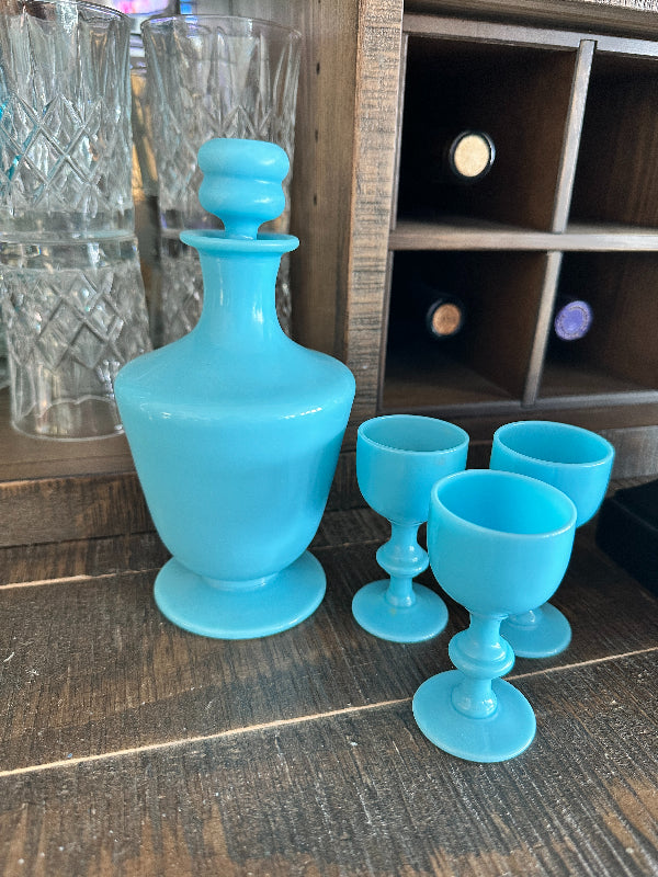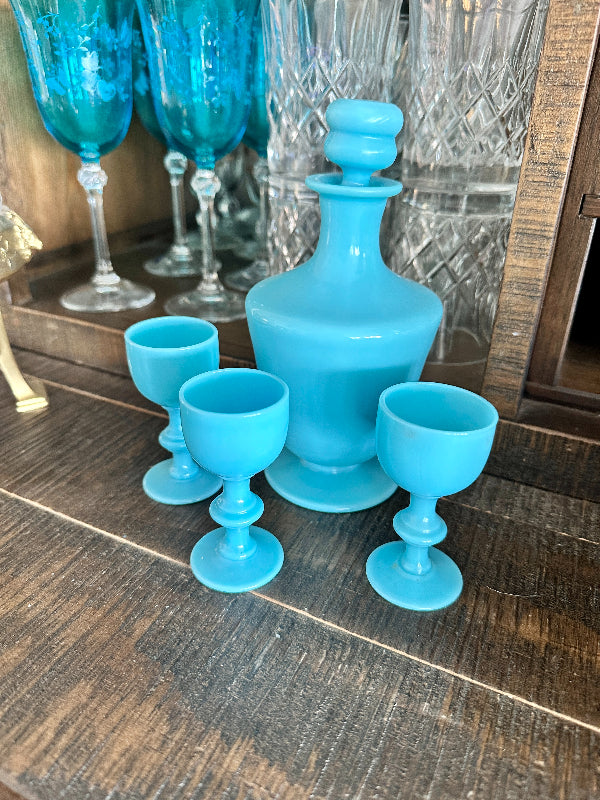 Vintage Antique Portieux Vallerysthal Cordial Set, France, Blue Milk Glass, Decanter, 3 cordial glasses