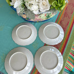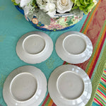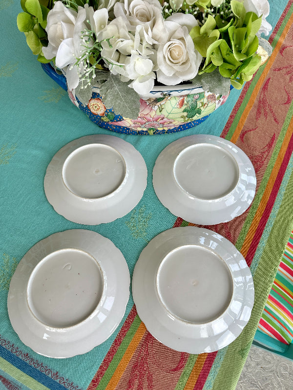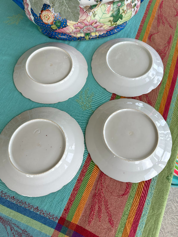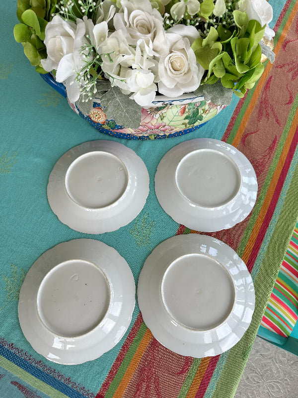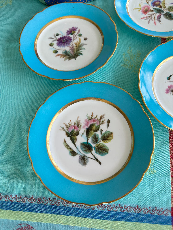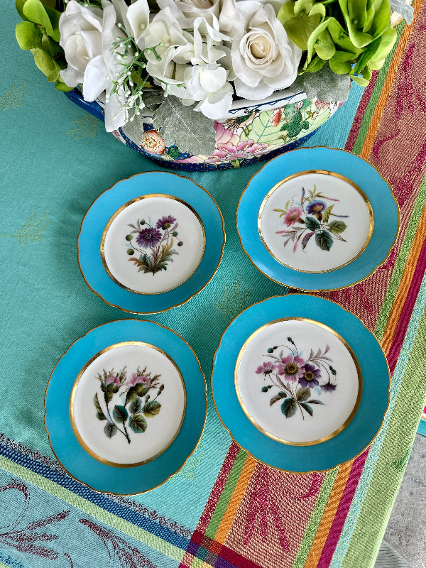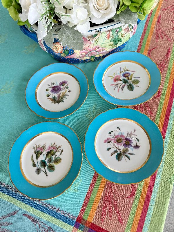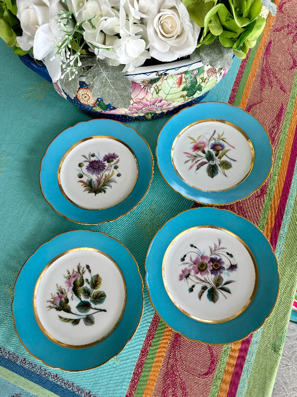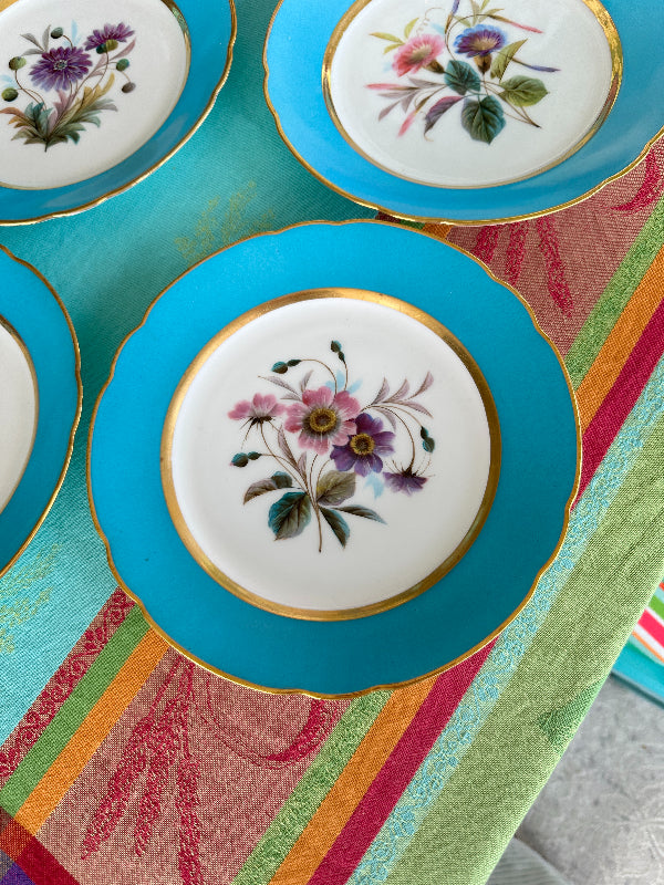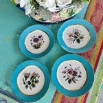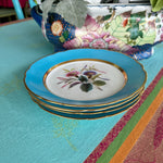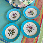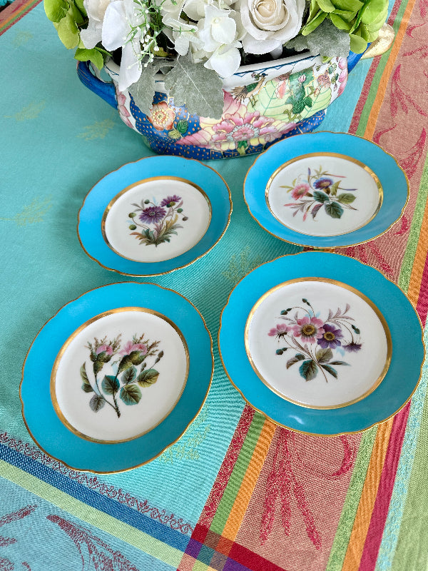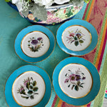 Vintage Antique Salad Plates, Hand Painted Botanical, Turquoise Border Gold Scalloped Rim, Set of 4