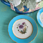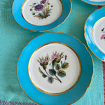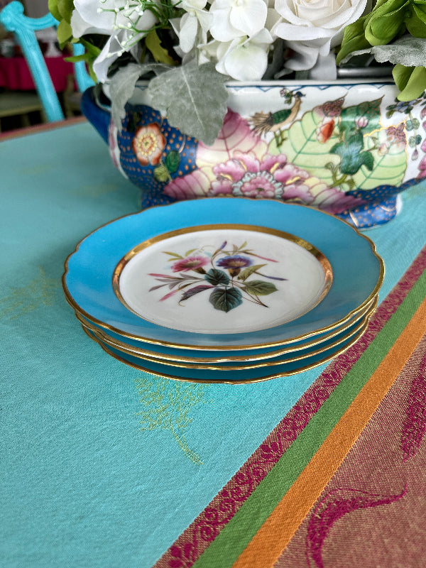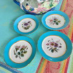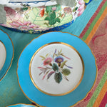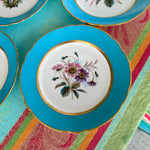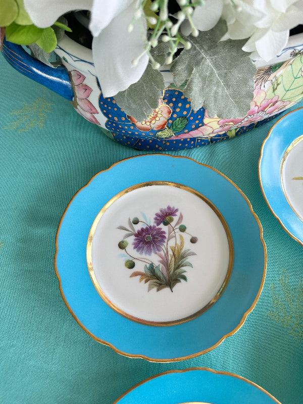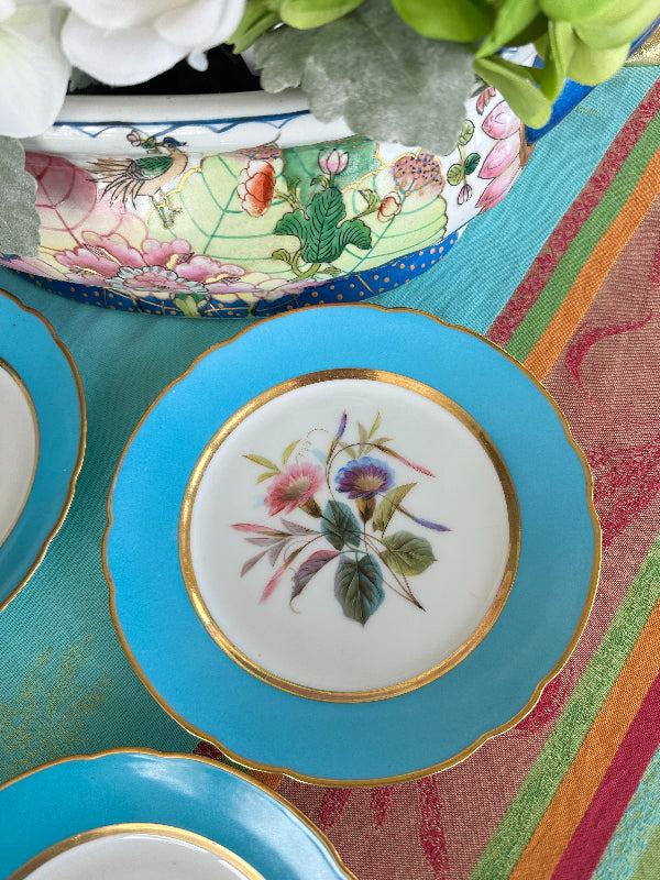 Set a bright table with these gorgeous turquoise rimmed salad plates. The have a white center with florals in pink, purple and green hues, each one a little different. Touches of gold and scalloped rims dress up this set of plates. Perfect to display on a plate or gallery wall. Mix and match with your other antique china. Great condition.