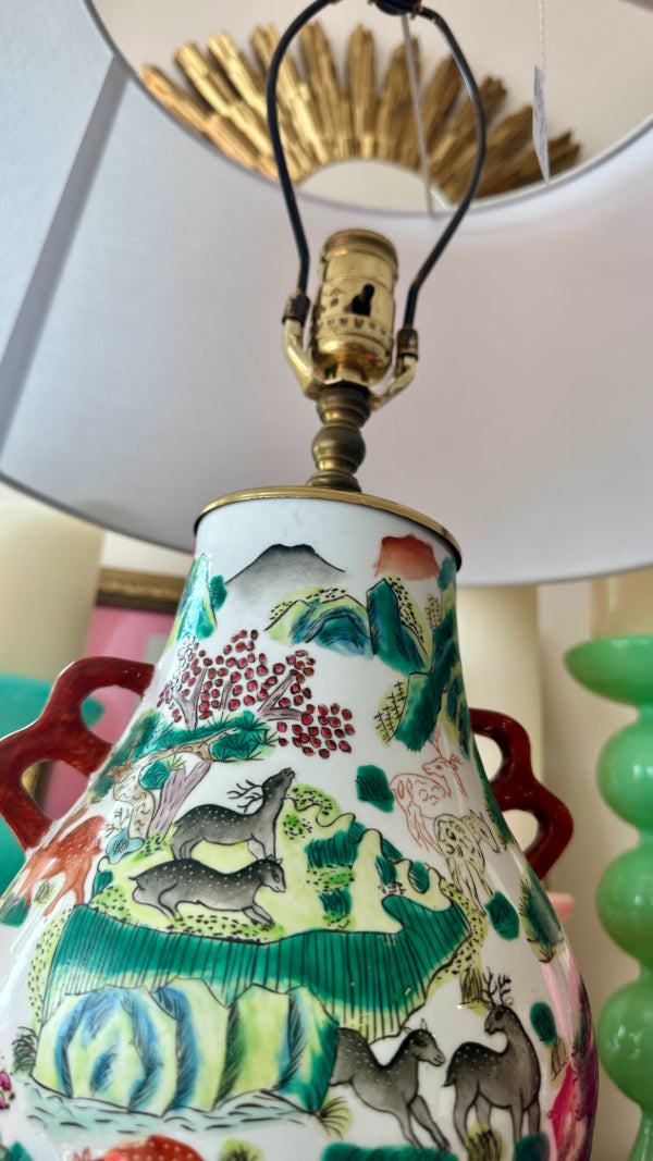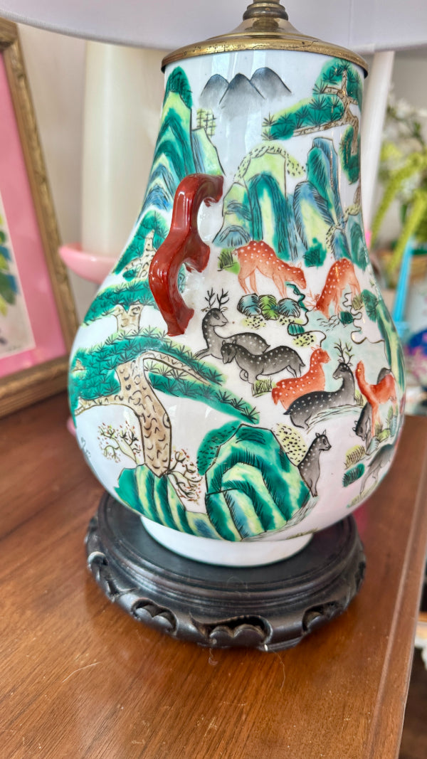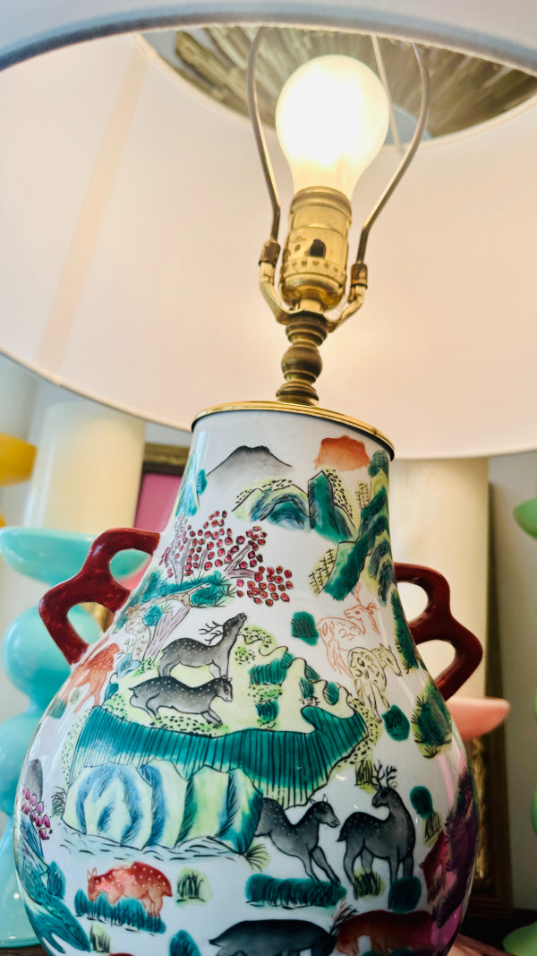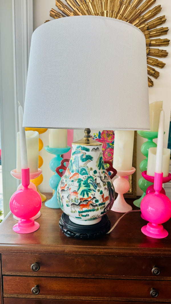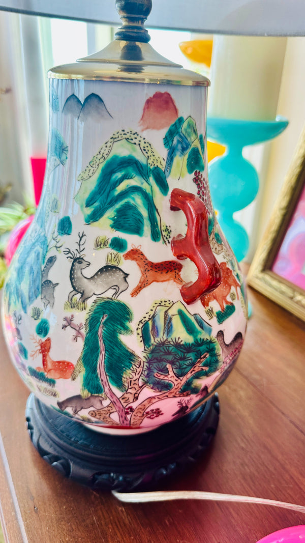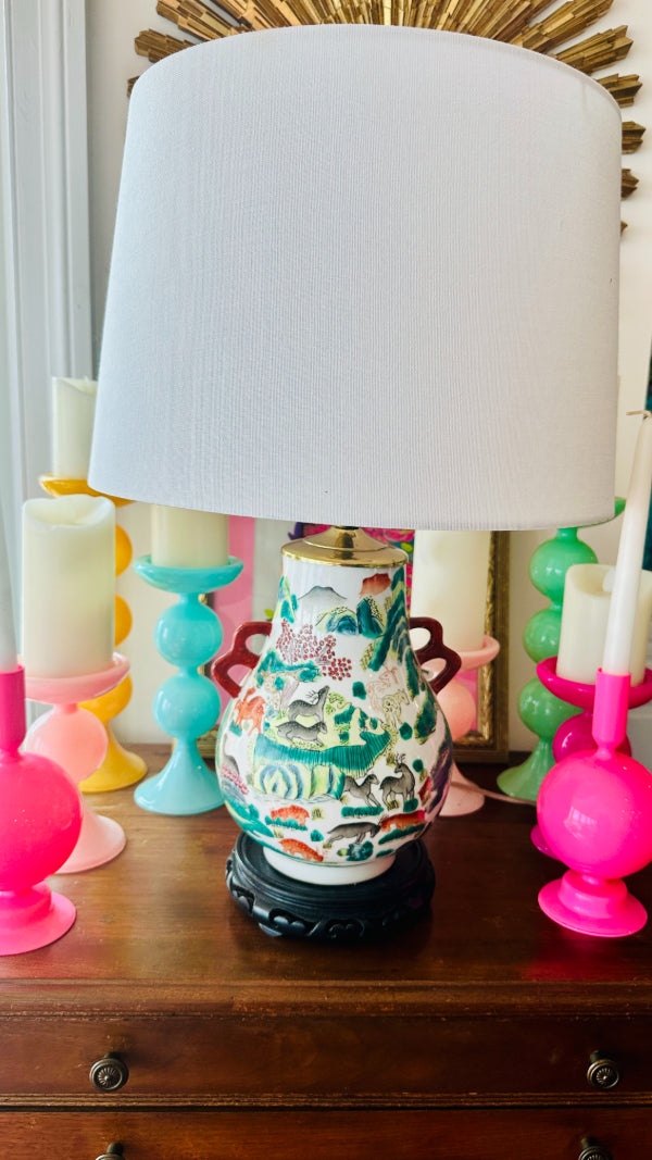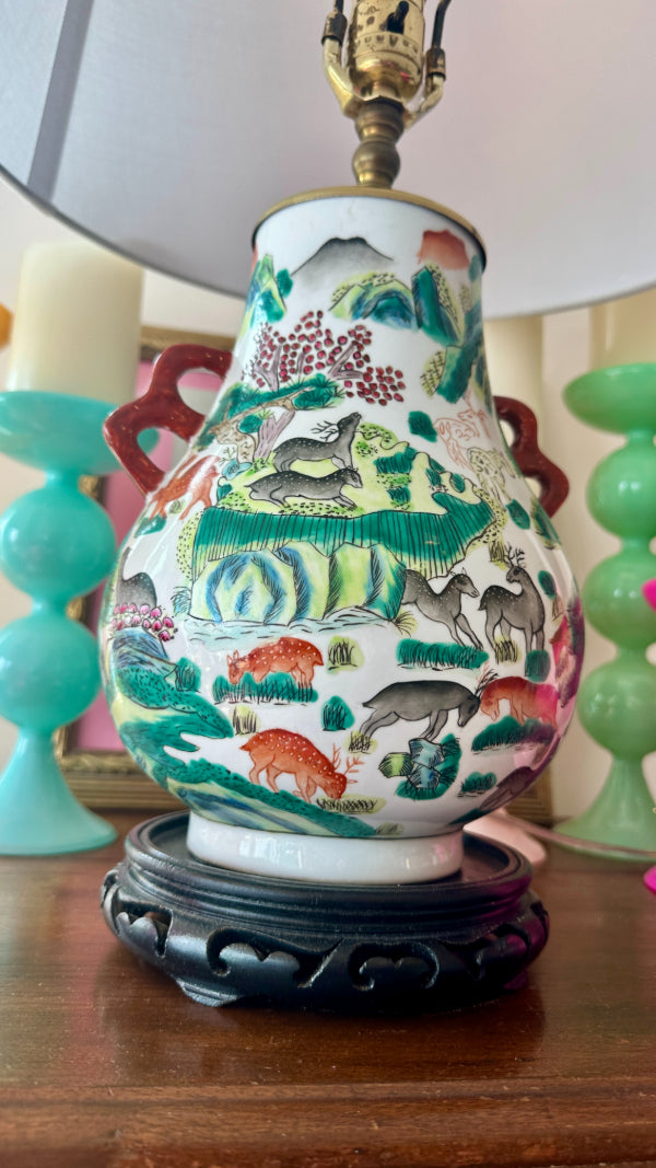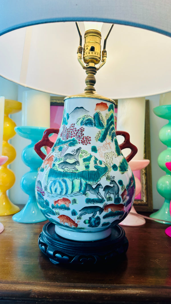 Vintage Asian Lamp, Animal Motif, Wooden Base
