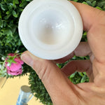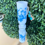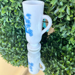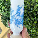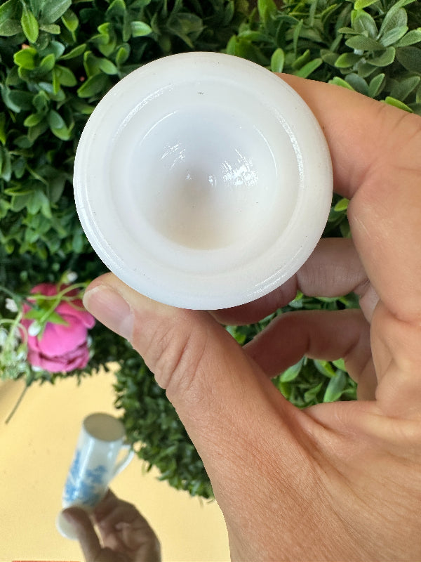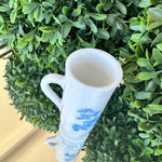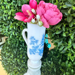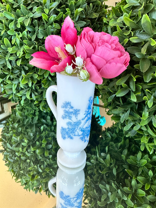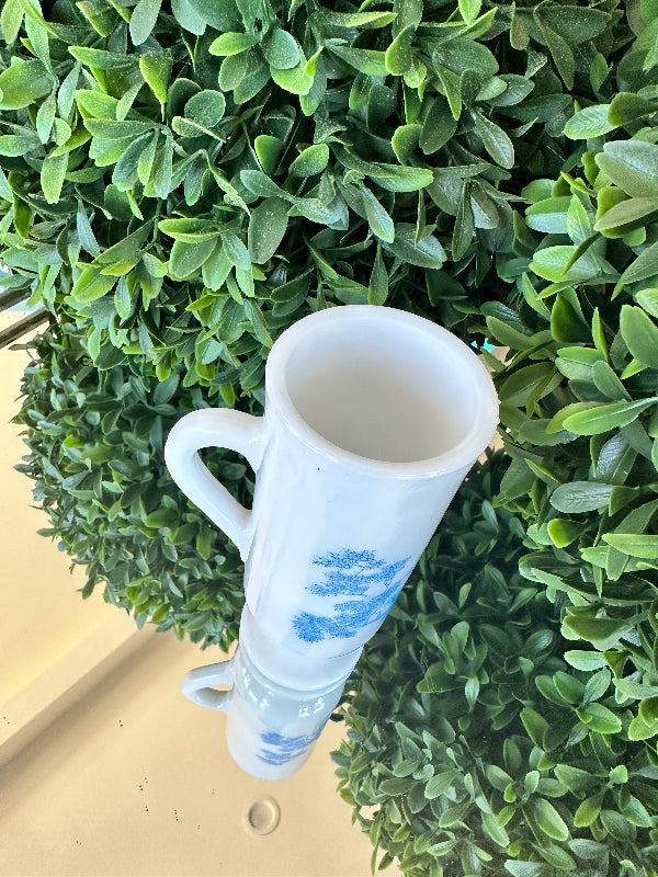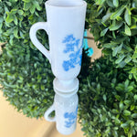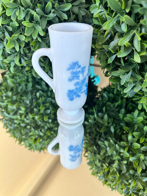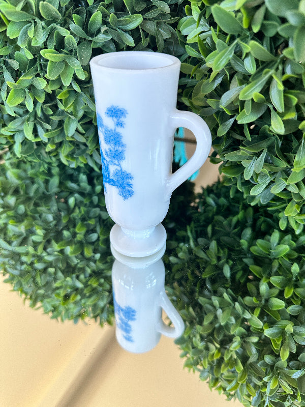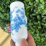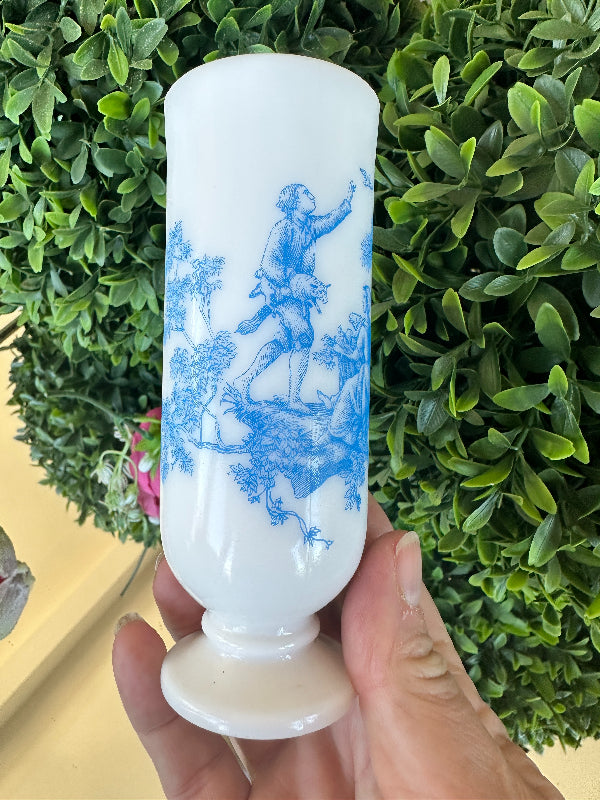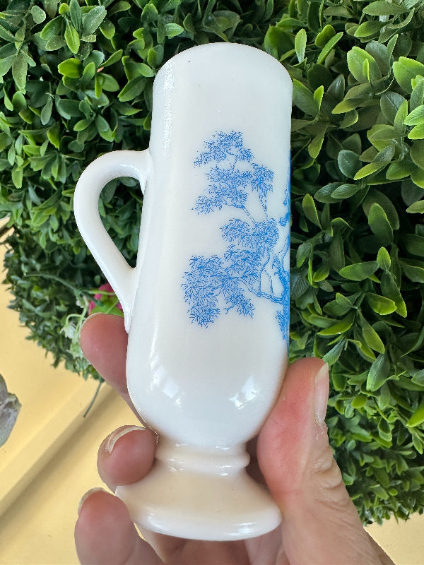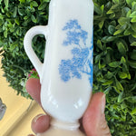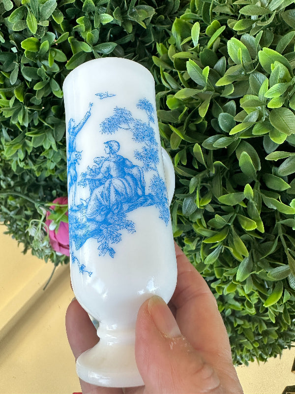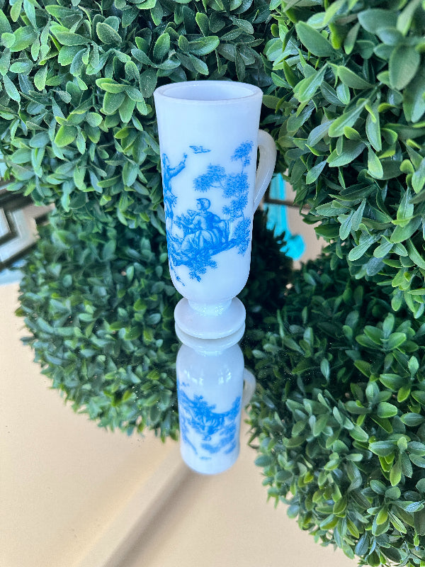This sweet little cup has a toile pattern with a courting scene in blue on white milk glass. The handle makes it great for a sipping drink. Makes a great bud vase, too. Marked Avon on the bottom. Pristine vintage condition. Add it to a bar cart to store straws or stirrers. Set it on your vanity for your make up brushes. What a fun little piece of milk glass.