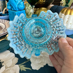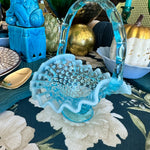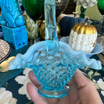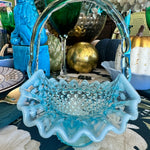 If you love Fenton Glass then this sweet basket is for you. Hobnail design with a ruffle edge and basket weave like handle. The edge has a lighter milky blue color. Perfect for candy or nuts. Great to display on a shelf or table. Add to your night stand and use it to store jewelry at night while you sleep. Great vintage condition.