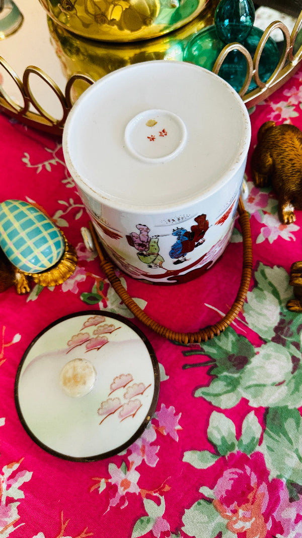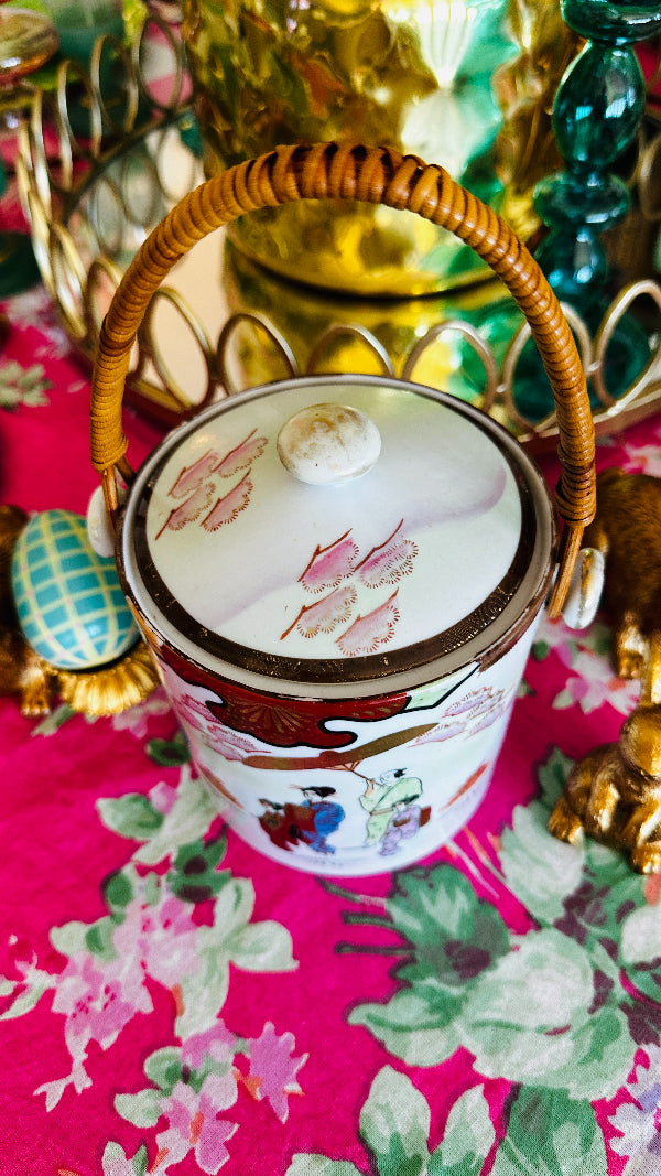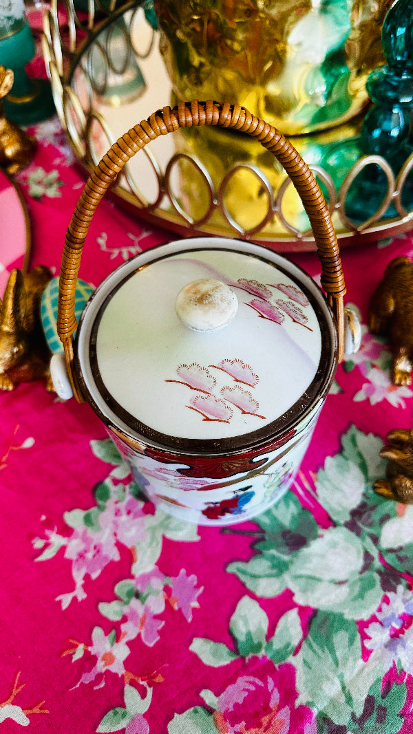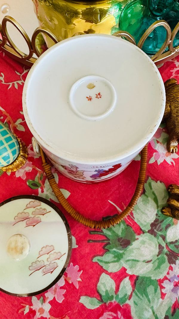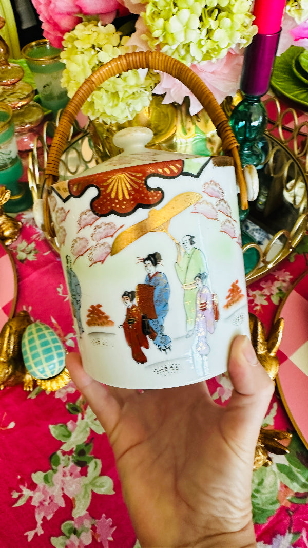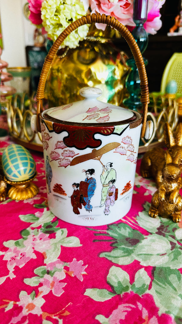 Vintage Biscuit Jar, Japanese Porcelain Basket Weave Handle, Lidded, Slight Paint Loss