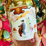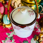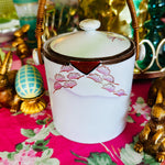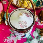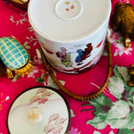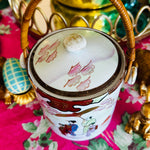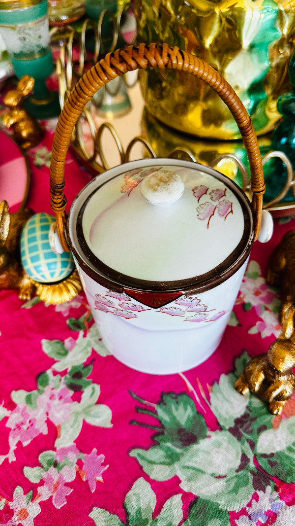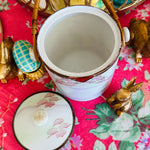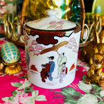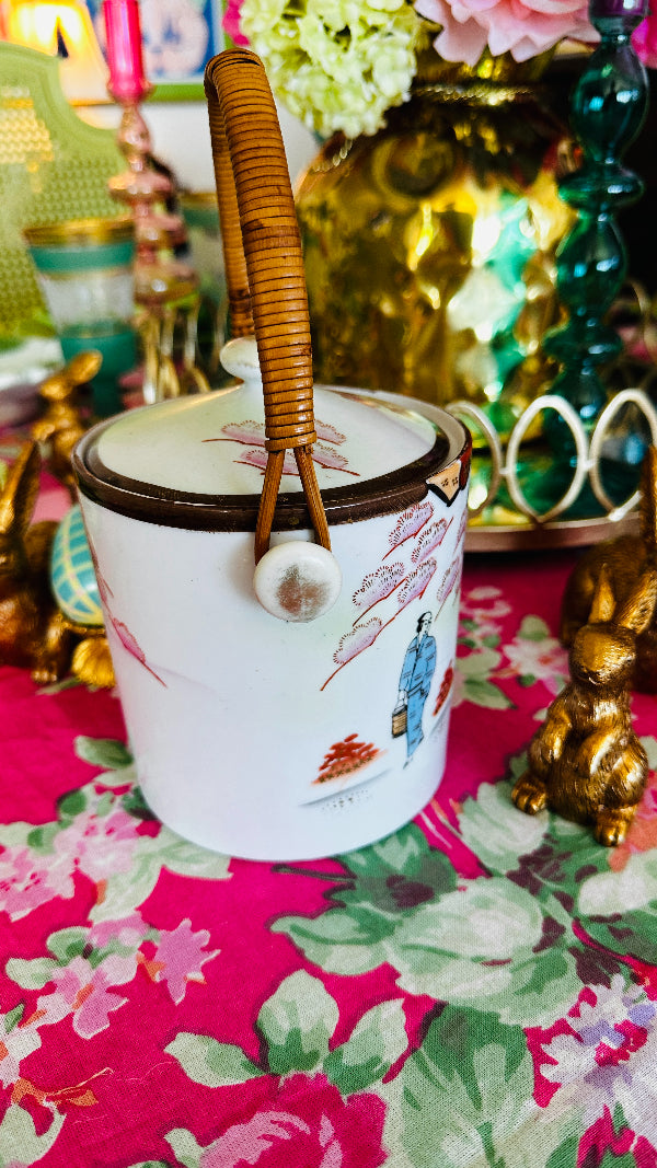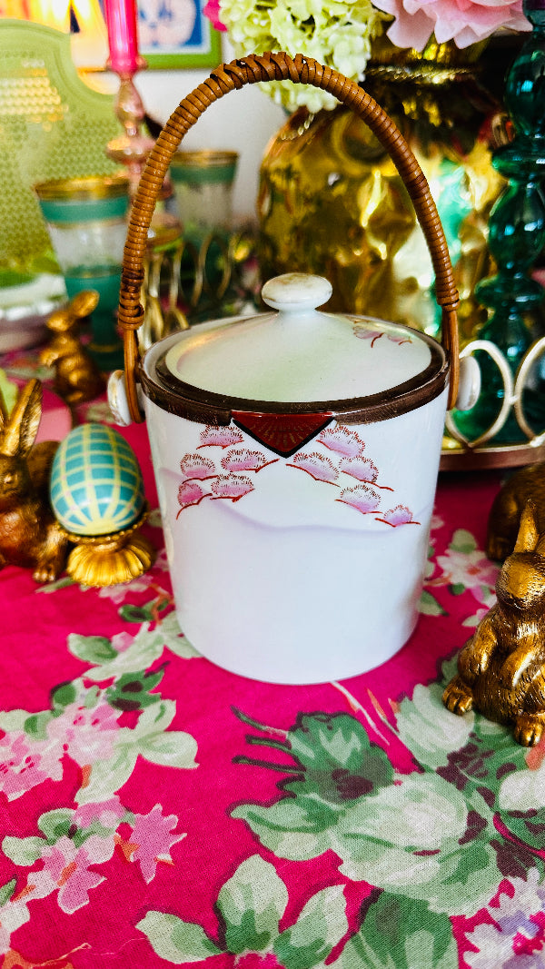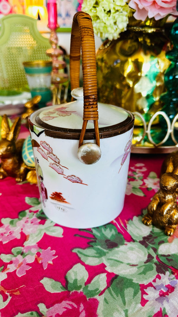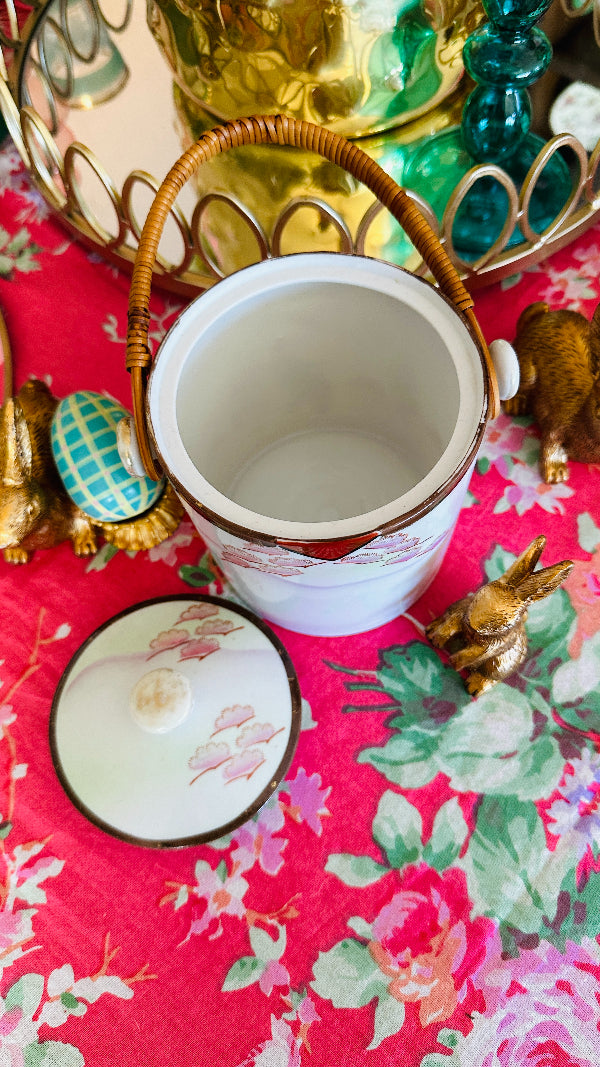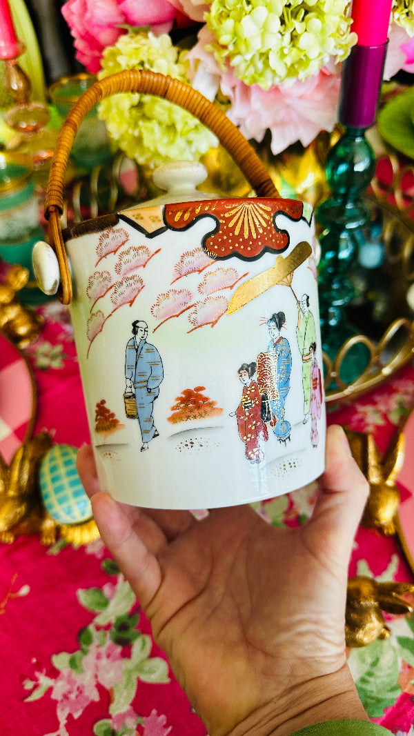 Vintage Biscuit Jar, Japanese Porcelain Basket Weave Handle, Lidded, Slight Paint Loss