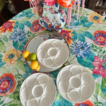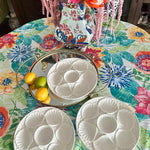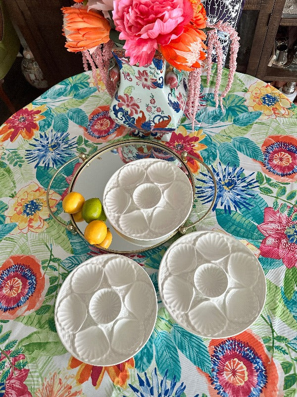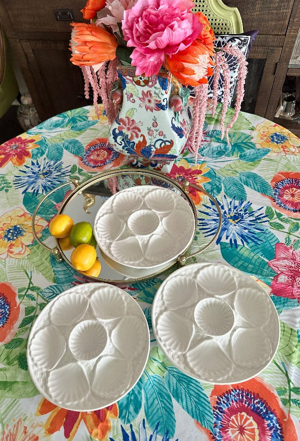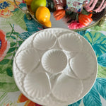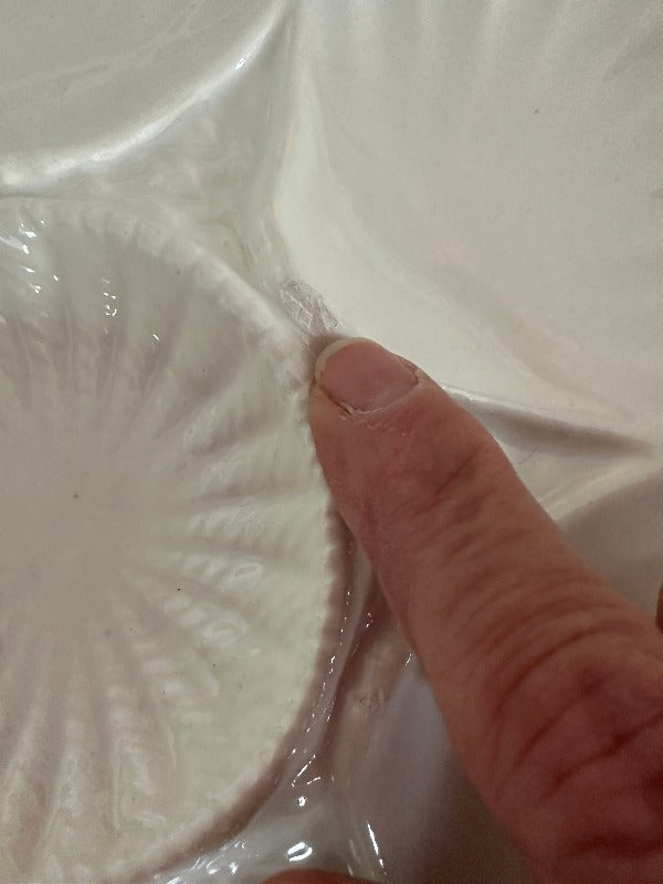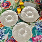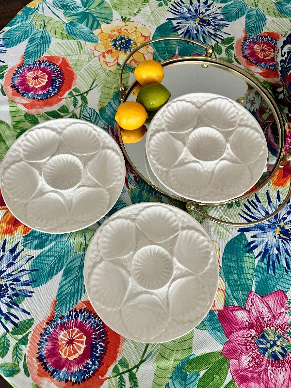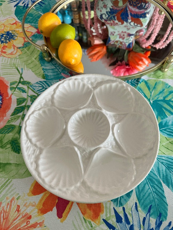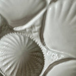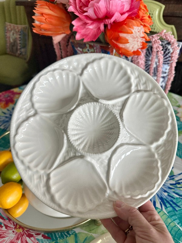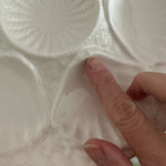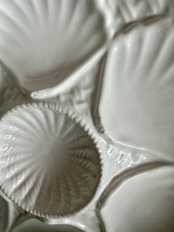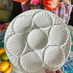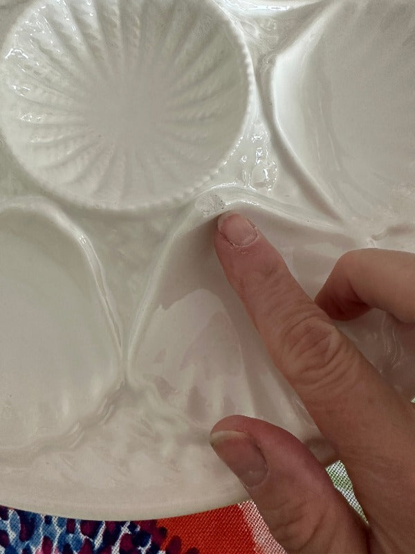 Serve oysters in style with these beautiful porcelain plates. Mixes well with any table setting with the pure white coloring. 5 wells around the edge and one in the middle. Sold as a set. 2 of the plates have a microchip but they are barely visible and does not take away from the function or form. The price is reflected with the imperfections. Display on a shelf, in a china cabinet or on a plate wall.