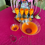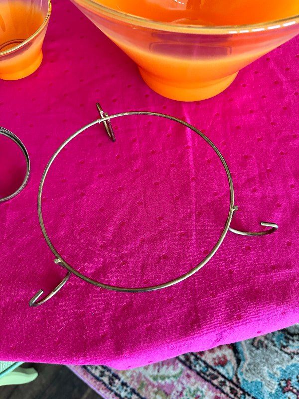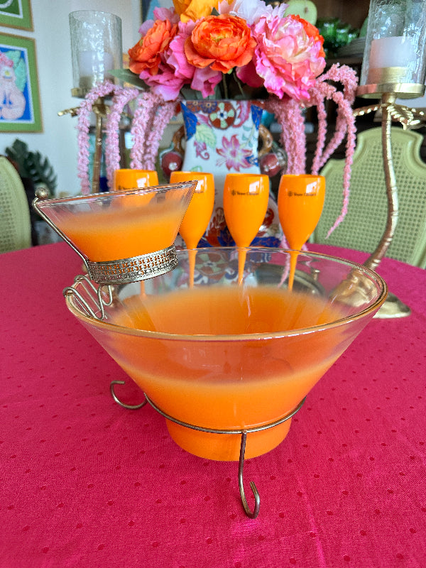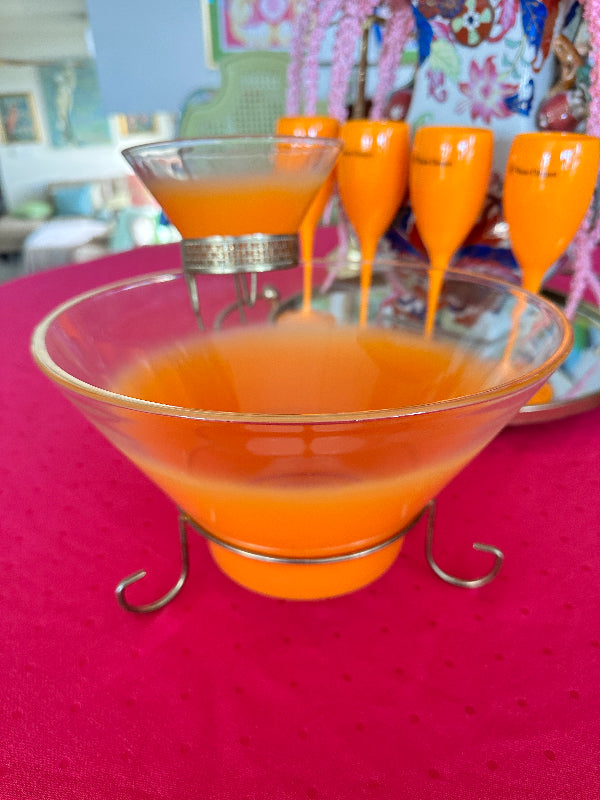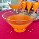 Impress your guests with this bold and bright chip and dip bowl set. Mid Century Modern is all the rage and you will be right on trend. Serve your favorite guacamole, salsa or queso with tortilla chips for a Mexican night. Add fruit and a yogurt dip for a refreshing snack. Amazing condition. Comes with a metal stand and a metal attachment for the dip bowl.