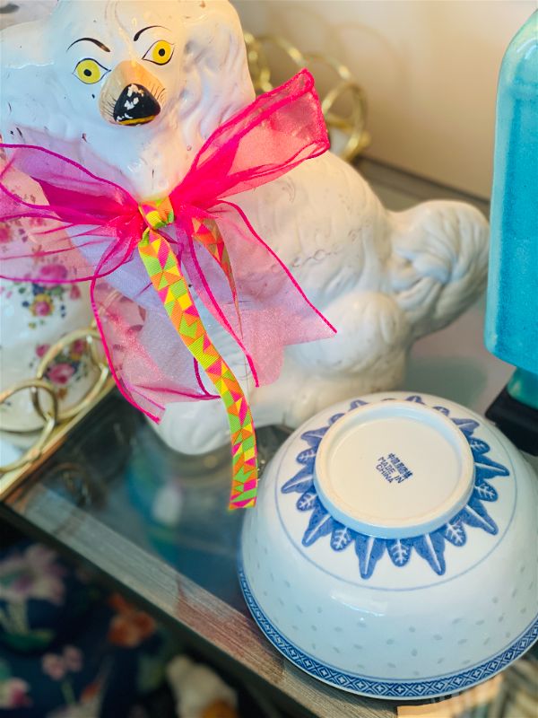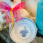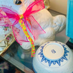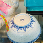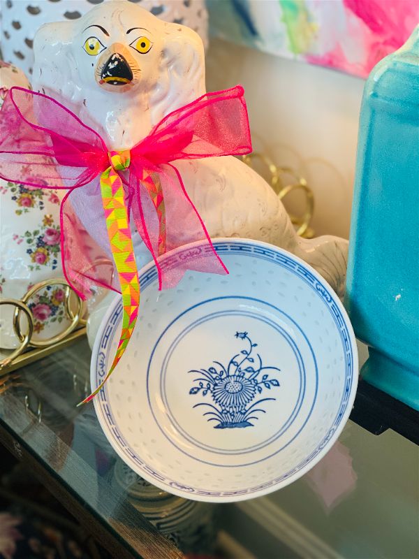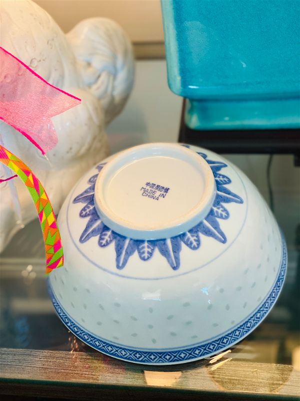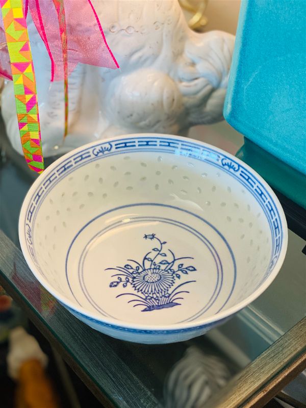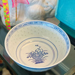 This popular pattern has "dots" or "pieces of rice" in the porcelain, an accented rim, and a sunflower floral center. It is the perfect size to serve side dishes or to add as an accent with fillers, like ornaments, carpet balls, or Easter eggs. This blue and white bowl is in excellent vintage condition, no chips or cracks.
