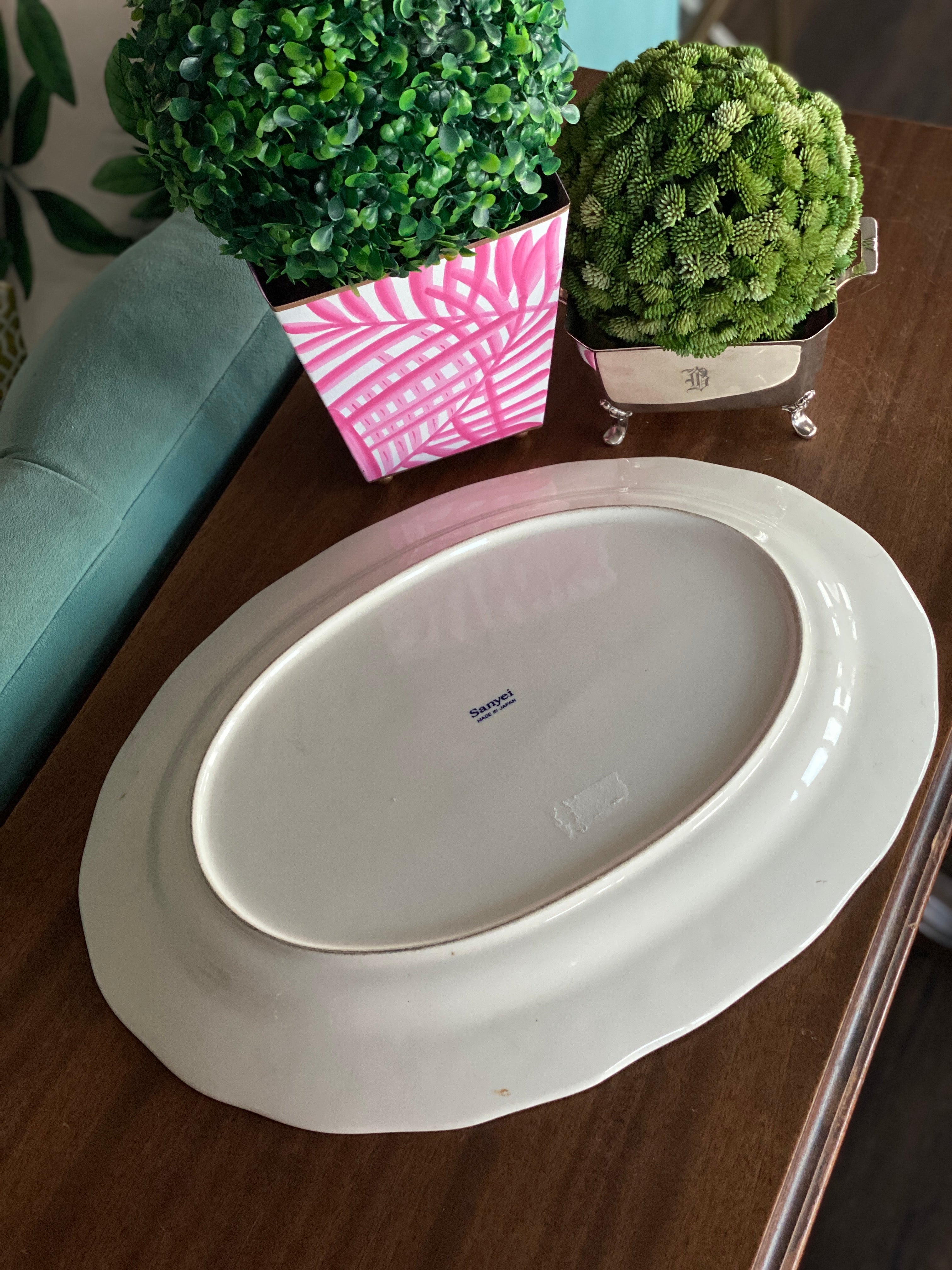 This gorgeous Chinoiserie blue and white platter is extra large perfect for your holiday turkey, ham ir roast. A sweet Wintry scene makes it perfect for the season. Stamped on the bottom. Made in Japan. Pristine vintage condition no chips or cracks. See picture details as they are part of the description.