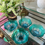 These aqua colored glass bowls are just stunning! They have a scalloped edge and a shell design on the bottom. Perfect for a side dish, dessert, pudding, yogurt, cereal or a small salad. These make a great display in your china cabinet or shelf. Pristine condition!