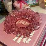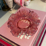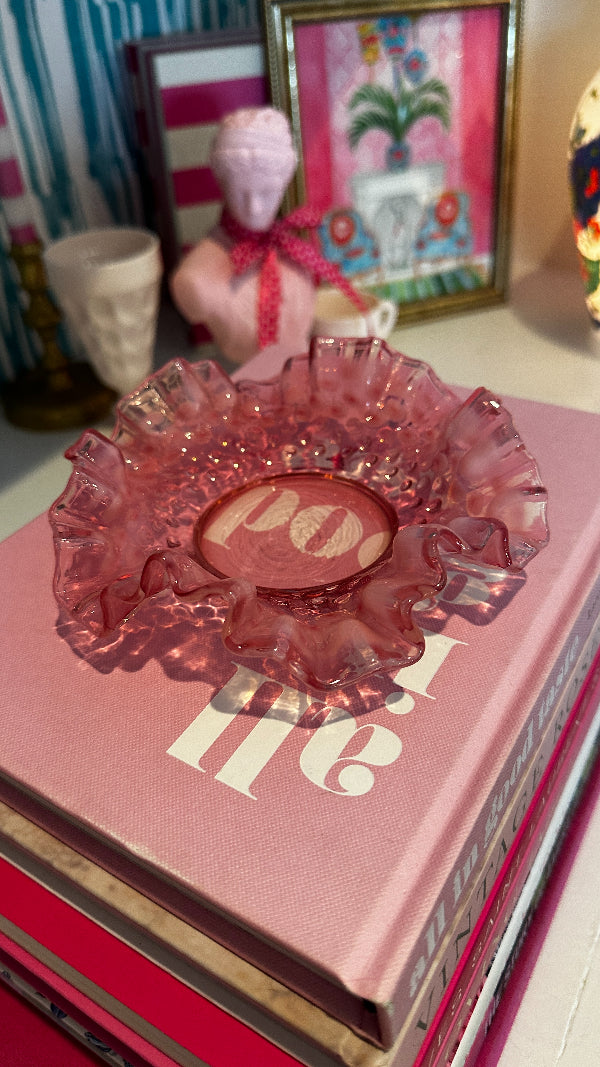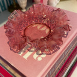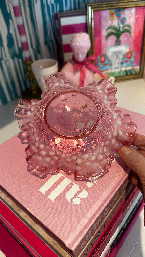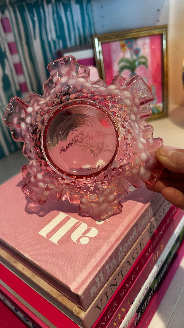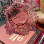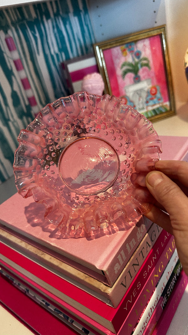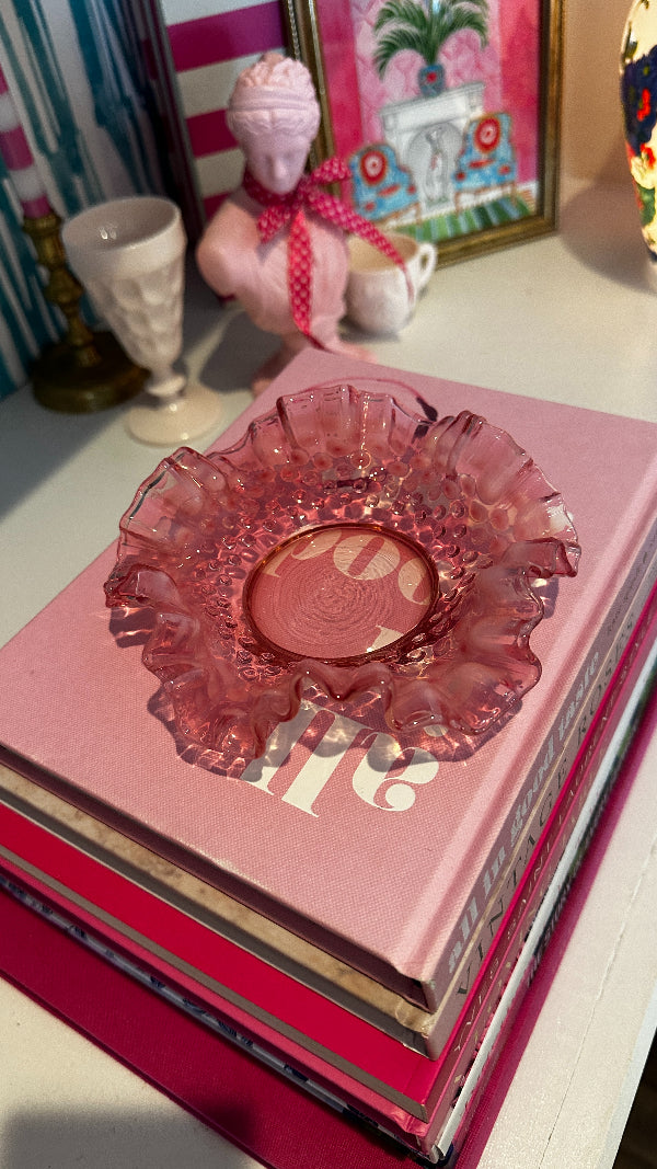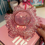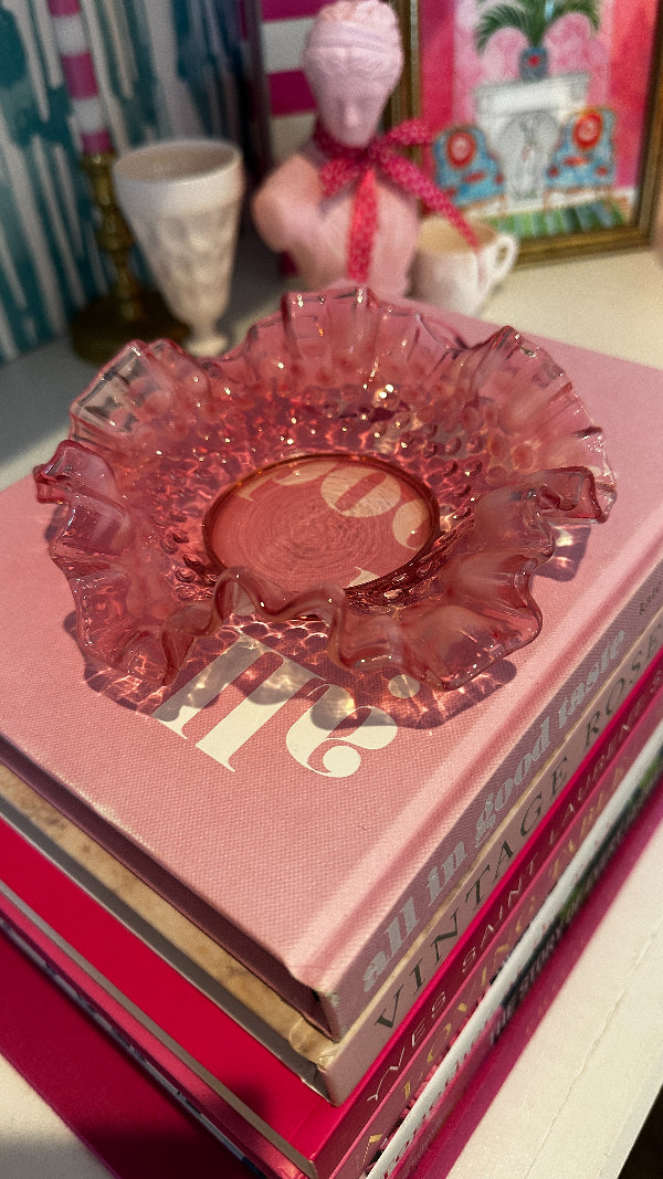 Vintage Fenton Hobnail Glass Bowl, a stunning piece in cranberry with a distinctive ruffled edge. This exquisite bowl showcases the timeless craftsmanship of Fenton, renowned for its artistry in glassware. The hobnail texture adds a touch of vintage charm, creating a visually captivating piece that stands out in any setting. Whether used as a decorative accent or for storing small items like desk supplies or jewelry, this cranberry glass bowl with a ruffled edge is a testament to both form and function.