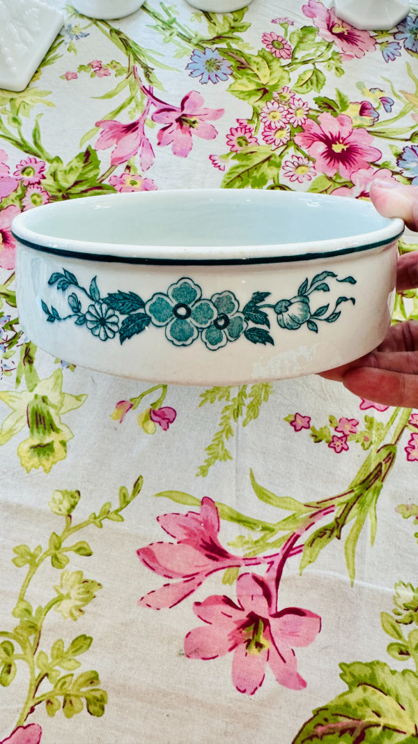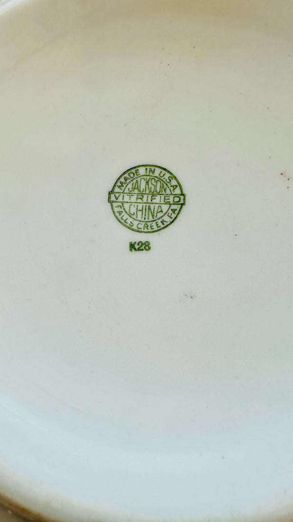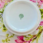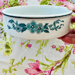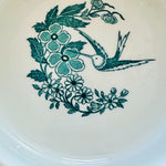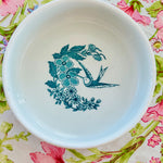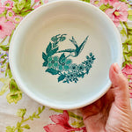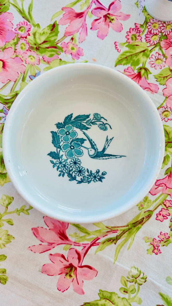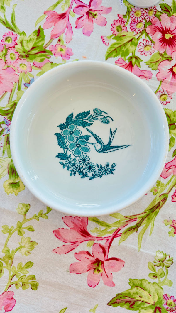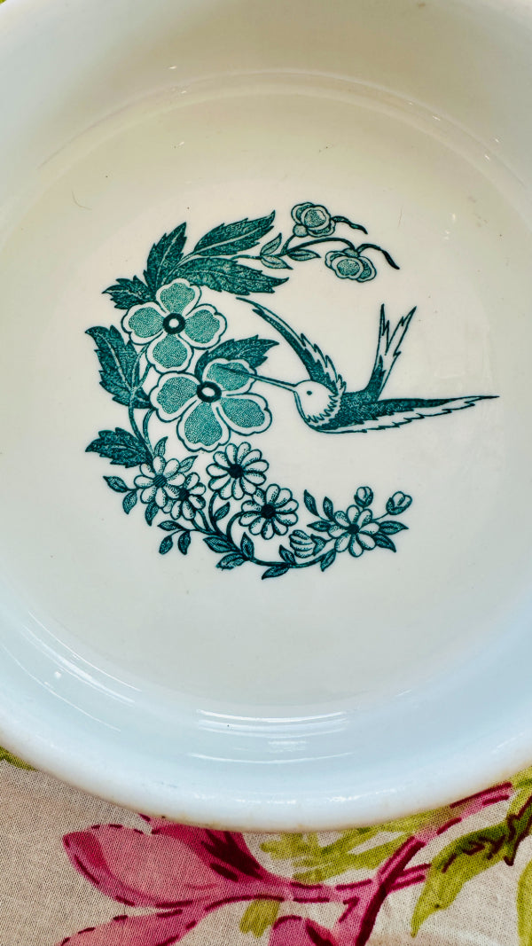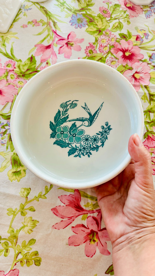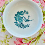 This vintage vitrified Jackson dog bowl features a charming hummingbird and floral design. Durable and beautifully detailed with a white foundation and teal green design, it blends function with artistry, making it a standout piece. A rare find that showcases both quality craftsmanship and timeless style.
