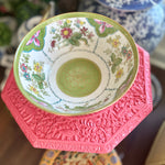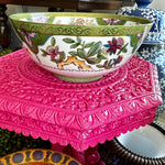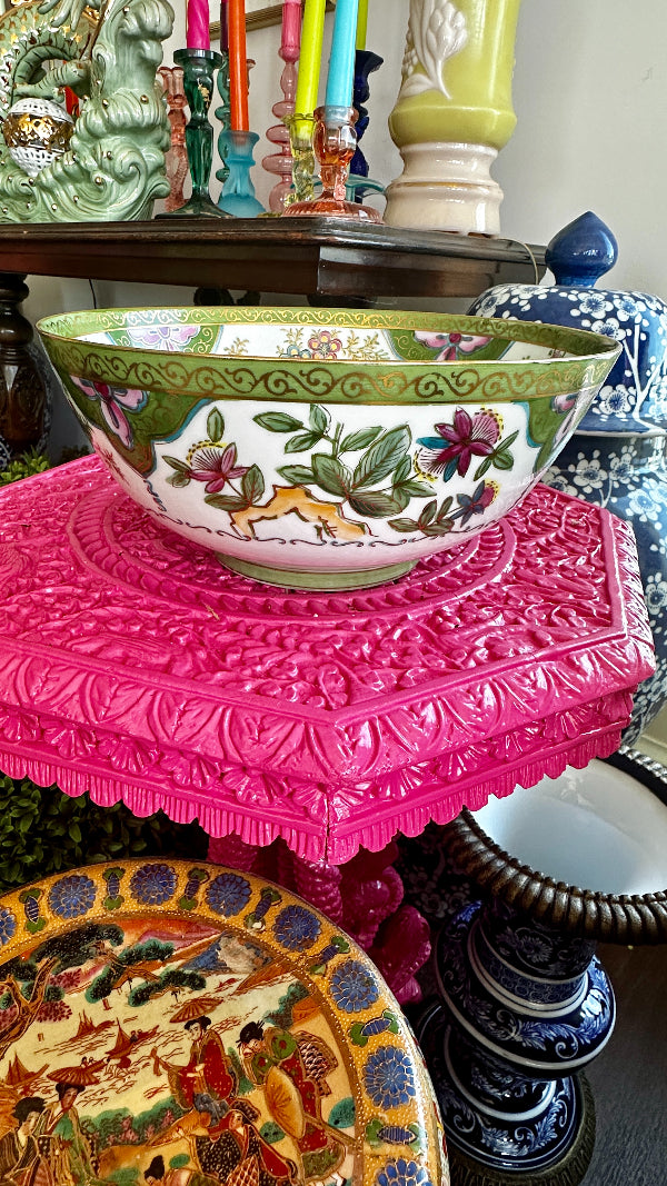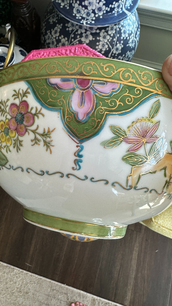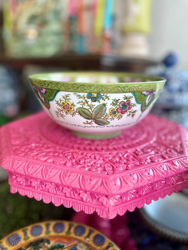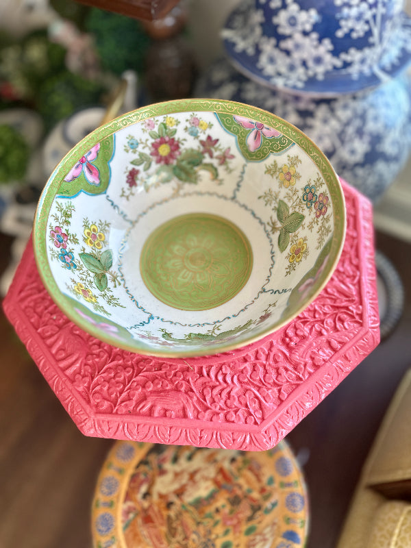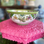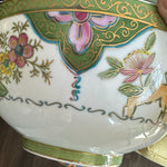 Introduce elegance to your tableware with our Vintage Japanese Bowl. This hand-painted bowl features a delicate green and white floral design, showcasing the refined artistry of Japanese craftsmanship. Perfect for serving or display. Add a beautiful orchid surrounded by moss. This exquisite piece adds a touch of timeless beauty and sophistication to any collection.