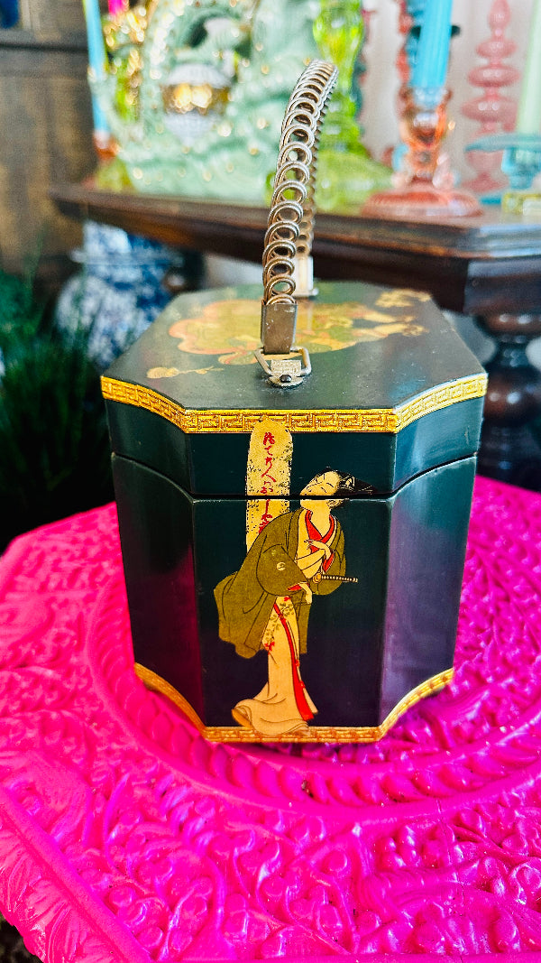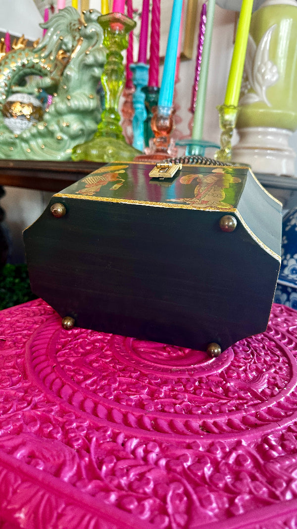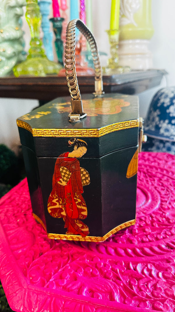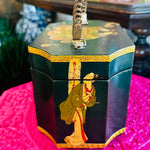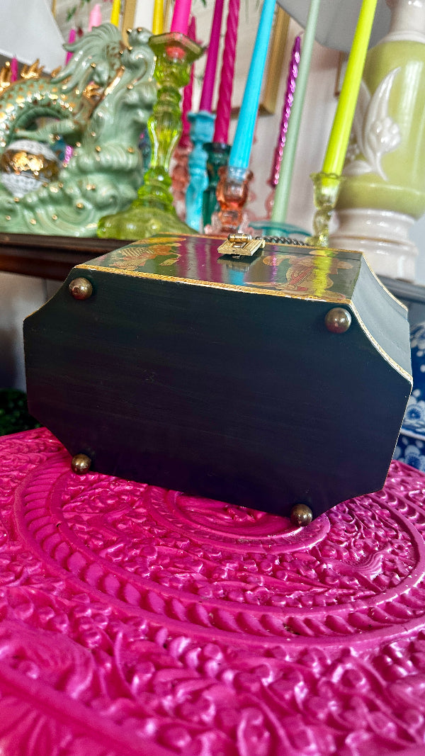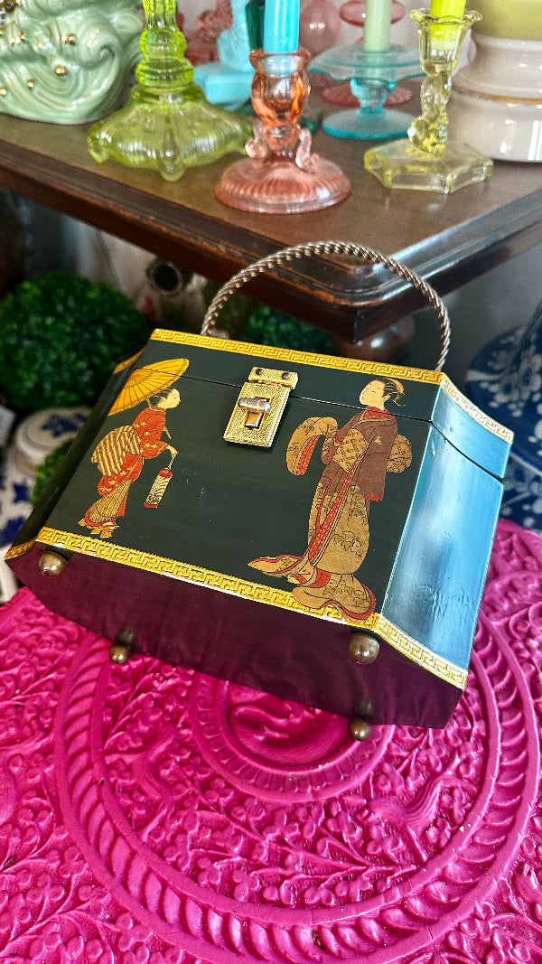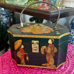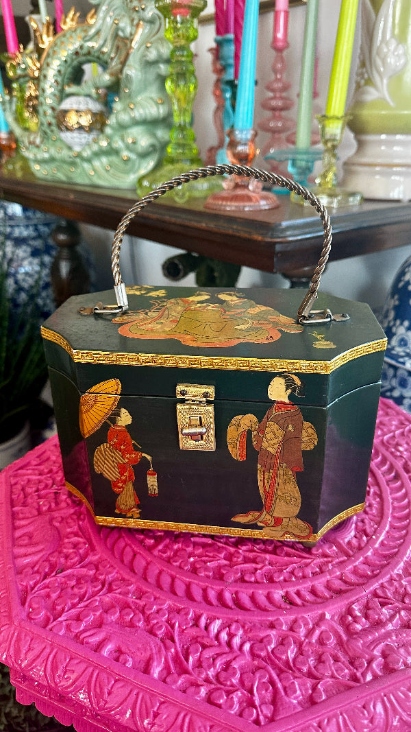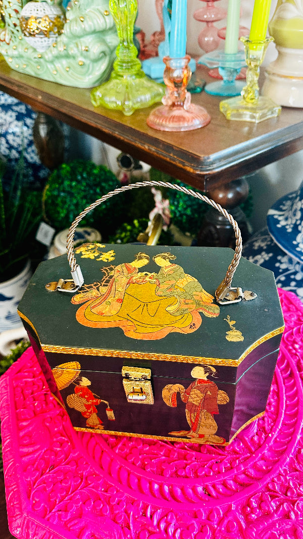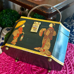 This Vintage Box Purse with an Asian motif is a stylish and elegant accessory, featuring intricate detailing and a built-in mirror inside the beautifully lined interior. Its structured design adds sophistication, making it a standout piece for collectors or those looking to add a unique touch to their wardrobe.Greek key gold detail along the bottom has very slight wear. Figural details and a metal handle that is slightly worn. Perfect for vintage and fashion enthusiasts alike!
