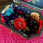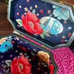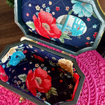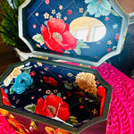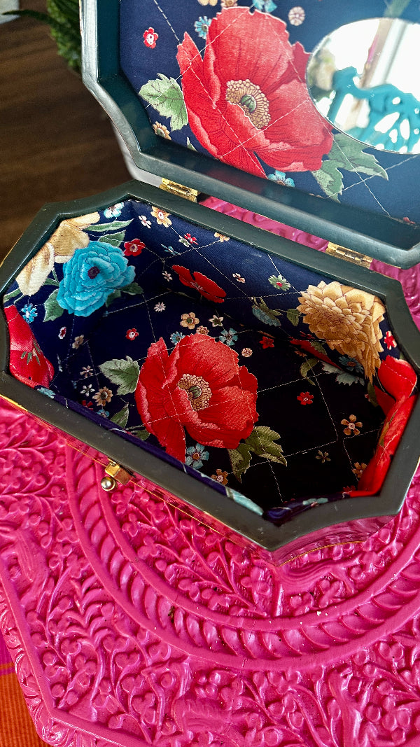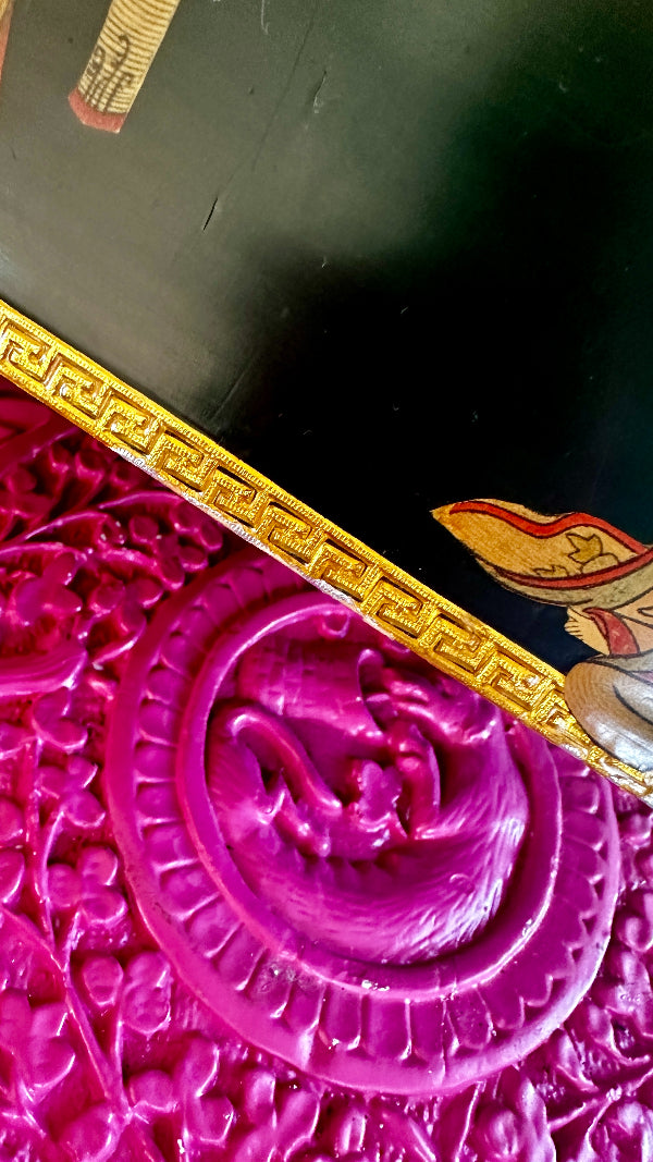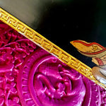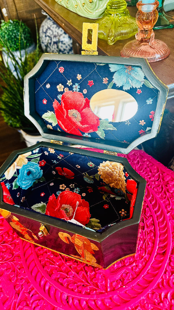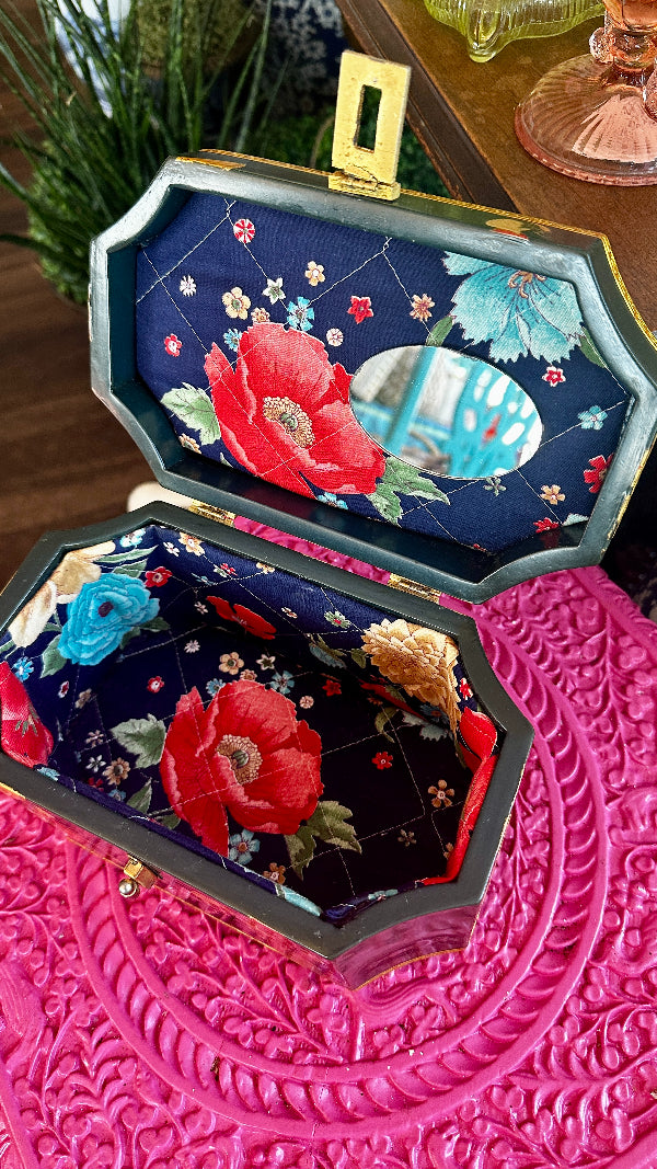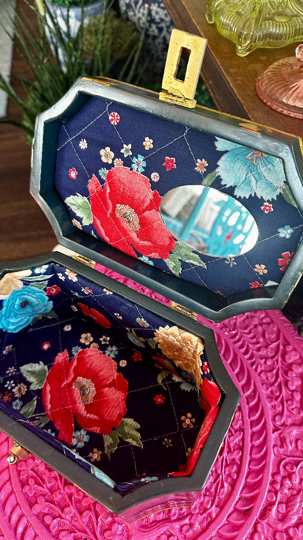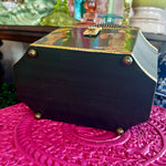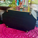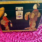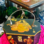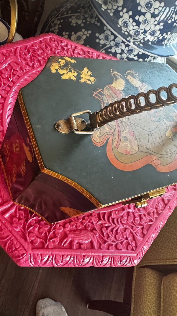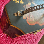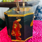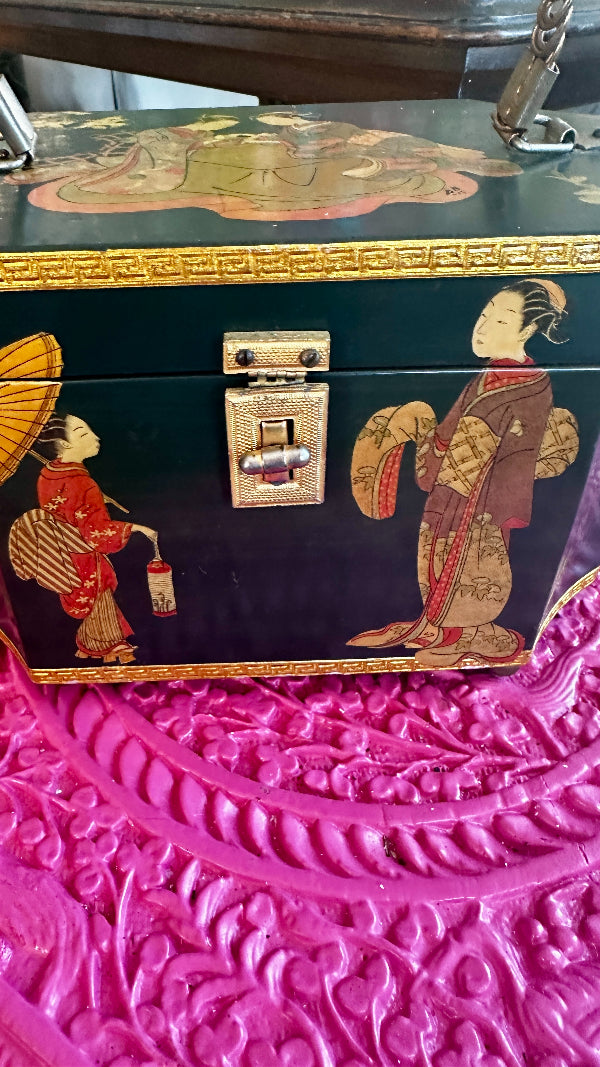 This Vintage Box Purse with an Asian motif is a stylish and elegant accessory, featuring intricate detailing and a built-in mirror inside the beautifully lined interior. Its structured design adds sophistication, making it a standout piece for collectors or those looking to add a unique touch to their wardrobe.Greek key gold detail along the bottom has very slight wear. Figural details and a metal handle that is slightly worn. Perfect for vintage and fashion enthusiasts alike!