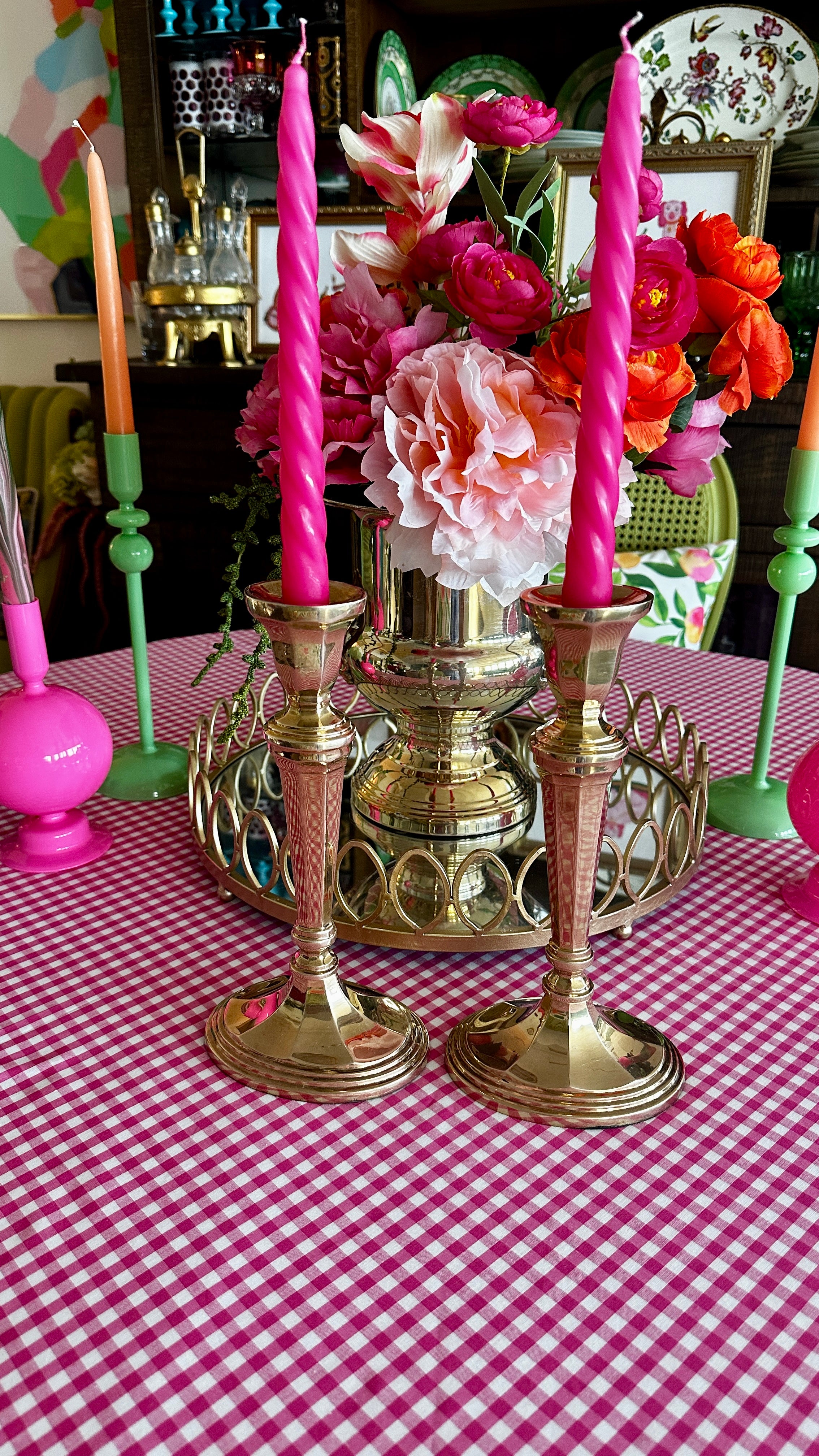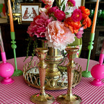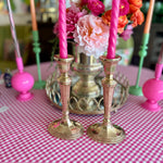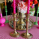 Elevate your decor with these Vintage Brass Candle Holders, sold as a charming pair with oval bases. These exquisite pieces add a touch of timeless beauty to any setting, crafted with intricate detailing and a classic design aesthetic. Perfect for creating an ambient atmosphere in your home or as a thoughtful gift for candle enthusiasts. Embrace the elegance and craftsmanship of vintage brass, ideal for enhancing both modern and traditional interiors with their understated sophistication.