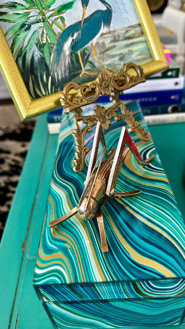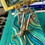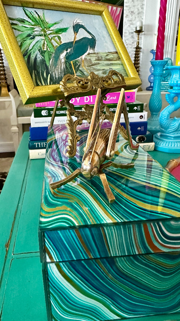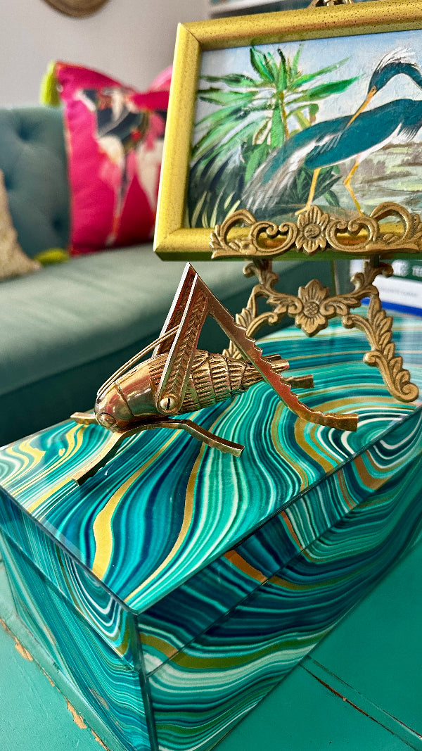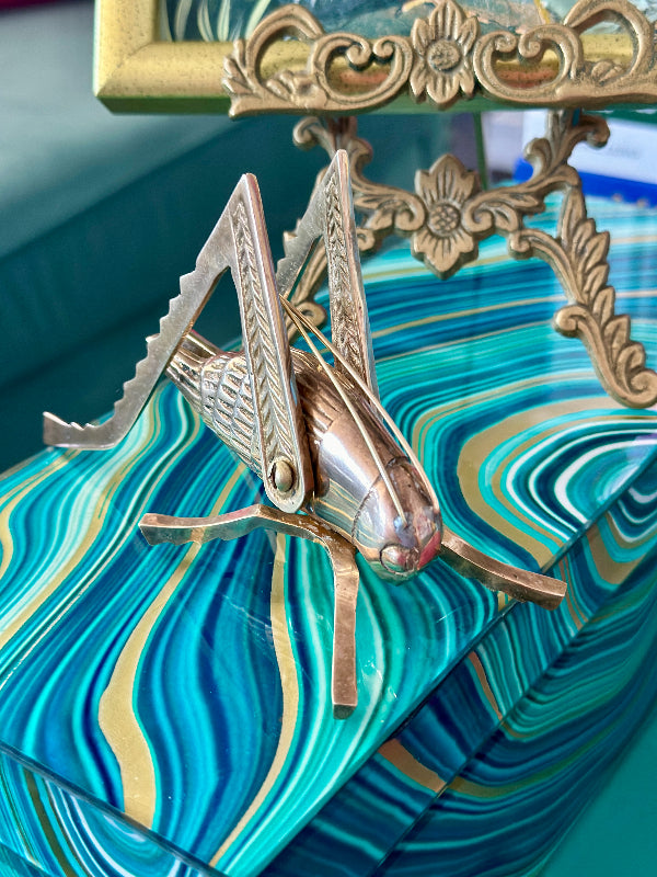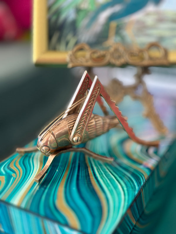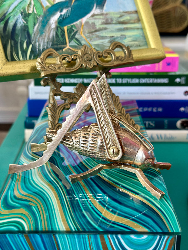 Our charming Vintage Brass Cricket, a delightful addition to any collection or décor. This intricately crafted piece captures the whimsical spirit of a cricket, showcasing fine detailing and a polished brass finish. Perfect as a unique decorative accent, a thoughtful gift, or a conversation starter, this vintage brass cricket brings a touch of nostalgia and elegance to any space.
