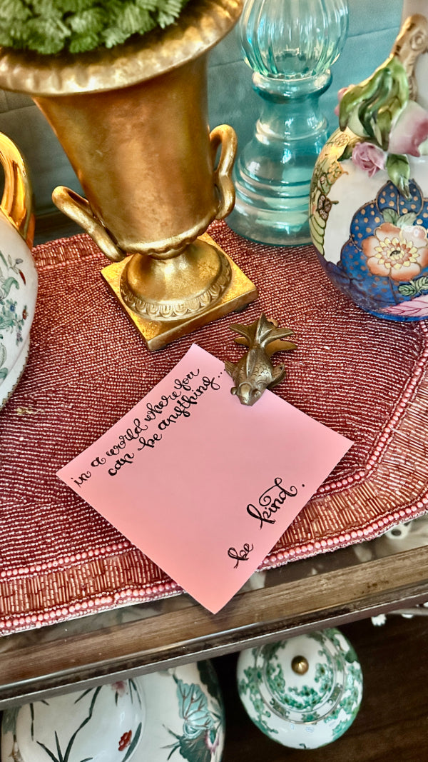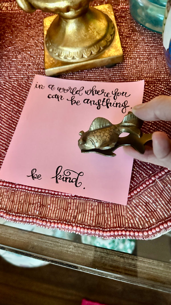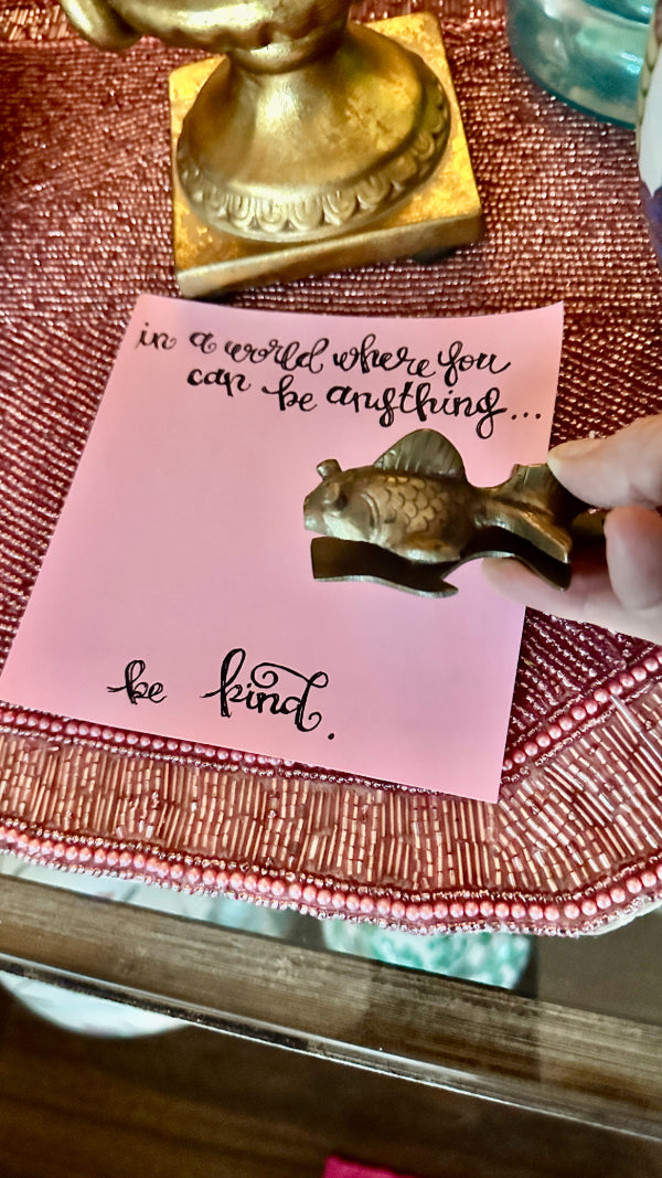 This Vintage Brass Fish Clip is a charming and functional accent, crafted in solid brass with detailed fish-form styling and a warm, aged patina. Designed as a decorative clip, it can be used to hold notes, papers, or photographs, or displayed as a small sculptural object. Its whimsical design and quality craftsmanship make it a delightful addition to a desk, shelf, or curated vintage collection.