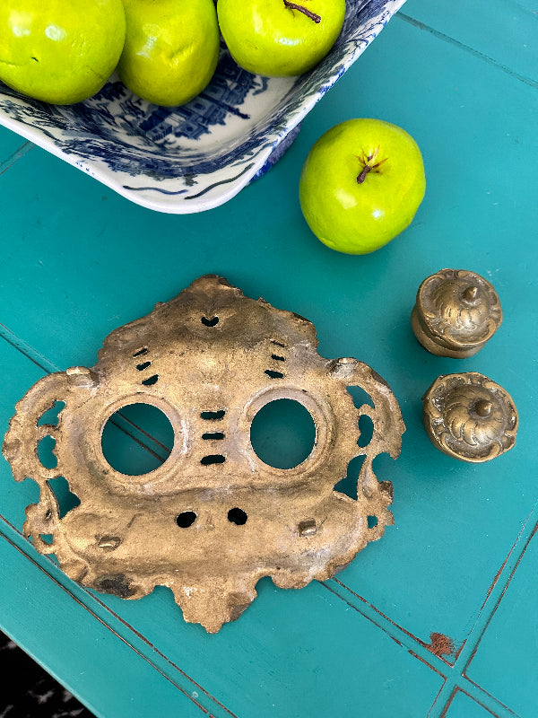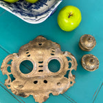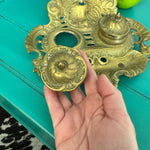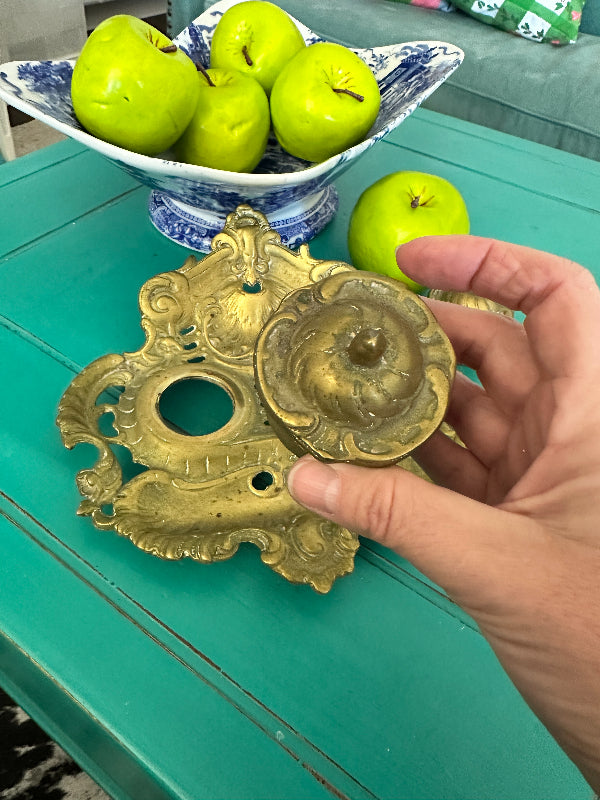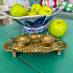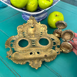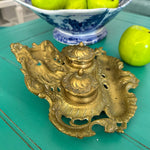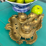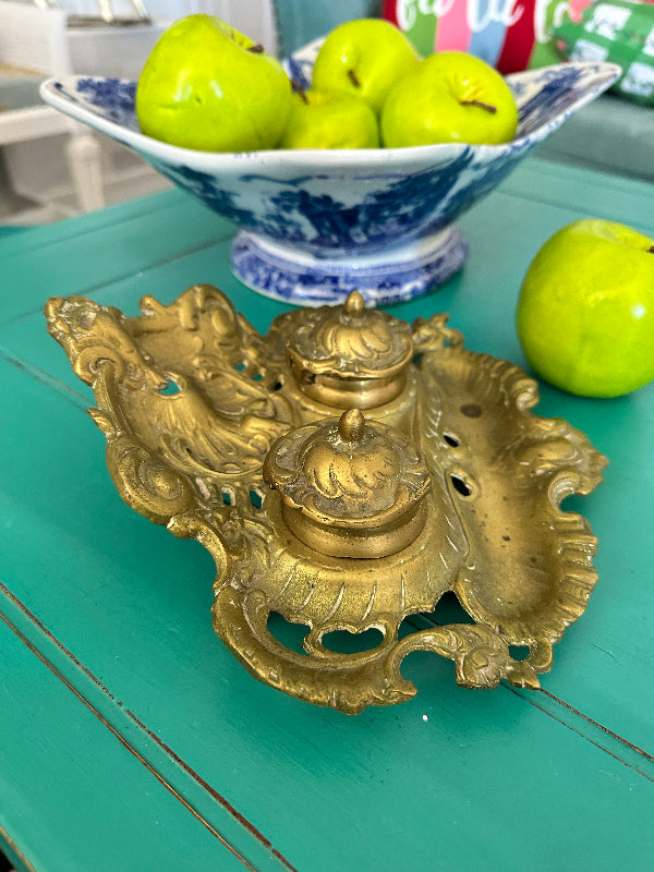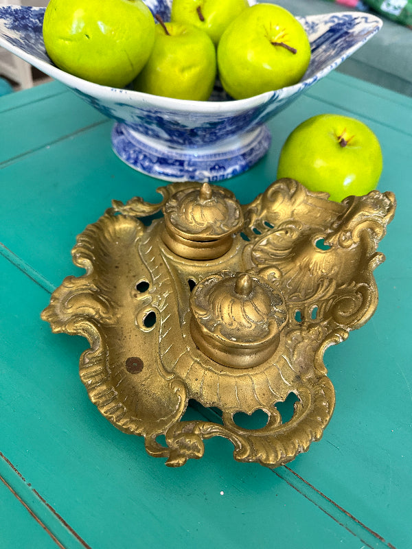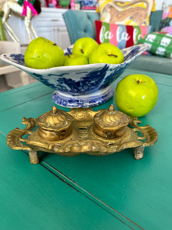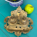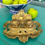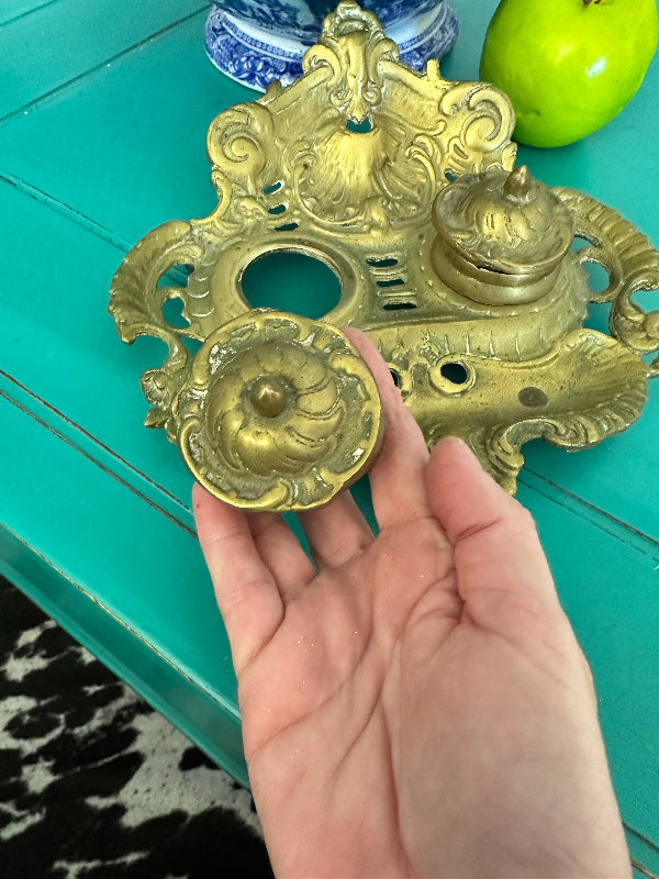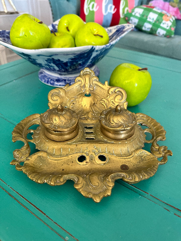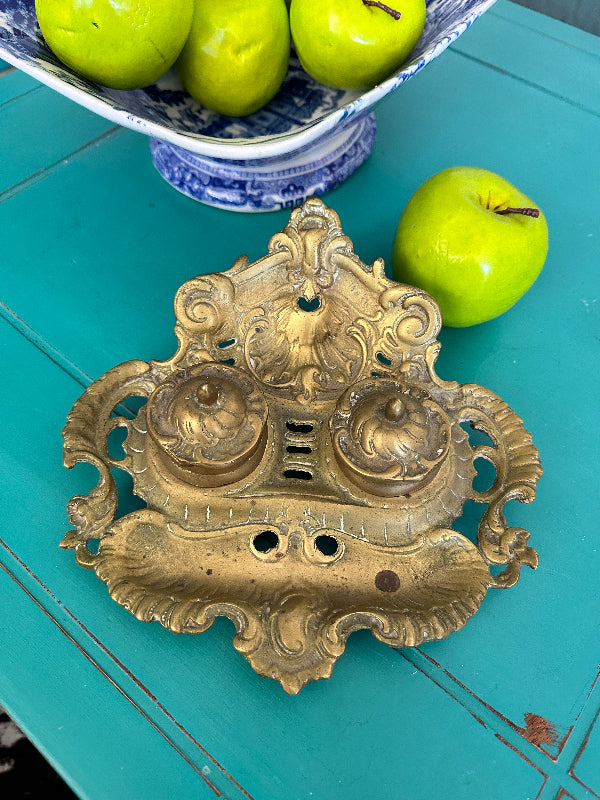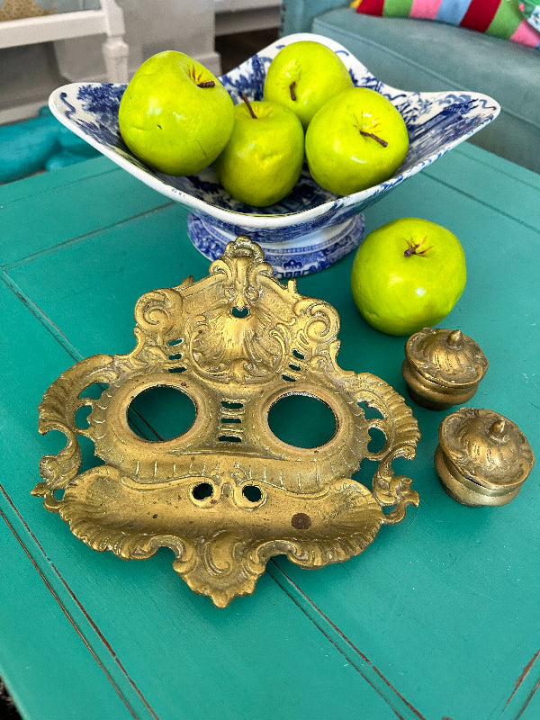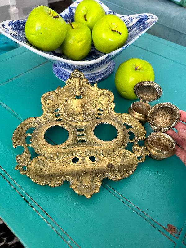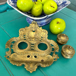 This gorgeous inkwell, made of brass, has an ornate victorian design. The inkwells themselves are hinged and can be removed for easy cleaning. There is a tray slot that held the pen or "quill". This is an impressive piece. Great to add to a collection, display on a desk or give as a gift with customized stationary. Great vintage condition. This is the unpolished look but can be polished for a lovely shine. Collectors often like items in their unpolished state.