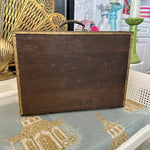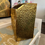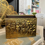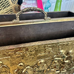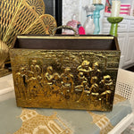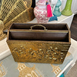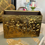 This amazing magazine box has a detailed brass scene of peasants dancing on the front. Hammer brass is on each side with an exposed wood back. The box is made of wood so it has some weight to it. The handle is a detailed brass design. Perfect for storing magazines, books or as a pretty piece to display. Great vintage condition.