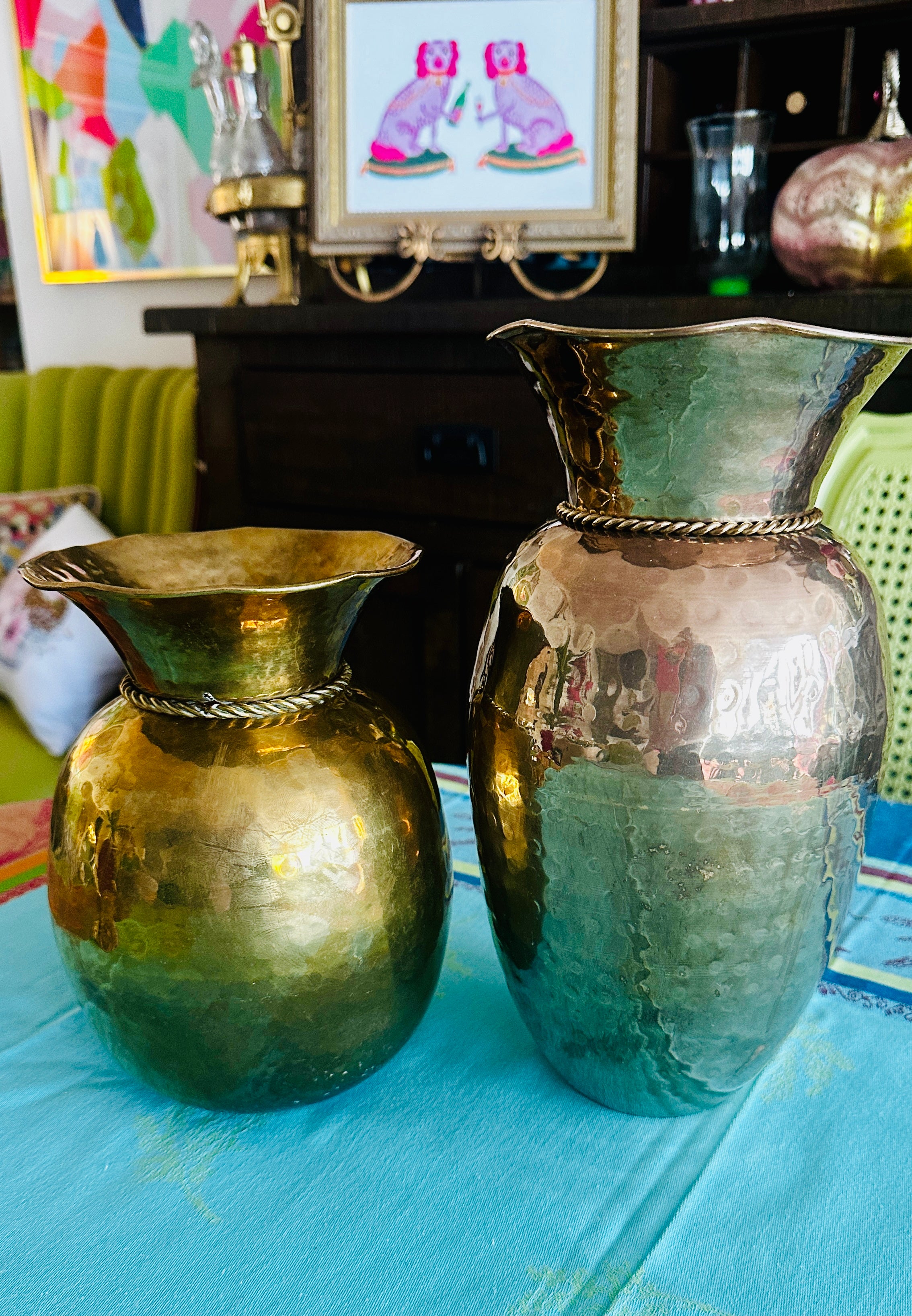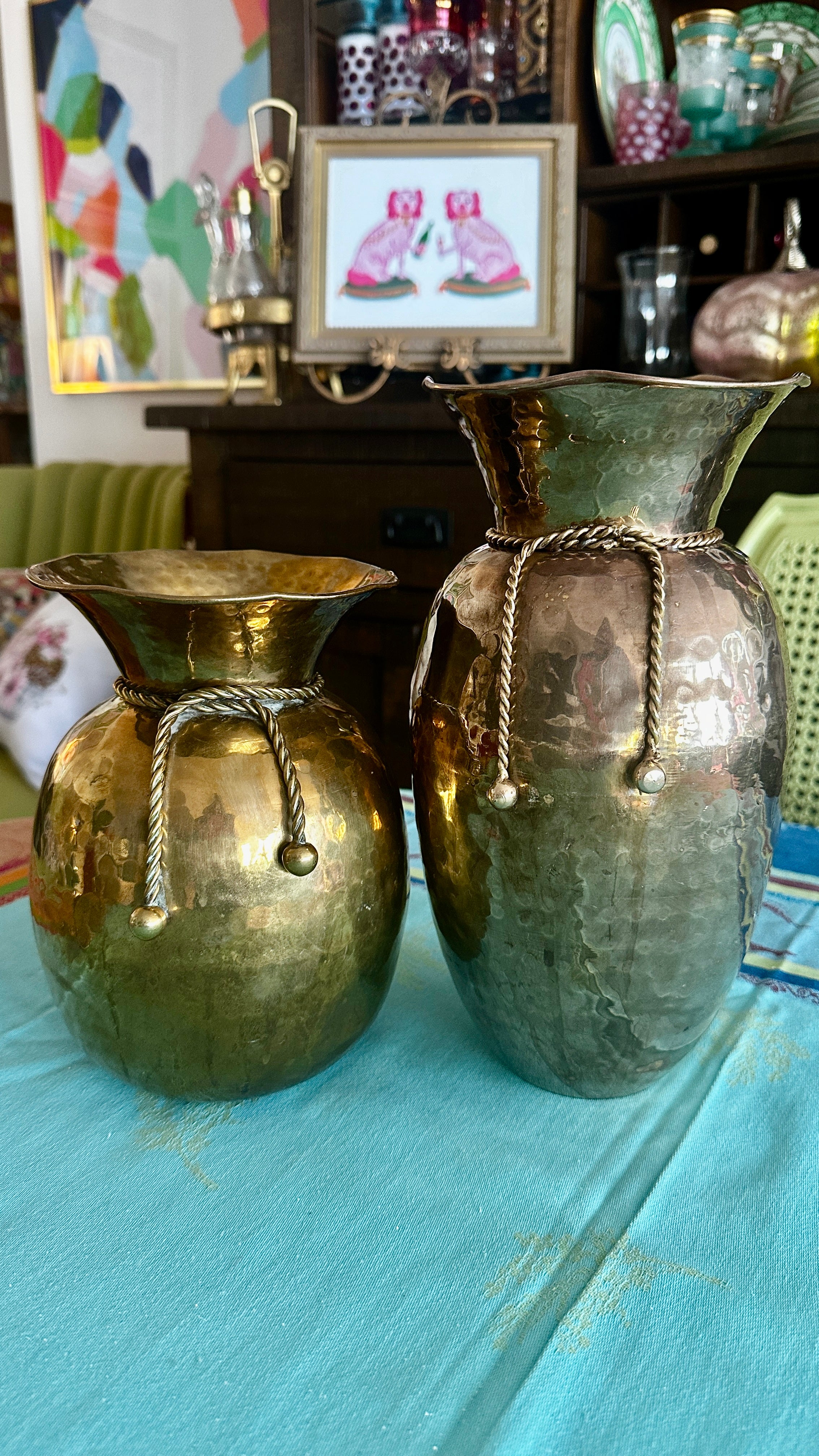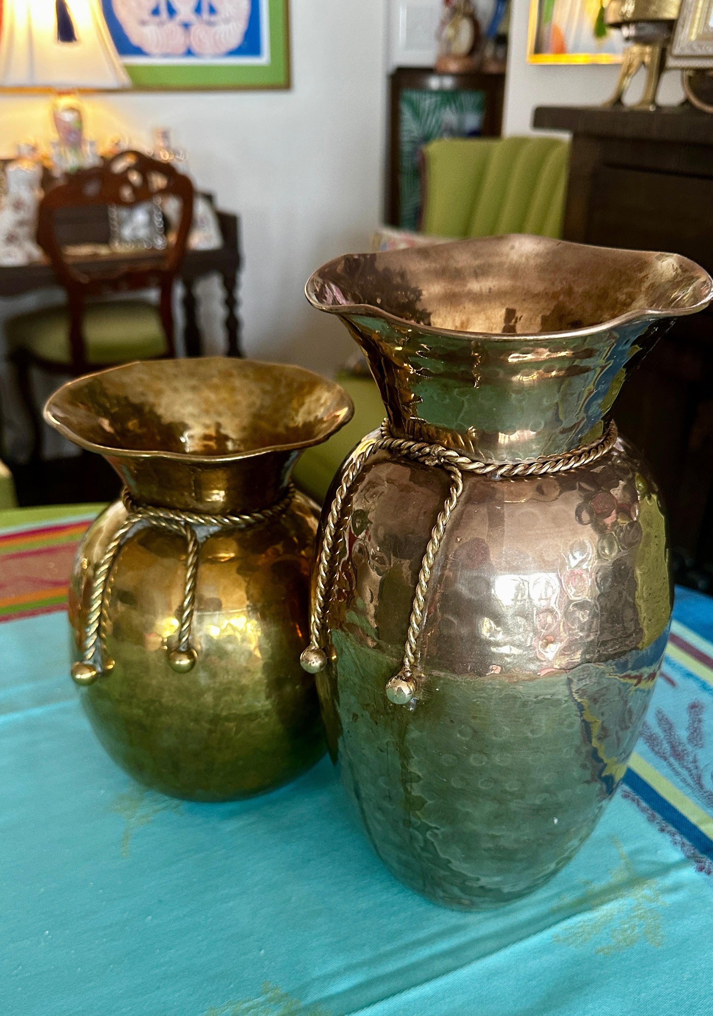 Add a touch of historical charm with these vintage brass spittoons, available in two styles: a short, solid brass spittoon with intricate rope detailing, and a taller spittoon featuring brass over copper with refined rope accents.Thes make perfect vases for your fresh cut flowers! Each piece combines timeless design and sturdy craftsmanship, making them perfect for collectors or as unique decor accents.